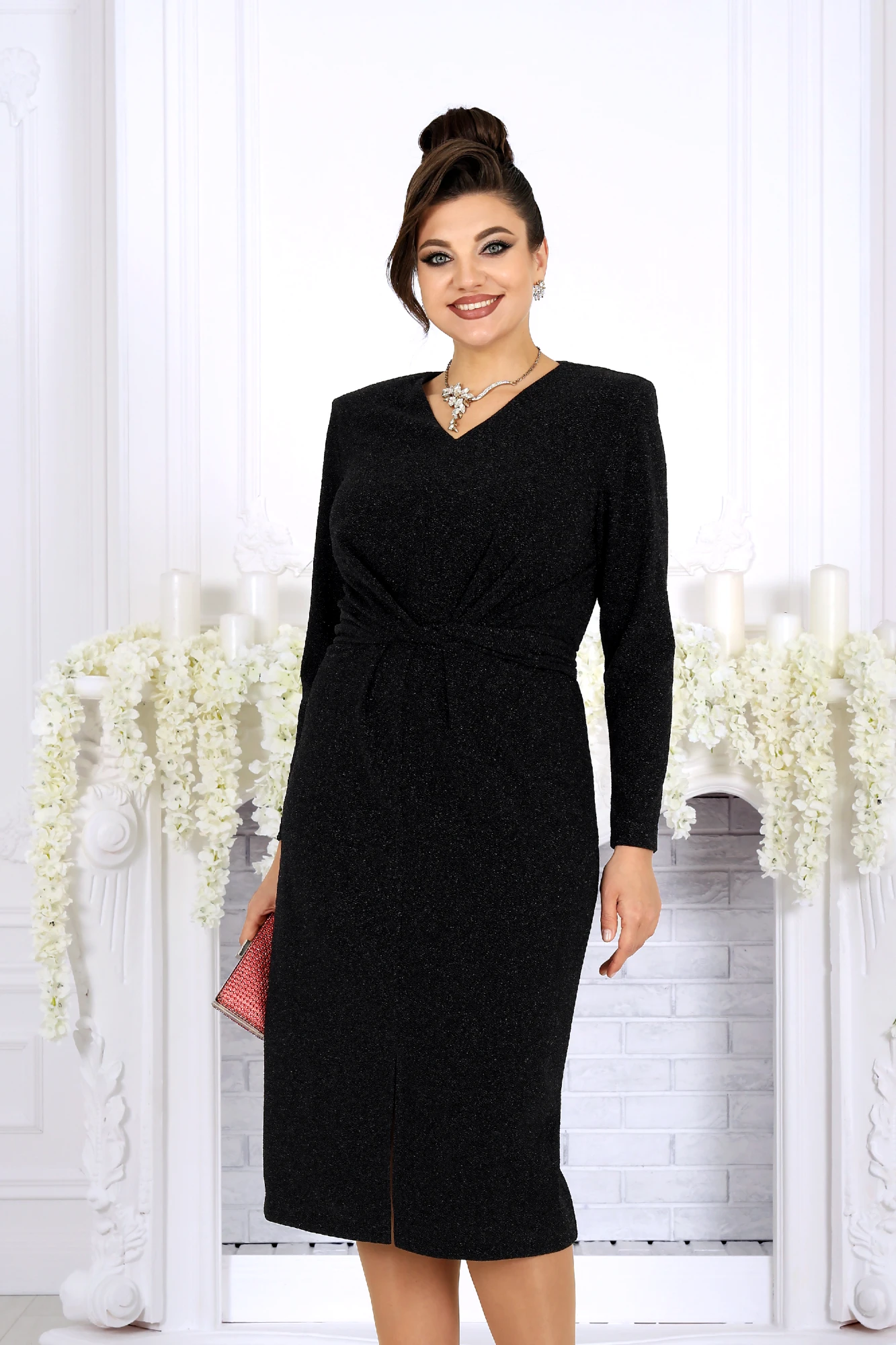 Это не просто вечернее платье — это уверенный образ, который подчеркивает статус, не требуя лишнего декора. Нежный блеск люрекса, мягкая фактура трикотажа и лаконичный, но выразительный силуэт создают эффектный, но одновременно сдержанный наряд для торжественных событий. Модель приталенного силуэта красиво обыгрывает талию: два длинных пояса, которые можно завязывать по-разному, превращают одно платье в множество вариантов — от строгого до более драматичного. Центральный разрез спереди добавляет движения, открывает шаг и придает образу лёгкость, не теряя изысканности. V‑образный вырез моделирует линию шеи, визуально удлиняет силуэт и идеально сочетается с украшениями. Длинный рукав делает платье уместным даже в прохладной обстановке, сохраняя гармонию и баланс между нарядностью и практичностью. Материал — трикотаж с фактурной лицевой стороной люрекс — отличается качеством и мягкостью, хорошо ложится по фигуре, подстраиваясь под формы, а подкладка обеспечивает комфорт. Благодаря продуманному крою, платье подходит для больших размеров и женщин с формами: подчёркивает достоинства, скрывает мелкие нюансы, делая силуэт стройным и элегантным. Идеально для: свадьбы, вечернего мероприятия, юбилея, корпоратива или любого торжественного выхода. Почему выбирают именно его: сияние без излишней пышности, продуманная посадка, универсальность и возможность легко менять стиль за счёт завязок. Надев это платье, вы получаете образ, который звучит дорого, выглядит современно и играет своей красотой при каждом шаге. Платье женское, приталенного силуэта, выполнено из трикотажного полотна с фактурной лицевой стороной «люрекс». Модель без застежки, на трикотажной подкладке, с плечевыми накладками. Перед платья с разрезом в среднем шве и горизонтальным подрезом по линии талии; лиф цельнокроеный с поясами, завязывая которые разными способами, можно изменять внешний вид модели. На спинке обработаны талиевые вытачки. Горловина V-образной формы спереди и округлой по спинке. Рукав втачной, длинный.