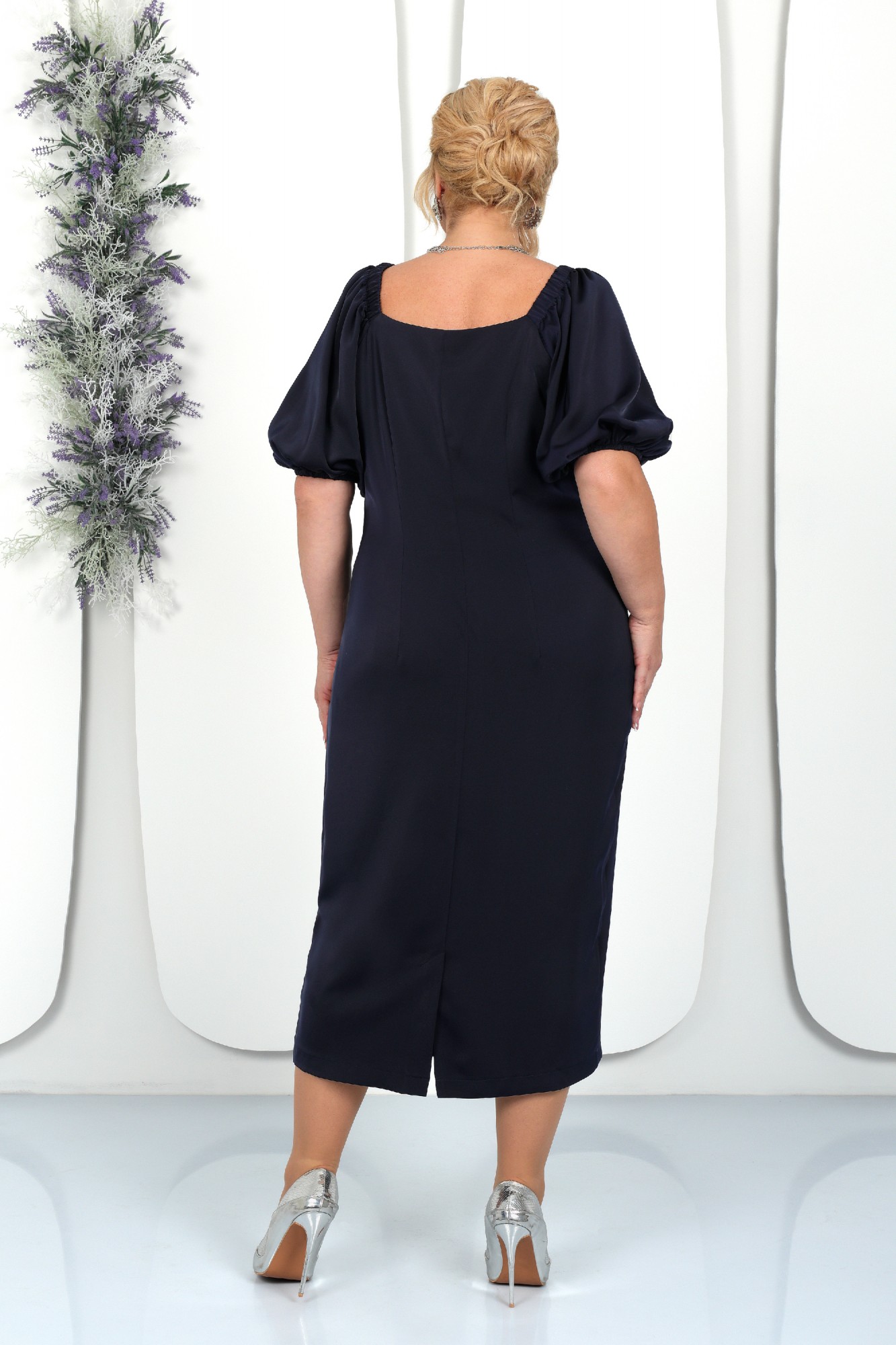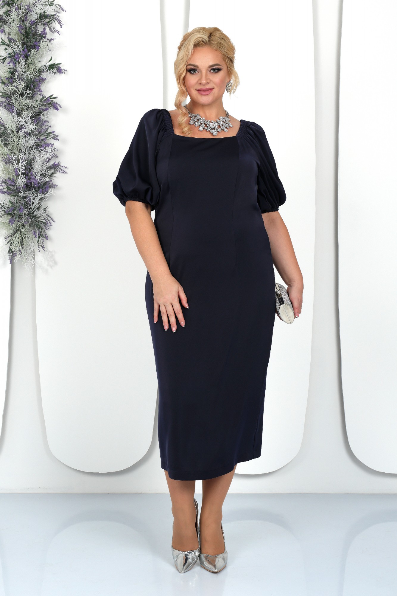 Платье женское, полуприлегающего силуэта, из плательной ткани «сатин», перед и спинка на трикотажной подкладке. Длина платья по среднему шву спинки 118 см. Перед платья с полурельефными швами, проходящими через центр груди и идущими от горловины вниз. Спинка платья с талиевыми вытачками, со средним швом в верхней части которого расположена застежка на потайную тесьму-«молнию», в нижней части – шлица. Горловина спинки округлая, углубленная, горловина переда-«каре». Рукава втачные, одношовные, со сборкой по окату, по низу собранные на резинку. Длина рукавов 35 см.