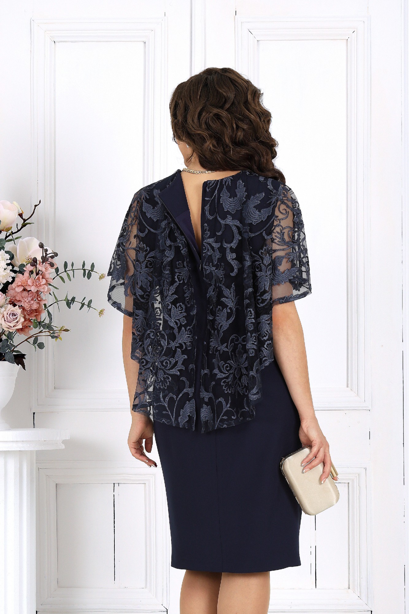 Роскошное платье, которое создано, чтобы восхищать! Эта модель — идеальный выбор для торжественных событий, где хочется выглядеть безупречно, женственно и дорого. Платье подчёркивает достоинства фигуры, мягко скрывая нюансы, и дарит то самое ощущение уверенности, когда вы входите в зал и на вас обращают внимание. Нежное, элегантное, по-настоящему роскошное — вы будете выглядеть именно так, как мечтаете. Платье женское, полуприлегающего силуэта, выполнено из костюмно-плательной ткани и гипюра. Модель на трикотажной подкладке, без рукавов и плечевых накладок. Перед отрезной по линии талии; на верхней части обработаны рельефы, направленные от пройм, на нижней – таллиевая вытачка и рельефный шов с разрезом внизу. Лиф переда декорирован надстрочной аппликацией. Спинка с таллиевыми вытачками и средним швом, в верхней части которого обработана застежка на потайную тесьму-«молнию» (50см). Вырез горловины спинки округлый, по переду – углубленный, V-образный. В шов обтачивания горловины входит пелерина из гипюра, разъемная по середине переда и спинки; низ пелерины асимметричный, укороченный спереди.