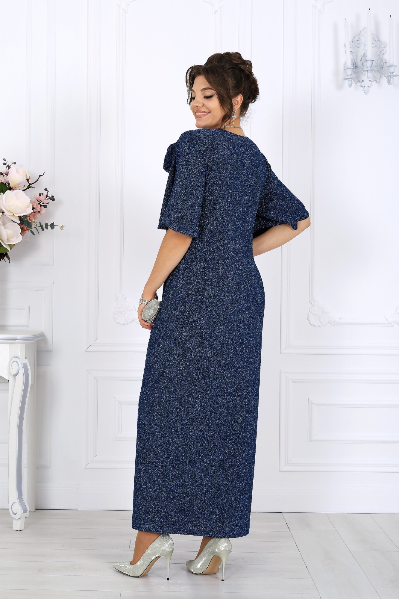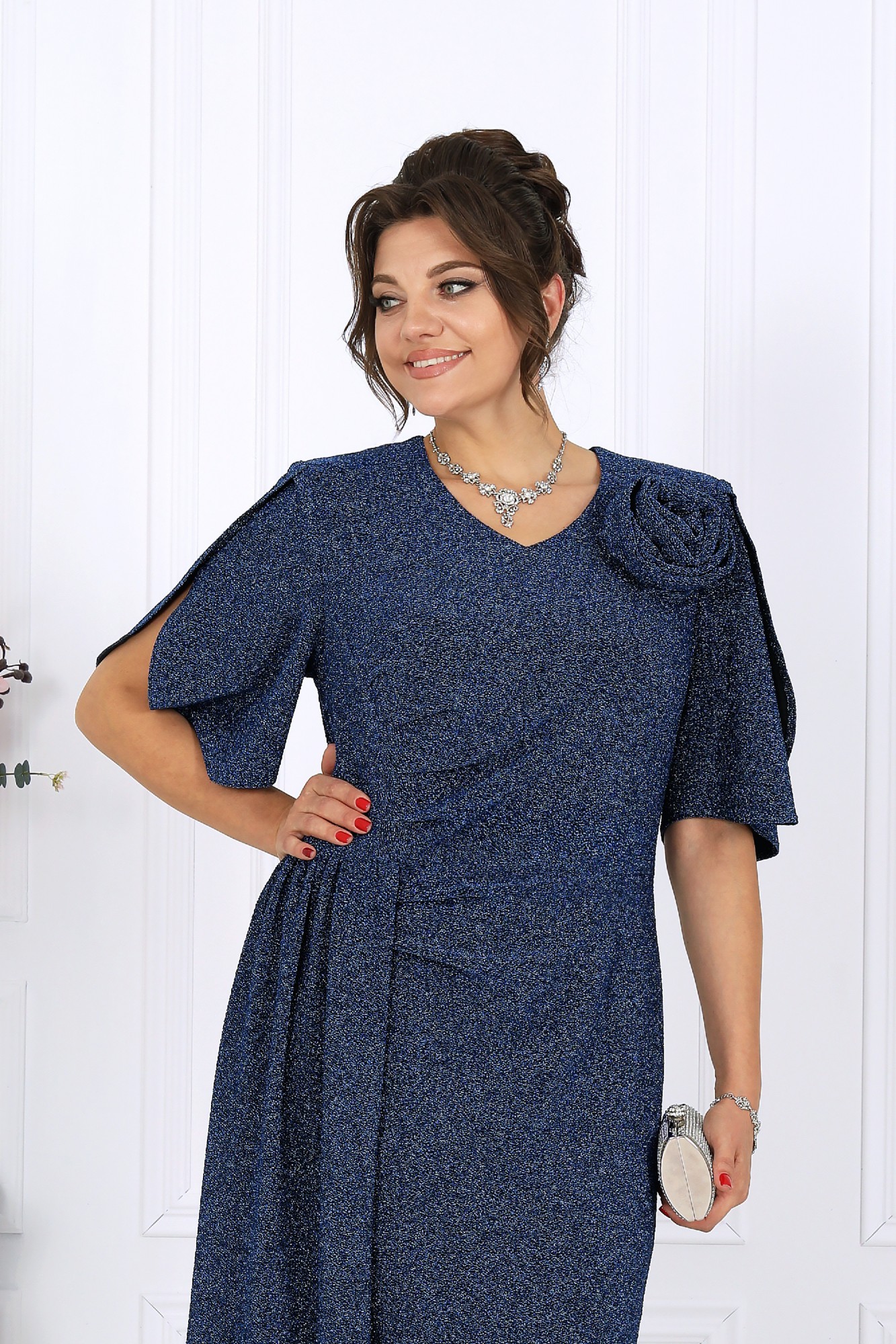 Платье, которое само по себе становится событием. Роскошное вечернее платье из мерцающего трикотажа с нитью люрекс создано, чтобы подчеркнуть женственность и элегантность в каждом движении. Оно притягивает взгляд, играя бликами при любом освещении — будь то мягкий свет ресторанных ламп или огни праздничного зала. Это тот редкий случай, когда комфорт и эффектность соединяются в идеальном балансе: платье выглядит торжественно, но остаётся удобным даже во время самого долгого вечера. Главный акцент — отлетная деталь из того же мерцающего полотна. Она добавляет образу утончённую театральность. Съемный цвет выполнен в тон платья, его можно расположить на плече, в зоне декольте или у талии — в зависимости от настроения и события. Платье идеально садится по фигуре, подчёркивая достоинства женщин с роскошными формами. Эта модель — воплощение торжественности и женственности. Она будет уместна на свадьбе, юбилее, выпускном, театральной премьере или корпоративном вечере. Стоит лишь надеть туфли на каблуке и добавить каплю любимого парфюма — и вы уже героиня праздника, к которой прикованы все взгляды. Платье женское полуприлегающего силуэта, выполнено из трикотажного полотна с фактурной лицевой стороной «люрекс». Модель на трикотажной подкладке, с плечевыми накладками. В левом боковом шве обработана застежка на потайную тесьму-«молнию» (35 см). Перед платья с горизонтальным подрезом по линии талии и отлетной деталью в шве подреза. В правой части переда обработан рельеф с разрезом в нижней части. Вдоль рельефного шва заложены односторонние складки, направленные к центру переда. Спинка с таллиевыми вытачками. Горловина спинки округлая, по переду V-образная, углубленная. Рукав короткий, втачной, формы «крылышко на запах», со скругленными краями. Платье дополнено съемным «цветком» из основного полотна.