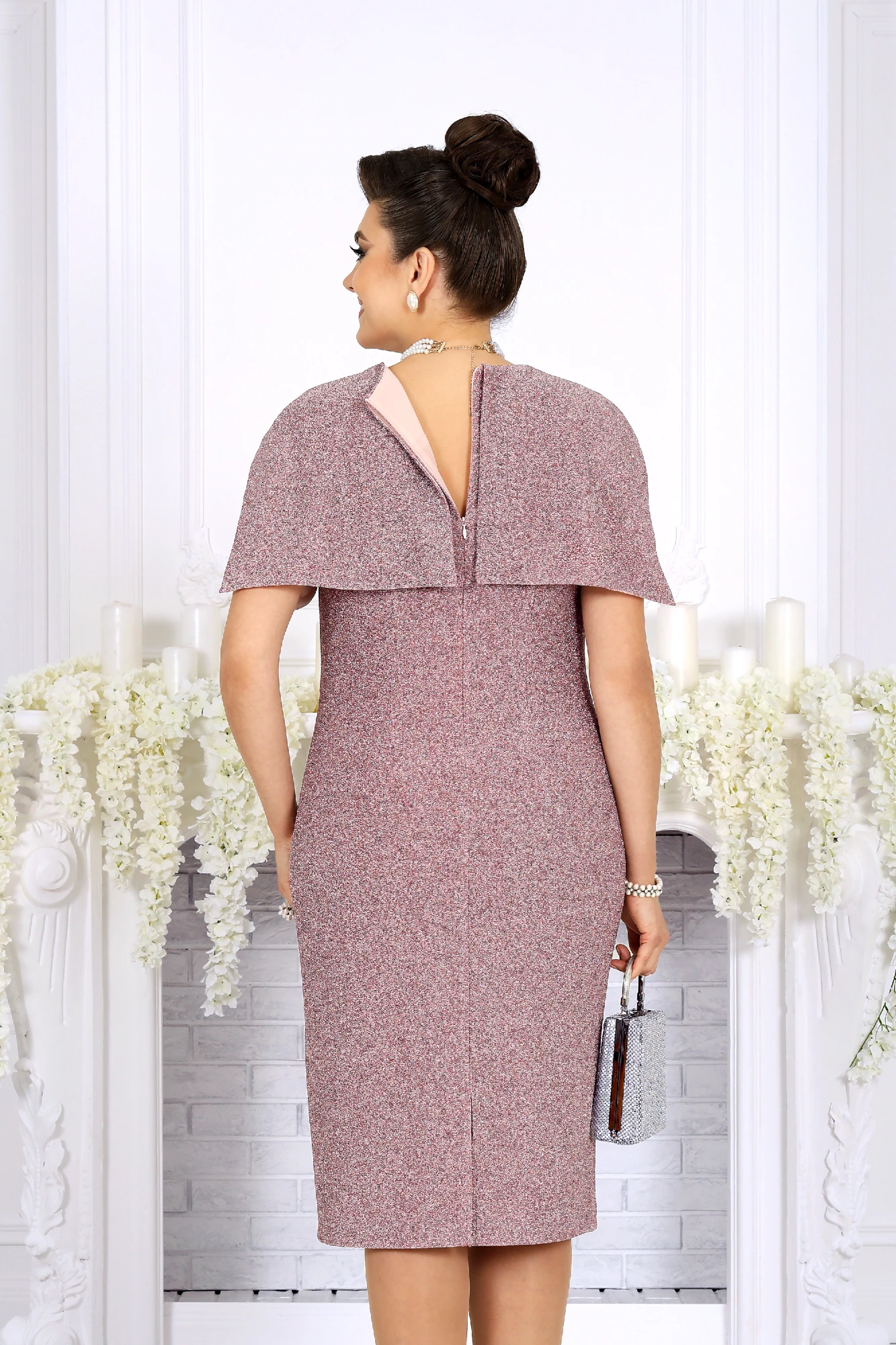 Элегантное женское платье создано для особых случаев, когда хочется выглядеть безупречно и чувствовать себя уверенно. Модель полуприлегающего силуэта мягко подчёркивает фигуру, визуально вытягивает силуэт и комфортно садится на фигуру, в том числе в больших размерах. Платье выполнено из эффектного трикотажного полотна с фактурной лицевой стороной «люрекс», которое красиво переливается при свете и придаёт образу праздничное настроение. Трикотажная подкладка обеспечивает комфорт при носке и идеальную посадку. Особый акцент модели — эффектная пелерина с фигурным низом и разрезами от плечевых швов. Она создаёт ощущение многослойности, скрывает зону плеч и рук и добавляет образу торжественности. Съёмный декоративный цветок позволяет менять настроение платья — от сдержанной классики до выразительного праздничного образа. Это платье станет идеальным выбором для свадьбы, торжественного вечера, юбилея, корпоратива или праздничного выхода, подчёркивая статус и вкус своей обладательницы. Платье женское полуприлегающего силуэта, выполнено из трикотажного полотна с фактурной лицевой стороной «люрекс». Модель на трикотажной подкладке, без воротника и рукавов, без плечевых накладок. Перед отрезной по линии талии; на верхней части обработан рельеф, направленный от левой проймы, на нижней части, на продолжении линии рельефного шва, обработана таллиевая вытачка. По обе стороны от подреза талии переда застрочены косые односторонние складки. Спинка с таллиевыми вытачками и средним швом, в верхней части которого обработана застежка на потайную тесьму-«молнию» (50см), в нижней – разрез. Горловина круглой формы, спереди углубленная. В шов обтачивания горловины входит пелерина с фигурным низом и разрезами от плечевых швов; пелерина разъемная по середине спинки. Платье дополнено съемным «цветком» из основного полотна. Длина платья - 106 см.