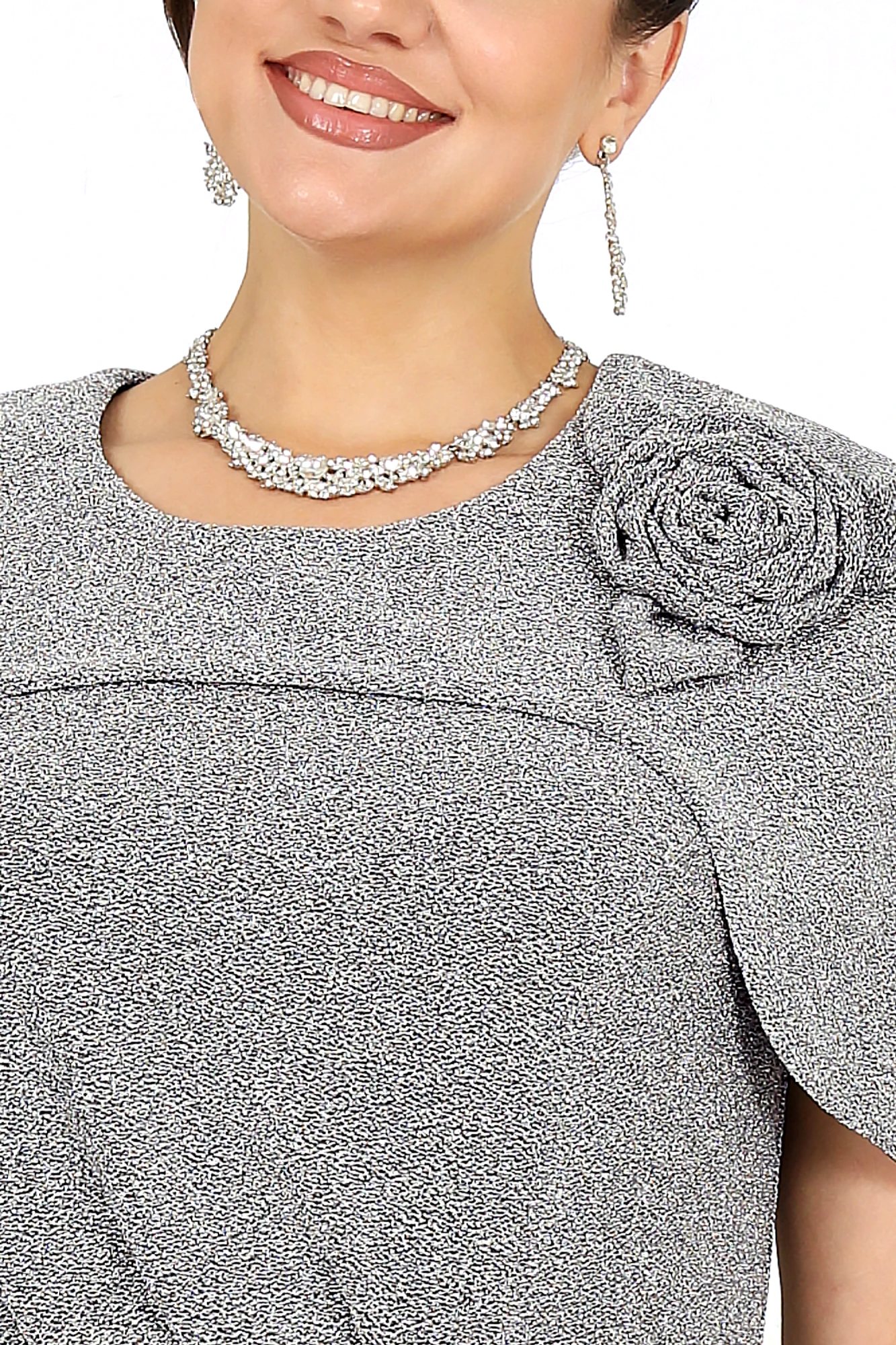 Элегантное женское платье создано для особых случаев, когда хочется выглядеть безупречно и чувствовать себя уверенно. Модель полуприлегающего силуэта мягко подчёркивает фигуру, визуально вытягивает силуэт и комфортно садится на фигуру, в том числе в больших размерах. Платье выполнено из эффектного трикотажного полотна с фактурной лицевой стороной «люрекс», которое красиво переливается при свете и придаёт образу праздничное настроение. Трикотажная подкладка обеспечивает комфорт при носке и идеальную посадку. Особый акцент модели — эффектная пелерина с фигурным низом и разрезами от плечевых швов. Она создаёт ощущение многослойности, скрывает зону плеч и рук и добавляет образу торжественности. Съёмный декоративный цветок позволяет менять настроение платья — от сдержанной классики до выразительного праздничного образа. Это платье станет идеальным выбором для свадьбы, торжественного вечера, юбилея, корпоратива или праздничного выхода, подчёркивая статус и вкус своей обладательницы. Платье женское полуприлегающего силуэта, выполнено из трикотажного полотна с фактурной лицевой стороной «люрекс». Модель на трикотажной подкладке, без воротника и рукавов, без плечевых накладок. Перед отрезной по линии талии; на верхней части обработан рельеф, направленный от левой проймы, на нижней части, на продолжении линии рельефного шва, обработана таллиевая вытачка. По обе стороны от подреза талии переда застрочены косые односторонние складки. Спинка с таллиевыми вытачками и средним швом, в верхней части которого обработана застежка на потайную тесьму-«молнию» (50см), в нижней – разрез. Горловина круглой формы, спереди углубленная. В шов обтачивания горловины входит пелерина с фигурным низом и разрезами от плечевых швов; пелерина разъемная по середине спинки. Платье дополнено съемным «цветком» из основного полотна. Длина платья - 106 см.