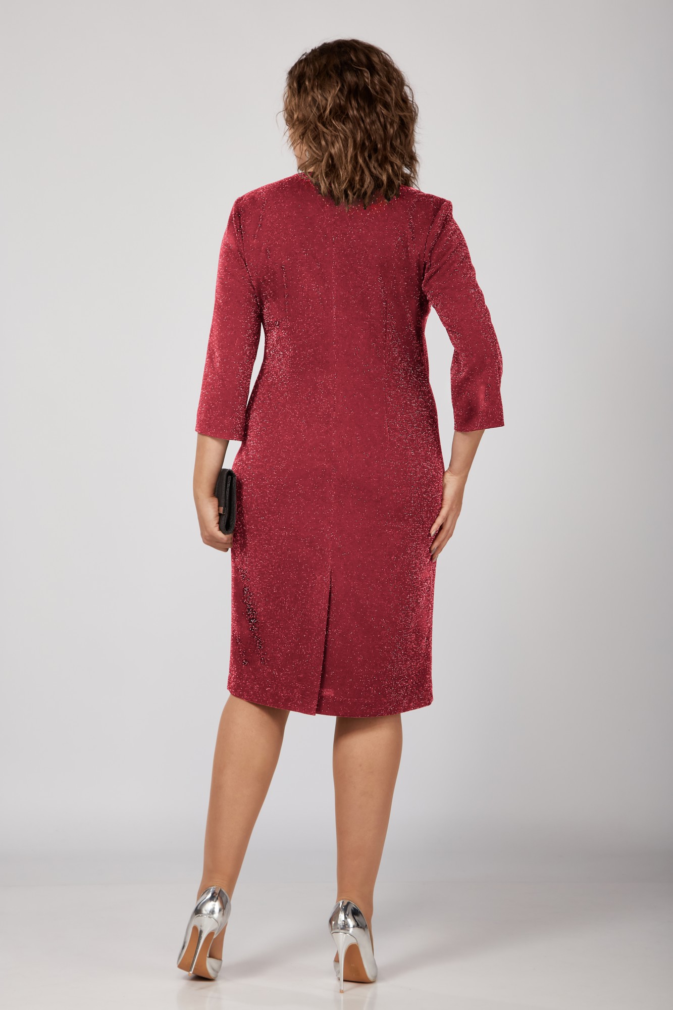 Платье полуприлегающего силуэта втачного покроя. Платье выполнено из трикотажного полотна с люрексовой нитью. Горловина V-образной формы. На переде расположены вертикальные рельефы, идущие из проймы. Спинка со средним швом, в котором расположены молния и шлица, так же на спинке расположены талиевые вытачки. Рукава ¾, к низу расширены, с декоративной тесьмой.
