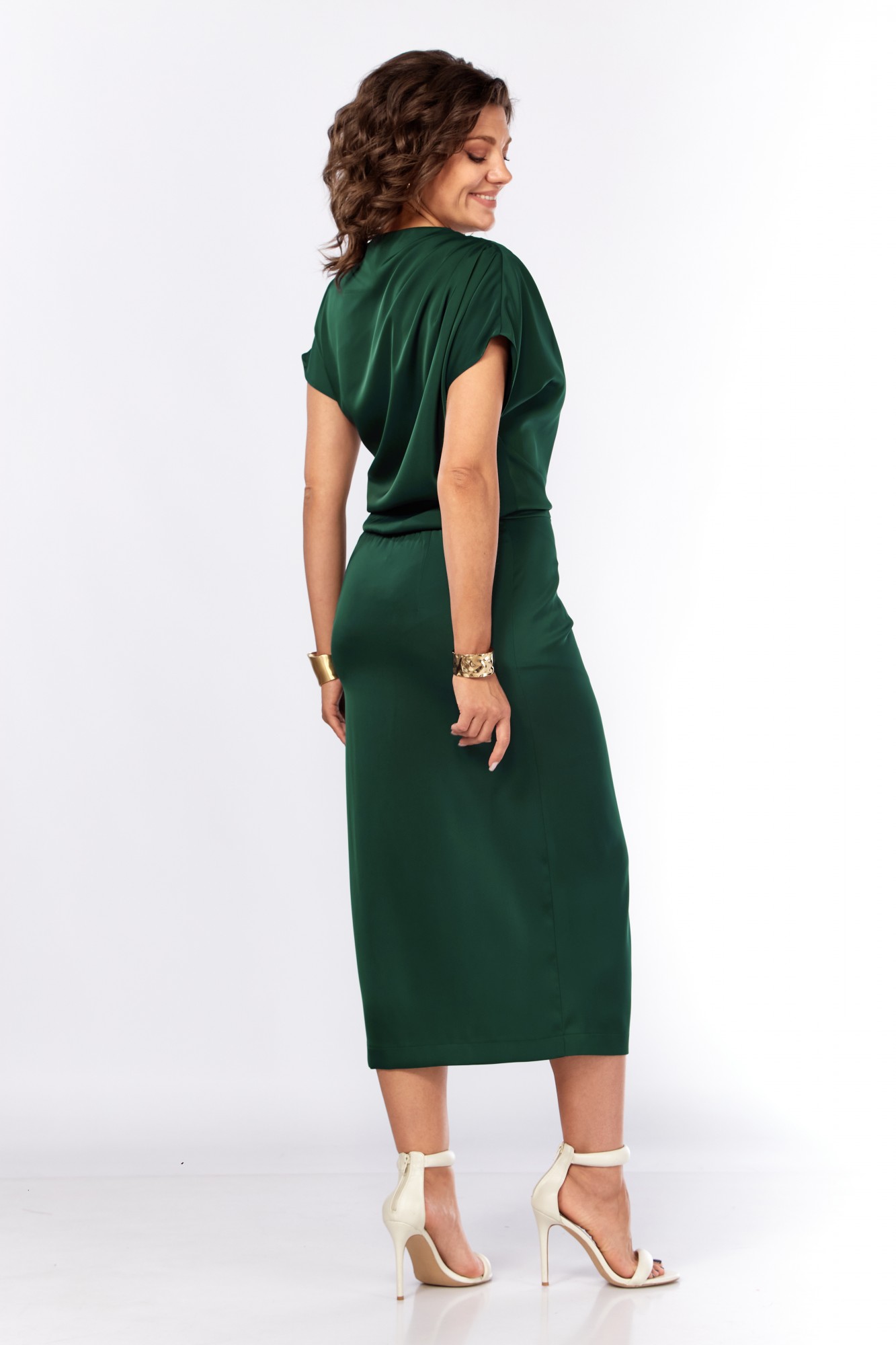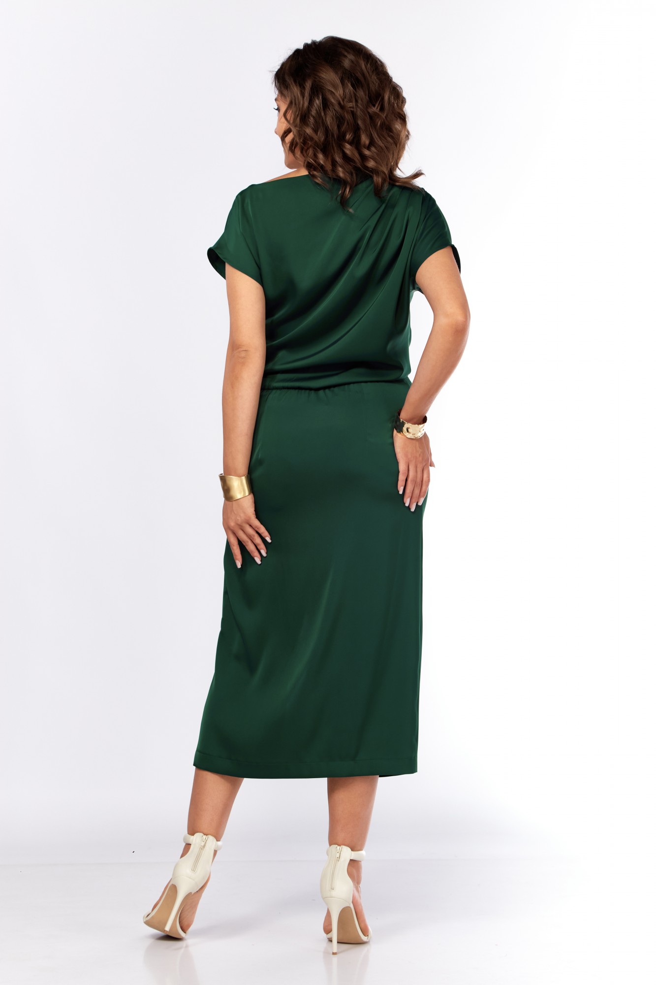 Шикарное нарядное платье, полуприлегающего силуэта из струящейся ткани с цельнокроеным рукавом, коротким, ассиметричного силуэта. Платье отрезное по талии, с молнией потайной в боковом шве. По плечевому шву по переду и спинке заложены складки. Нижняя часть с разрезом, декоративной не сьемной пряжкой. Талия присобна на резинку.
