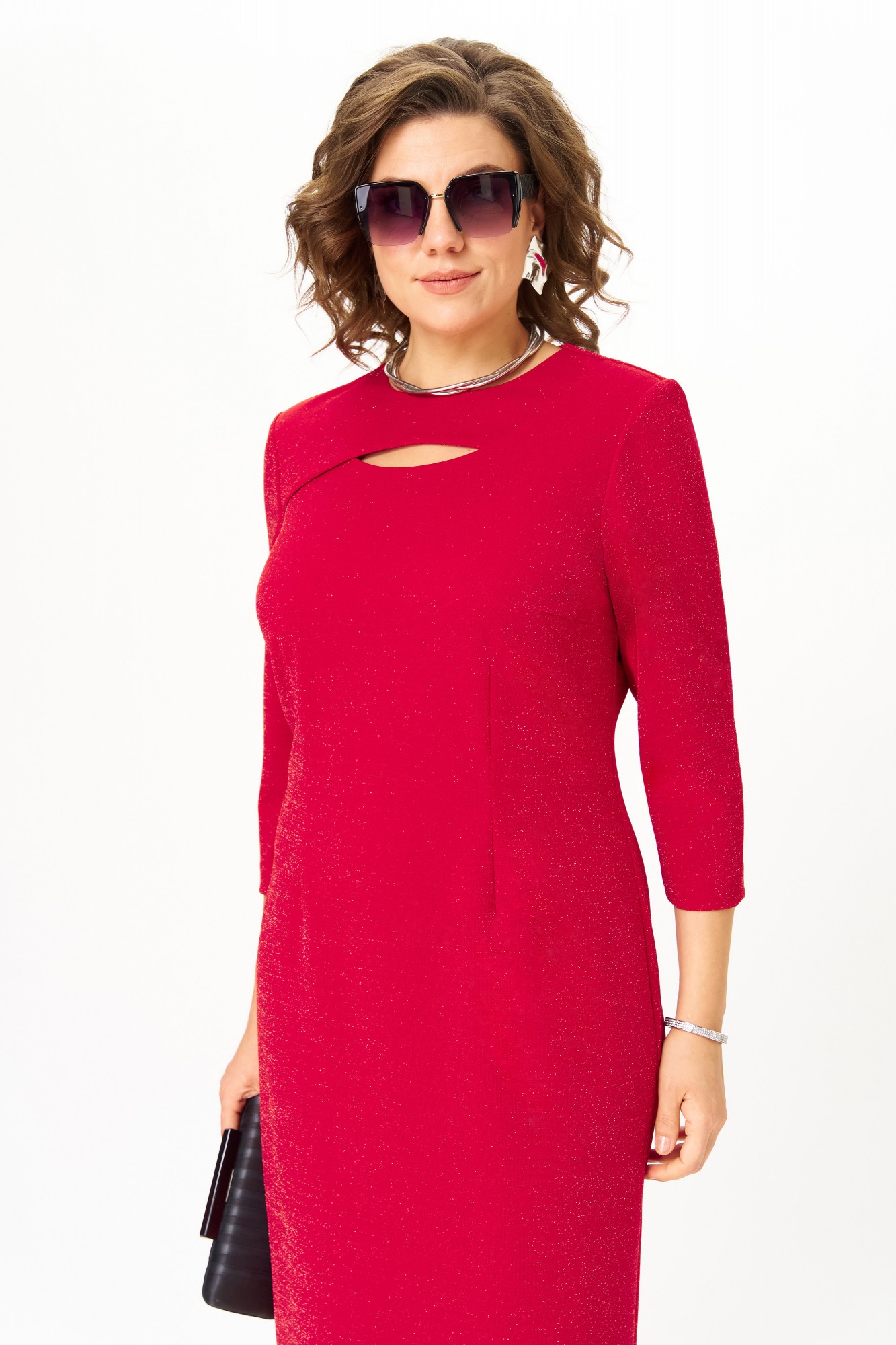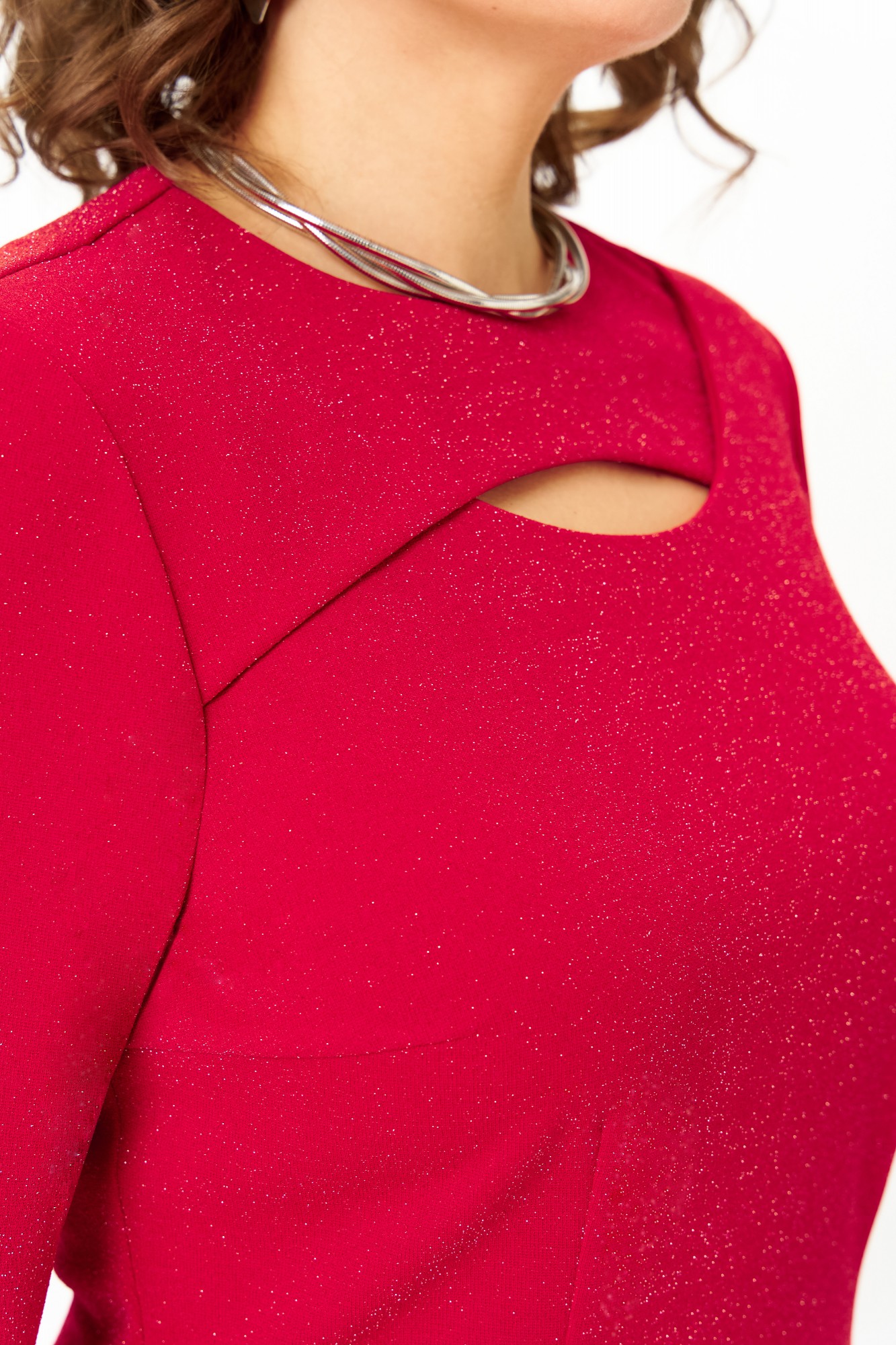 Платье женское, полуприлегающего силуэта, втачного покроя рукава, выполнено из трикотажного полотна с люрексовой нитью. По переду расположены талиевые и нагрудные вытачки, горловина округлой формы с пересекающейся кокеткой, которая образует фигурный вырез. Спинка со средним швом, заканчивающимся разрезом снизу и застегивающимся на навесную петлю-пуговицу сверху, а так же талиевые вытачки. Рукава ¾ одношовные.