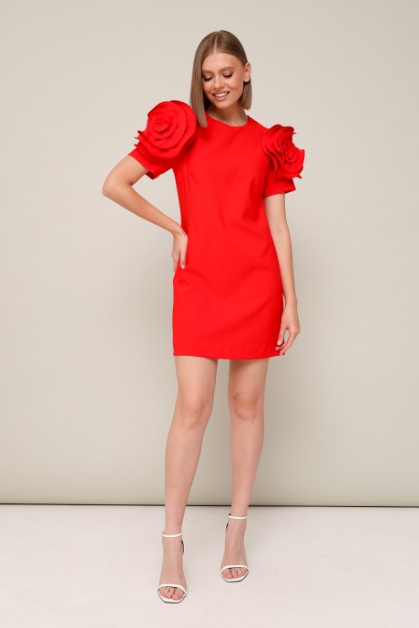 Платье А-образного силуэта. Округлый вырез горловины. Втачные короткие рукава, декорированные элементами из основной ткани в виде цветка. Застежка по спинке в среднем шве на потайную молнию. Платье без подкладки.
