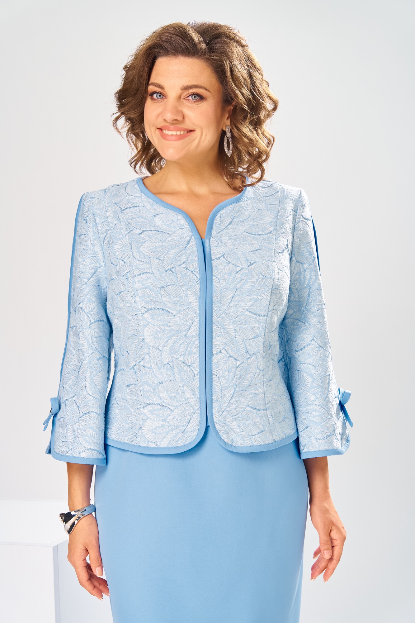 Платье женское, относится к торжественной одежде. Платье женское, полуприлегающего силуэта, длиной за колено. Платье отрезное по линии талии, выполнено имитацией костюма. Верхняя часть переда с 2-мя отрезными рельефами, выходящими из плечевых швов. Верхняя часть спинки с 2-мя отрезными бочками и средним швом. Застёжка на потайную тесьму-молнию в среднем шве спинки. Горловина фигурная. Припуски горловины среднего шва переда и низа верхней части обработаны косой бейкой шириной 1-1 см. Рукав 2-х шовный, втачной, длиной 7/8. припуски верхнего шва рукава и низа обработаны косой бейкой, шириной 1,1 см. Рукав декорирован пришивным бантом со стразой. Нижняя часть переда без конструктивных особенностей нижняя часть спинки с 2-мя таллиевыми вытачками и средним швом, заканчивающимся шлицей. Платье на подкладке отрезной по линии талии. Платье с плечевыми накладками.