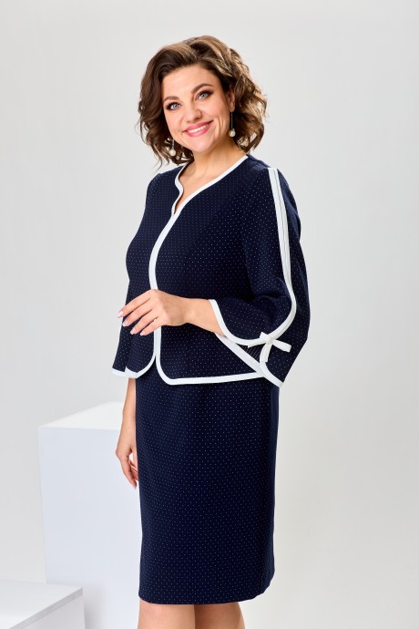 Платье женское, относится к торжественной одежде. Платье женское, полуприлегающего силуэта, длиной за колено. Платье отрезное по линии талии, выполнено имитацией костюма. Верхняя часть переда с 2-мя отрезными рельефами, выходящими из плечевых швов. Верхняя часть спинки с 2-мя отрезными бочками и средним швом. Застёжка на потайную тесьму-молнию в среднем шве спинки. Горловина фигурная. Припуски горловины среднего шва переда и низа верхней части обработаны косой бейкой шириной 1-1 см. Рукав 2-х шовный, втачной, длиной 7/8. припуски верхнего шва рукава и низа обработаны косой бейкой, шириной 1,1 см. Рукав декорирован пришивным бантом со стразой. Нижняя часть переда без конструктивных особенностей нижняя часть спинки с 2-мя таллиевыми вытачками и средним швом, заканчивающимся шлицей. Платье на подкладке отрезной по линии талии. Платье с плечевыми накладками.