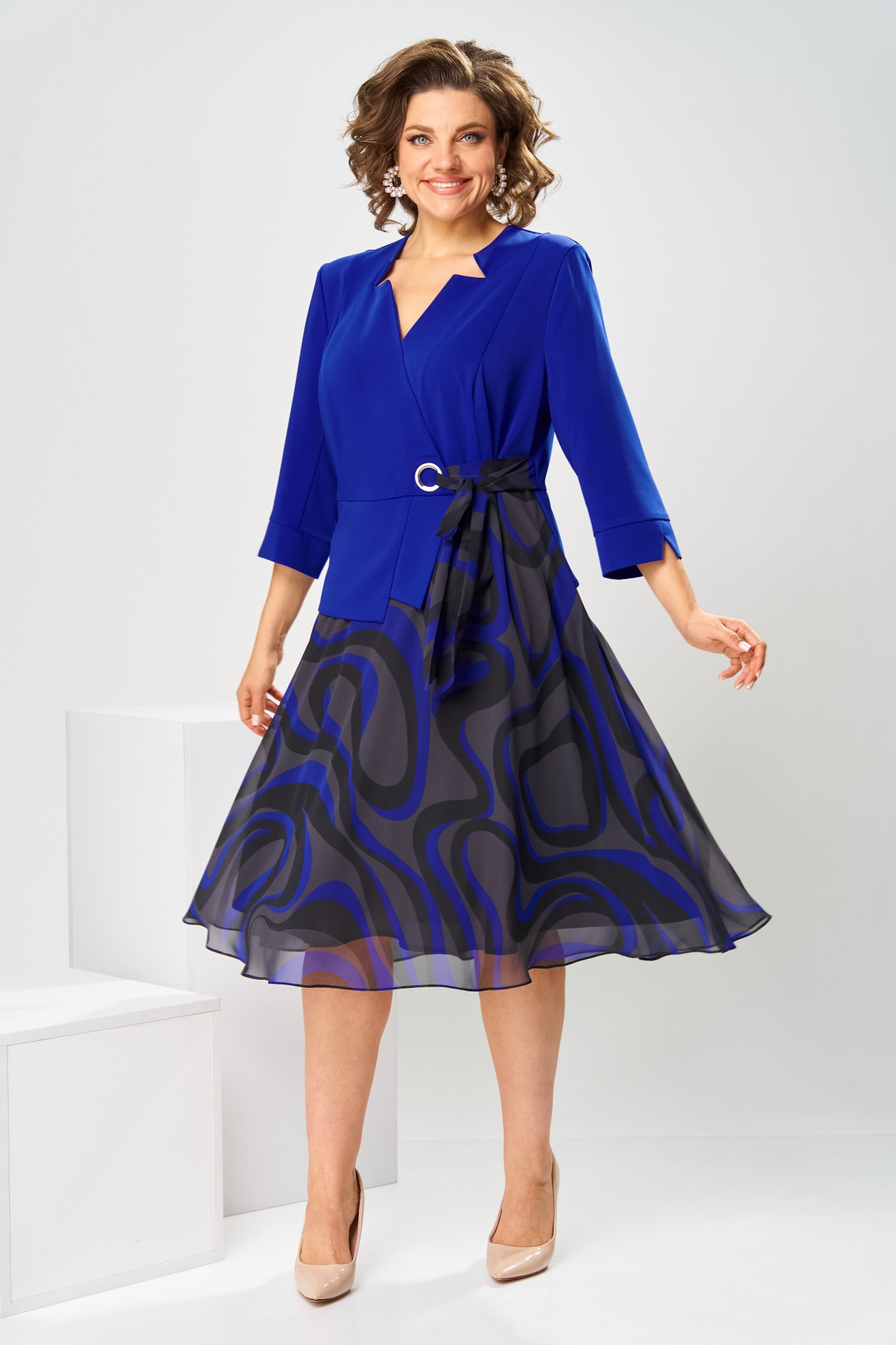 Платье женское относится к нарядной торжественной одежде, но может использовано и при повседневной носке. Платье женское, отрезное по линии талии, расширенное к низу, длиной за колено. Верхняя часть переда с отрезными рельефами, выходящими из плечевых швов, центральная часть с зафиксированным запахом. Верхняя часть спинки со средним швом и 2-мя рельефами, выходящими из плечевых швов. Горловина с V-образным вырезом, фигурная, обточная без воротника. Нижняя часть переда и нижняя часть спинки цельнокроеные, выполнены из отделочной ткани. Шов соединения верхней и нижней частей платья декорирован притачной фигурной отлетной баской. Платье с декоративным поясом из отделочной ткани, закреплённом на левом боковом шве и фиксирующимся в бант через металлическую пробивную блочку на центральной части переда. Рукав одно шовный втачной, длиной до локтя, с притачной фигурной манжетой. Платье с плечевыми накладками. Нижняя часть на подкладке.