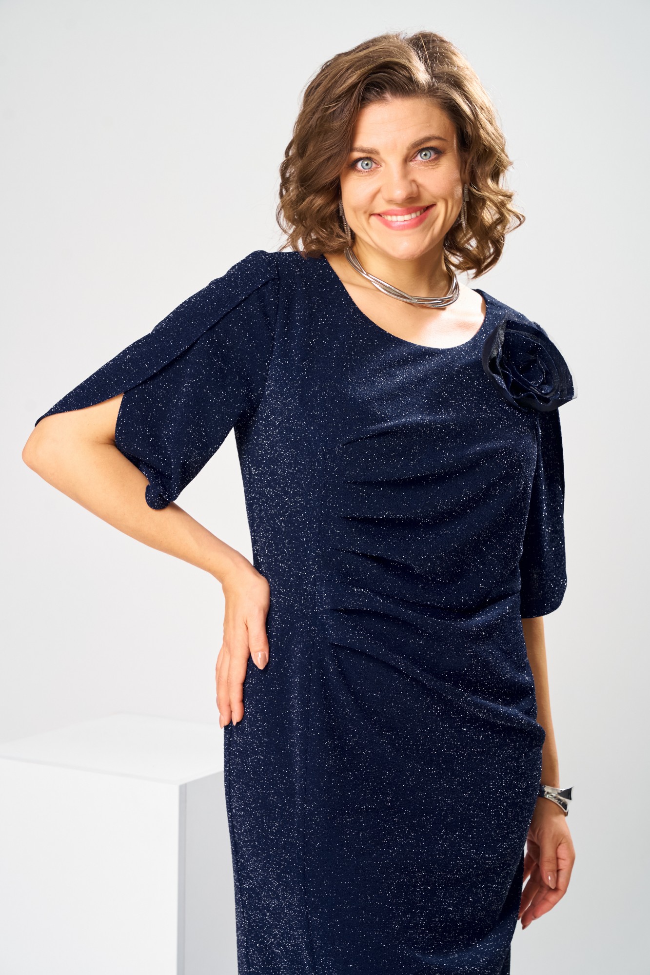 Платье женское, предназначено к нарядной торжественной одежде. Платье женское, полу прилегающего силуэта, длиной до нижней части икры. Перед с 1-ним отрезным бочком справа, шов соединения его с передом заканчивается разрезом, перед отрезной по линии талии, верхняя часть с 4-мя зафиксированными складками, нижняя часть с 2-мя такими же складками расположенными справа по шву притачивания бочка. Спинка с 2-мя таллиевыми вытачками. Горловина круглая обточная без воротника. Застёжка на потайную тесьму-молнию в левом боковом шве платья. Рукав втачной, длиной до локтя с запахом по окату с закруглёнными концами. Платье на подкладке. Платье с плечевыми накладками. К платью прилагается съёмное украшение.