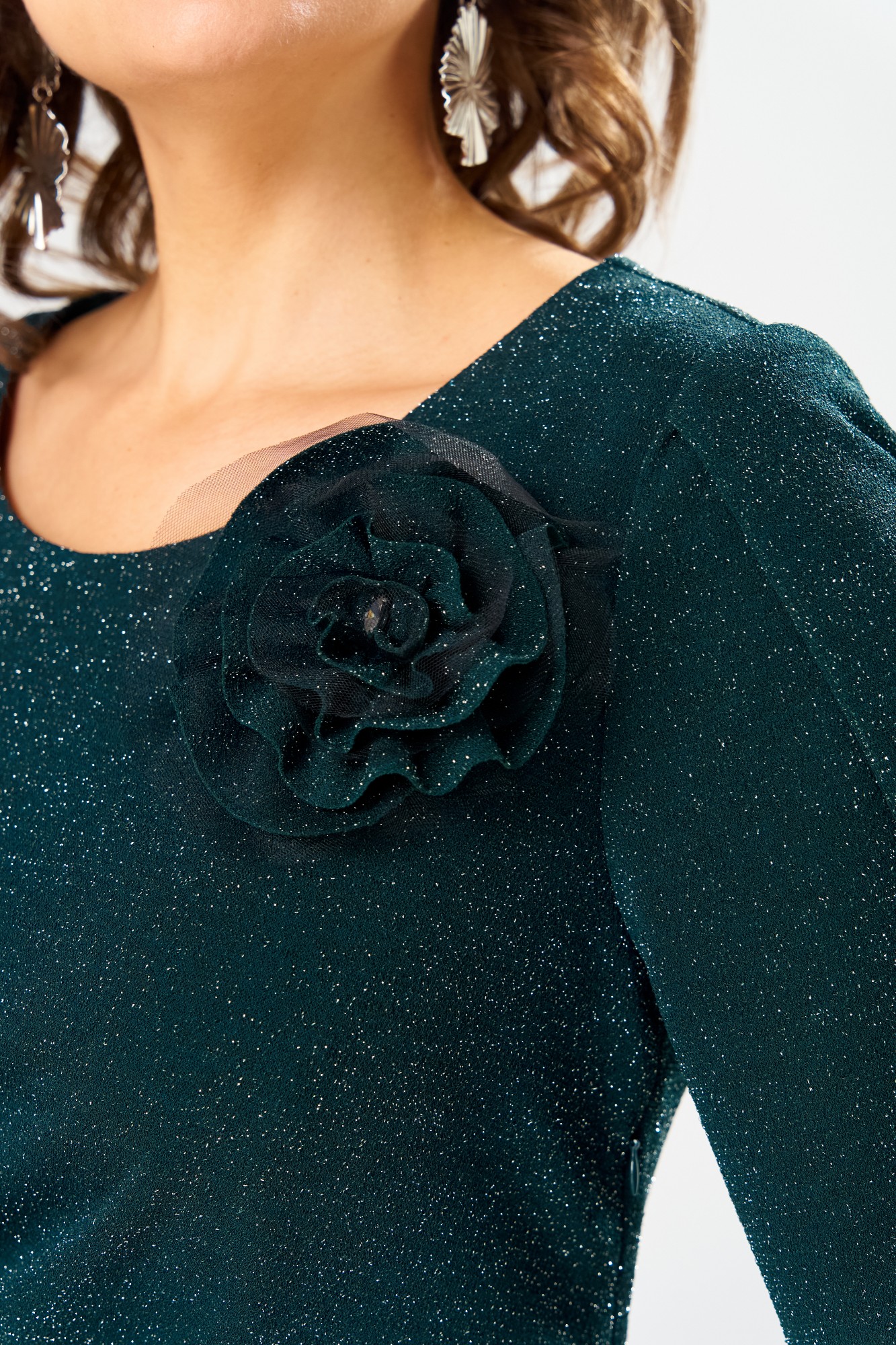 Платье женское, предназначено к нарядной торжественной одежде. Платье женское, полу прилегающего силуэта, длиной до нижней части икры. Перед с 1-ним отрезным бочком справа, шов соединения его с передом заканчивается разрезом, перед отрезной по линии талии, верхняя часть с 4-мя зафиксированными складками, нижняя часть с 2-мя такими же складками расположенными справа по шву притачивания бочка. Спинка с 2-мя таллиевыми вытачками. Горловина круглая обточная без воротника. Застёжка на потайную тесьму-молнию в левом боковом шве платья. Рукав втачной, длиной до локтя с запахом по окату с закруглёнными концами. Платье на подкладке. Платье с плечевыми накладками. К платью прилагается съёмное украшение.
