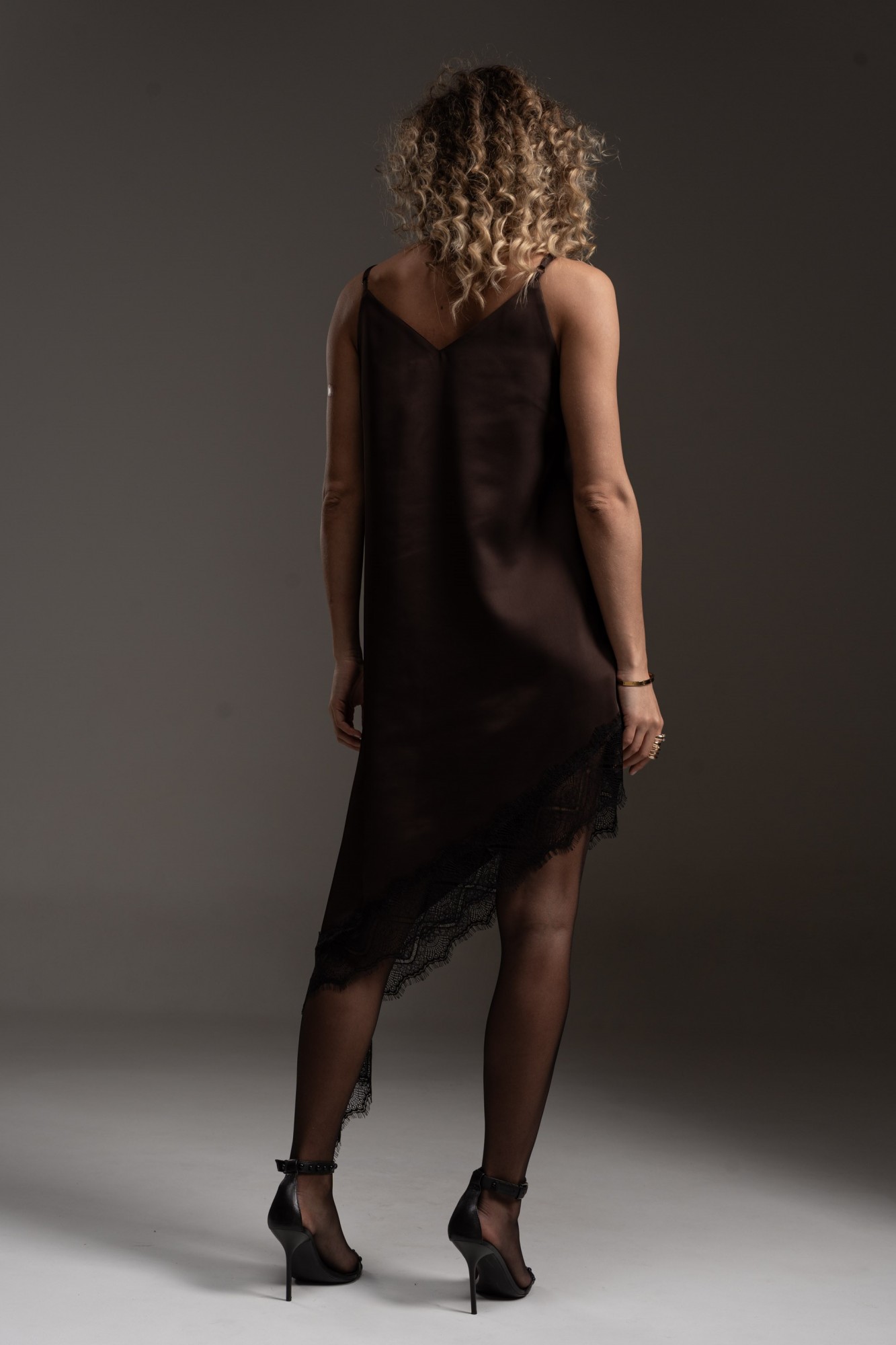 Платье-комбинация, свободного силуэта, с нагрудными вытачками. Линия декольте переда и низа декорированы "французским" кружевом. Линия низа ассиметричная. Регулируемые бретели обеспечивают идеальную посадку и комфорт при носке. Шелковистая ткань делает образ стильным и завораживающим.