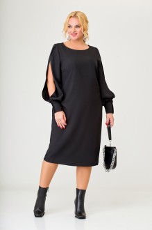 Платье полуприлегающего силуэта, с длинными объёмными рукавами. В области локтевого шва, от проймы до низа, обработан разрез. По низу рукавов манжеты, которые застёгиваются на 5 петель и 5 декоративных пуговиц. Горловина платья круглая. По переду платья расположены нагрудные вытачки. Спинка с талиевыми вытачками и средним швом, в который вставлена потайная молния. По низу спинки обработана шлица.