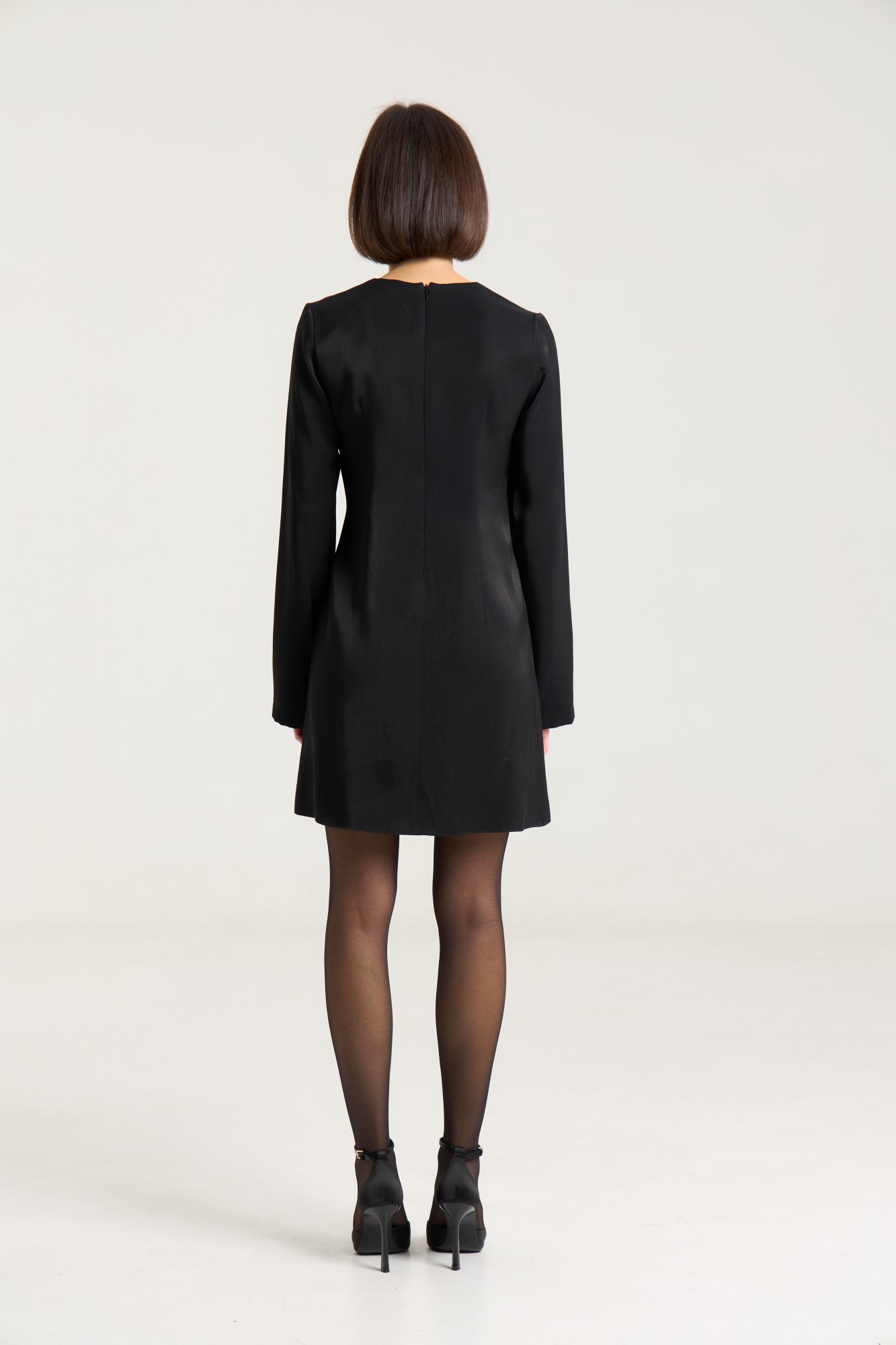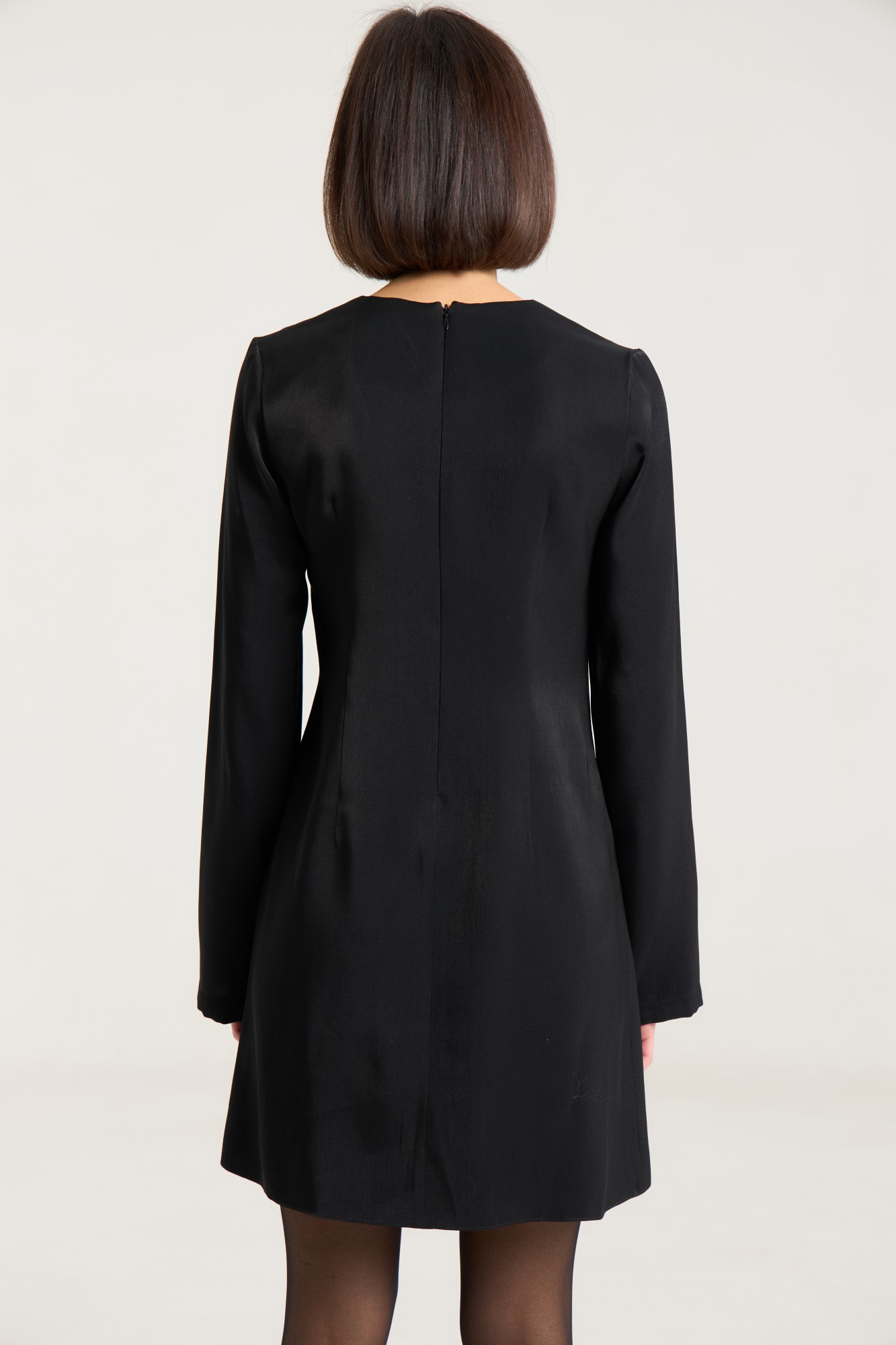 Платье полуприлегающего силуэта, расклешнное к низу, рукав свободный, втачной. По груди нагрудные выточки, по спинке таллиевые выточки, застежка на потайную молнию в среднем шве. Платье выполнено из легкой вискозной ткани в черном цвете, ткань имеет красивый серебряный блеск и выглядит дорого. Платье без подкладки.