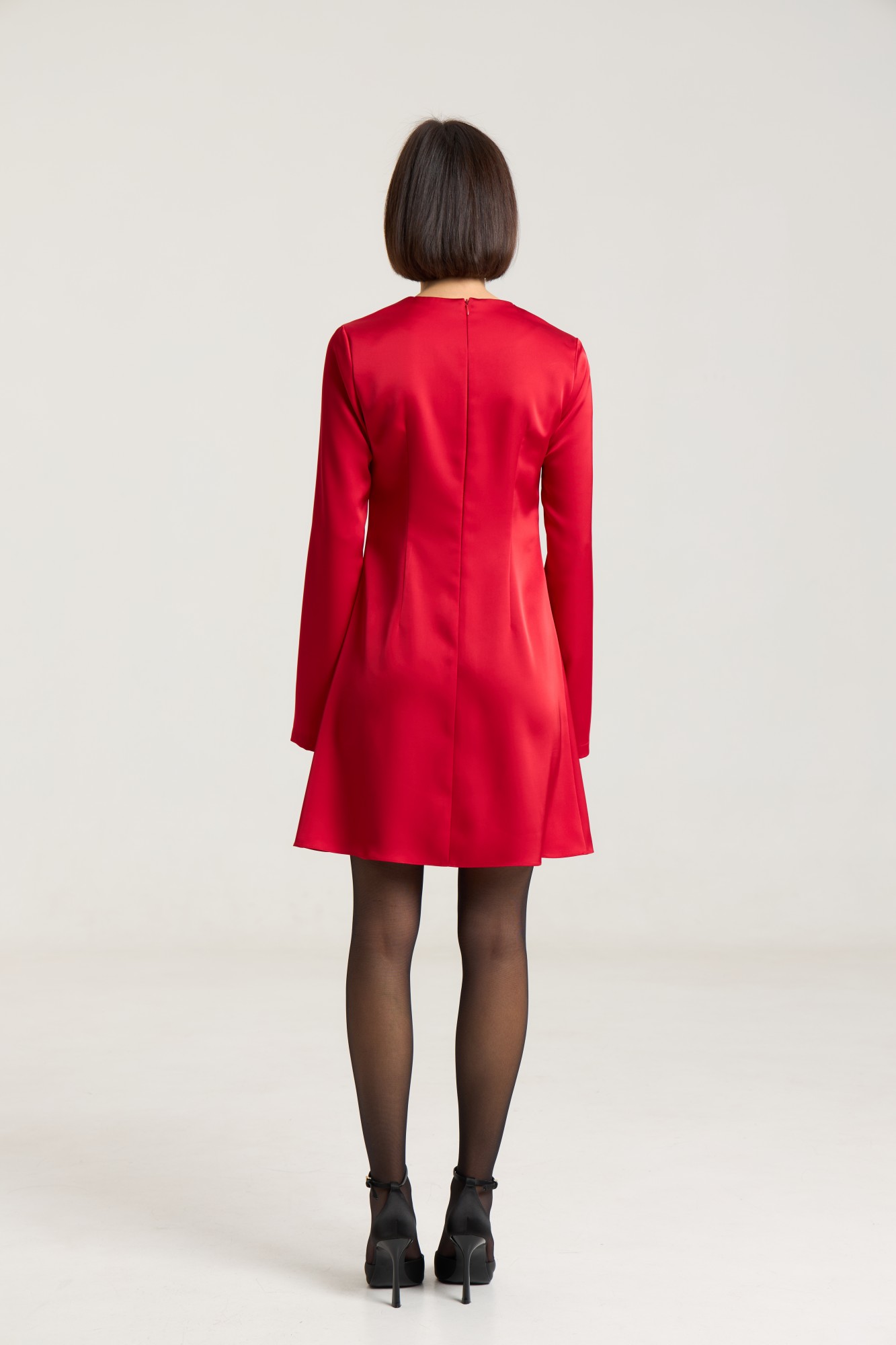 Платье полуприлегающего силуэта, расклешнное к низу, рукав свободный, втачной. По груди нагрудные выточки, по спинке таллиевые выточки, застежка на потайную молнию в среднем шве. Платье выполнено из плотной атласной ткани красного цвета. Платье без подкладки.