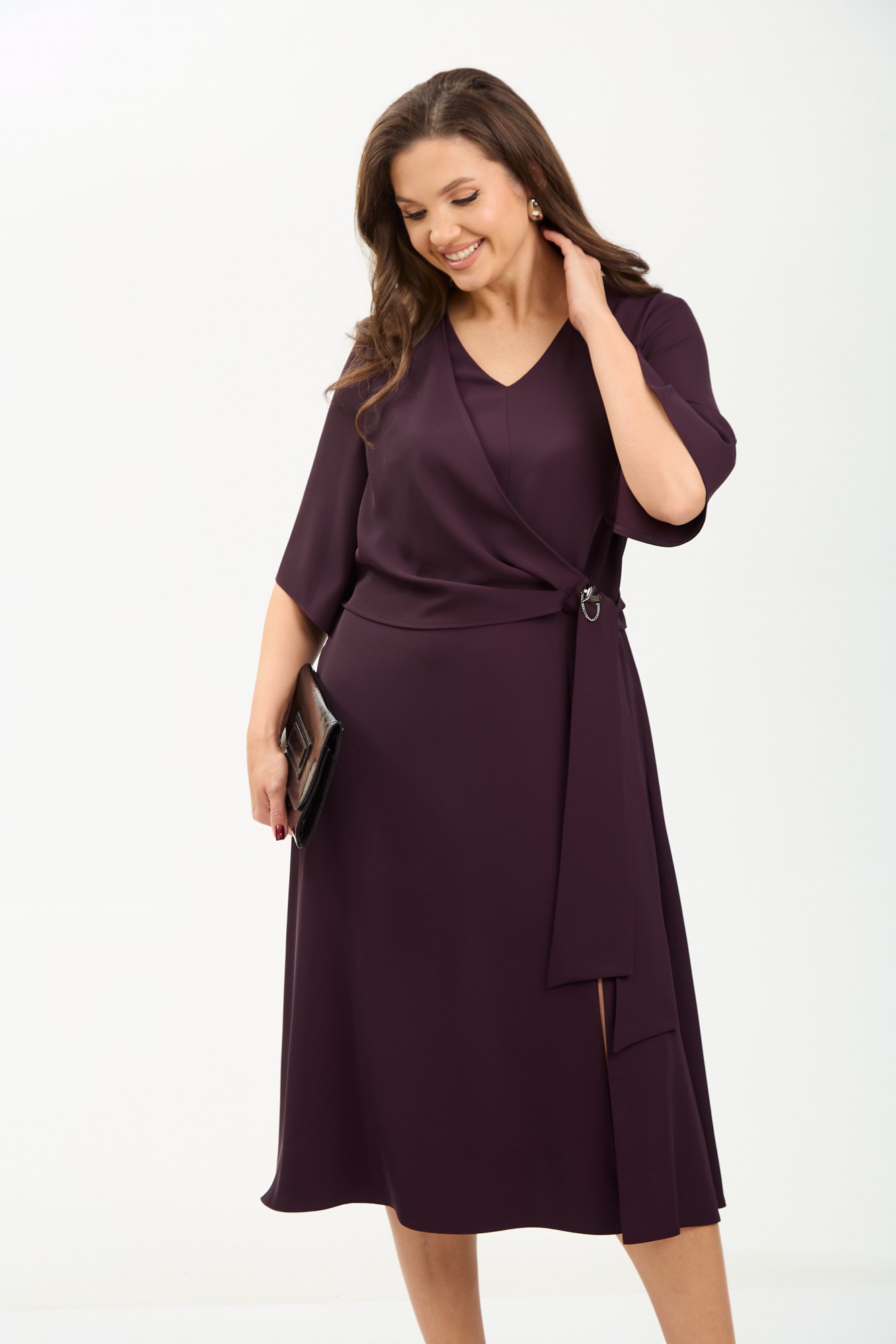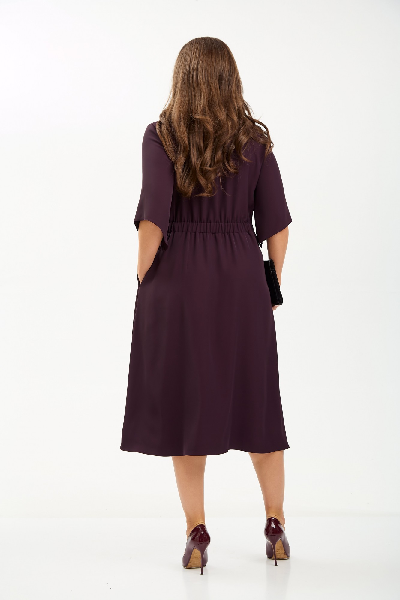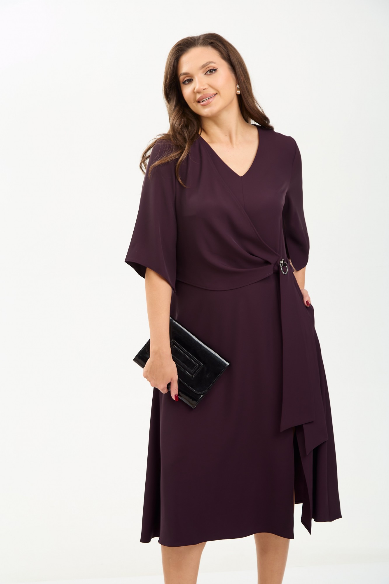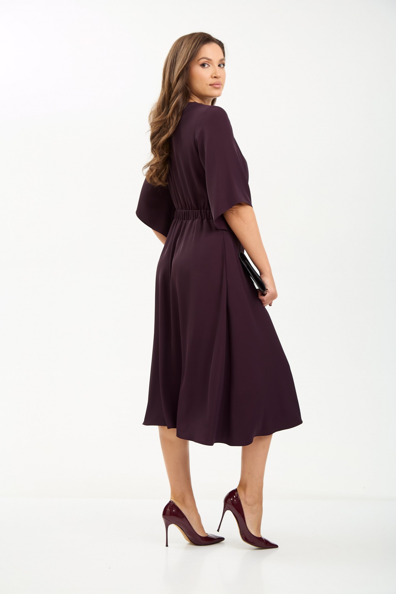 Платье женское приталенного силуэта, отрезное по талии, с расклешённой юбкой; из плательной ткани. По переду: отделочная деталь, имитирующая запах, завязывающаяся на талии; нагрудная вытачка из бокового; от талии к низу вертикальный рельеф, с разрезом. Спинка отрезная по талии с кулиской и эластичной тесьмой. Рукав расширенный книзу и удлинённый ко шву.