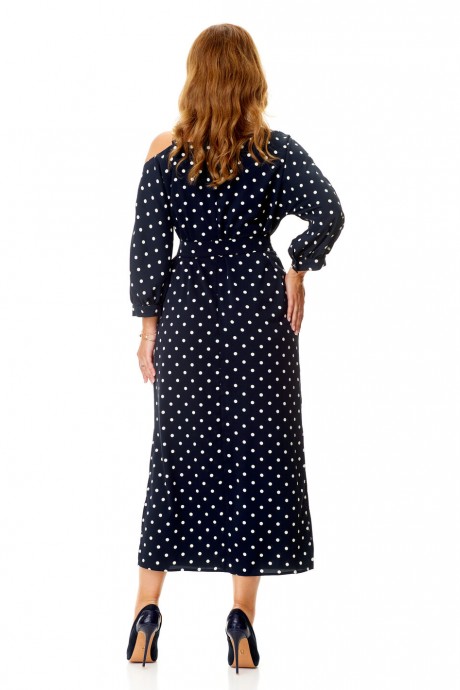 Платье женское прямого силуэта. Рукав цельнокроеный типа "летучая мышь" длиной 3/4. Горловина ассимертричная округлой формы с декоративной цепью на левом плече. Спинка со средним швом. Низ рукава выполнен со сборкой, обработан манжетой с застежкой на петлю-пуговицу. В боковых швах разрезы. Имеется навесной пояс с полукольцам.