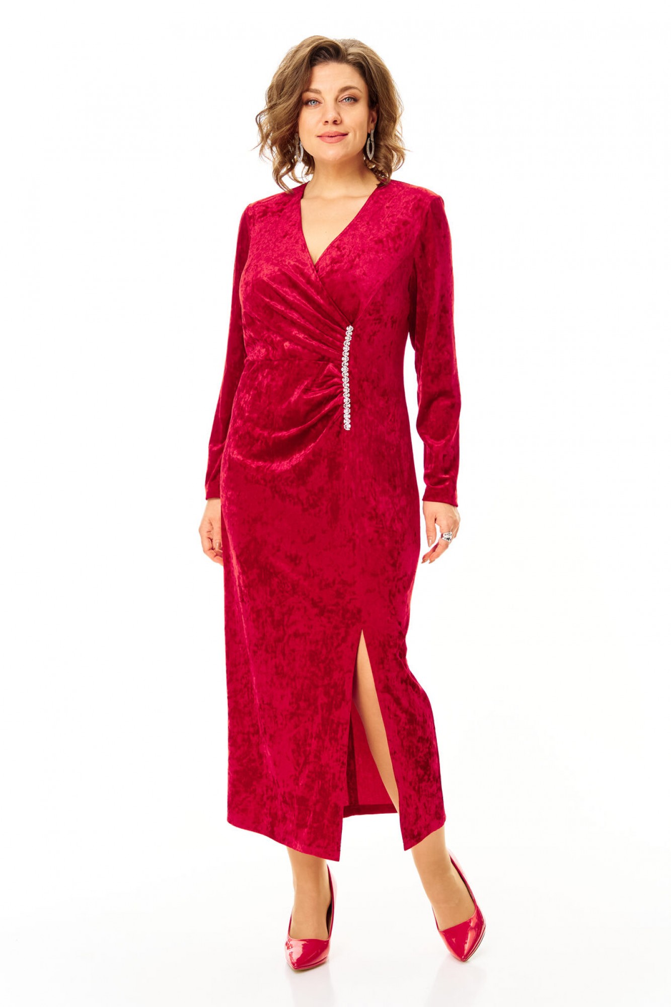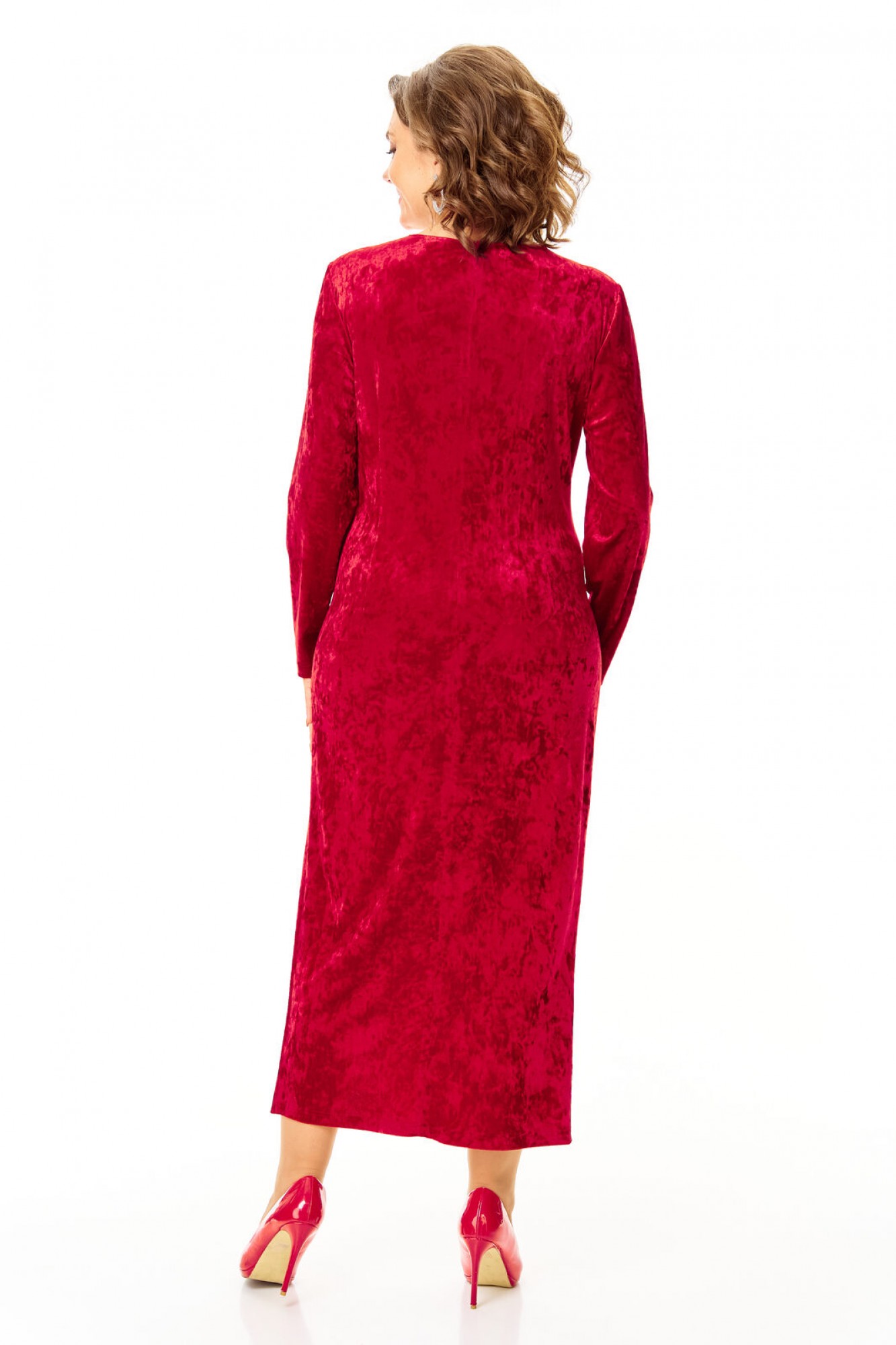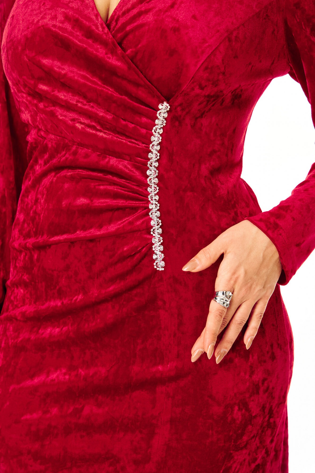 Платье женское из велюра. Платье женское полуприлегающего силуэта, заужено к низу. Рукав длинный, втачной, одношовный. По переду горловина V-образной формы. Перед ассиметричный. Слева выполнен рельеф, заканчивающийся высоким разрезом. В рельеф вставлена правая часть переда с легкими складками и нашита декоративная металлизированная декоративная тесьма со стразами. Спинка со средним швом, таллиевыми вытачками и застежкой на тесьму-молнию. Горловина обработана бейкой из подкладочной ткани 100% хлопка.