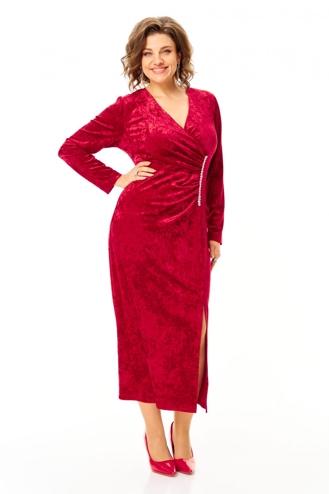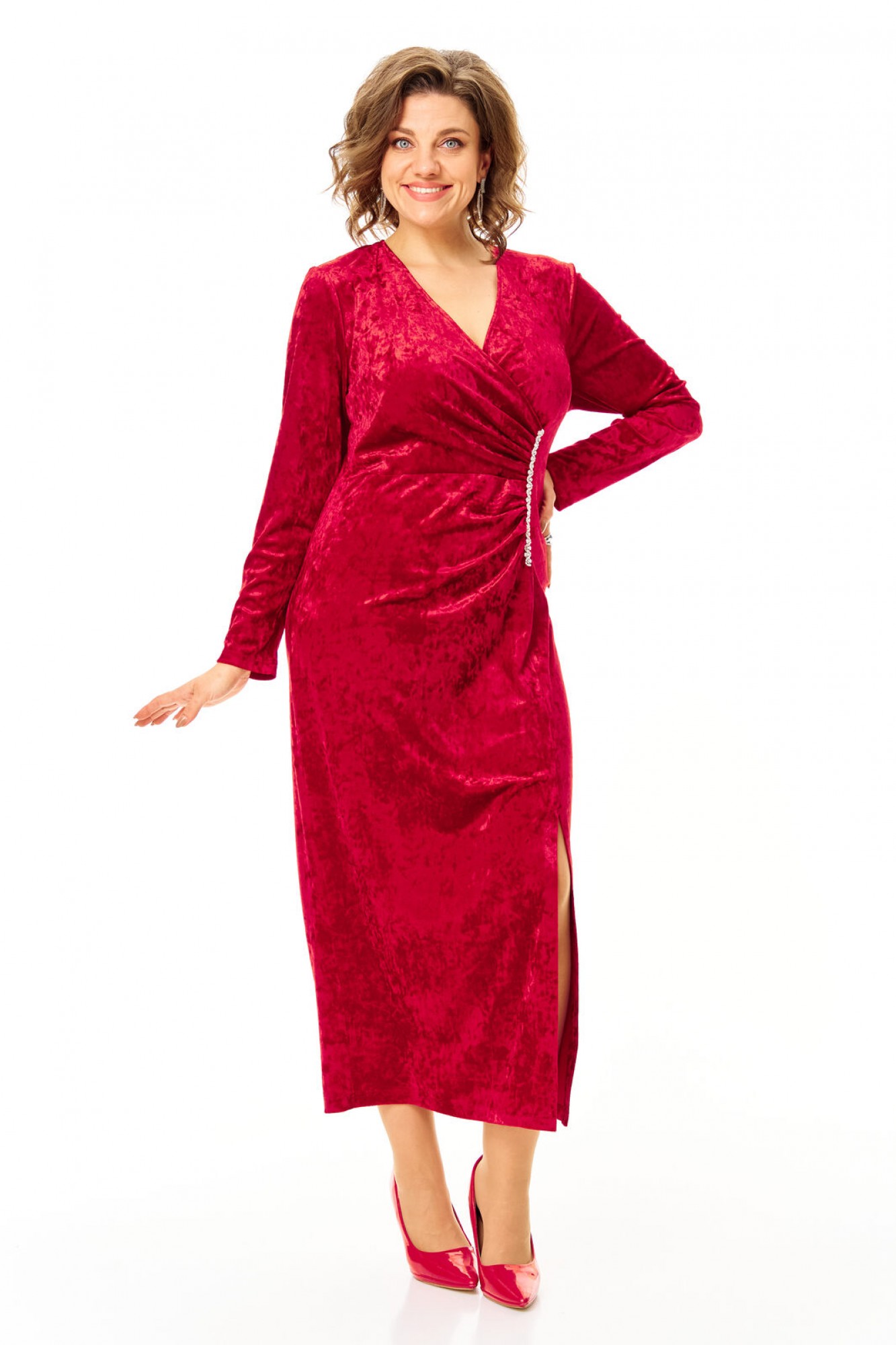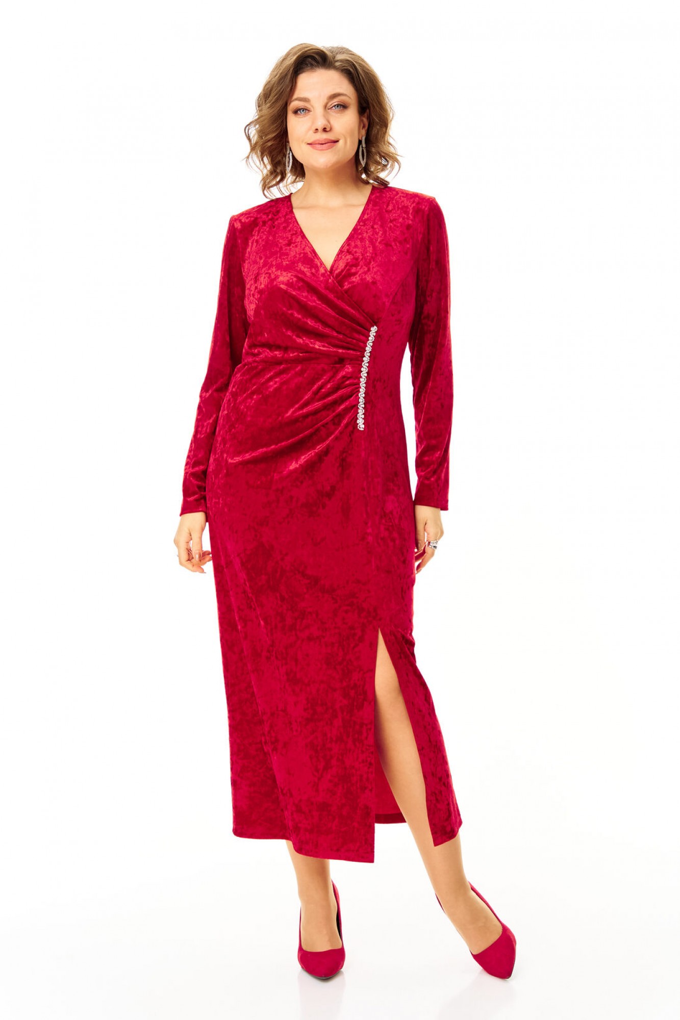 Платье женское из велюра. Платье женское полуприлегающего силуэта, заужено к низу. Рукав длинный, втачной, одношовный. По переду горловина V-образной формы. Перед ассиметричный. Слева выполнен рельеф, заканчивающийся высоким разрезом. В рельеф вставлена правая часть переда с легкими складками и нашита декоративная металлизированная декоративная тесьма со стразами. Спинка со средним швом, таллиевыми вытачками и застежкой на тесьму-молнию. Горловина обработана бейкой из подкладочной ткани 100% хлопка.