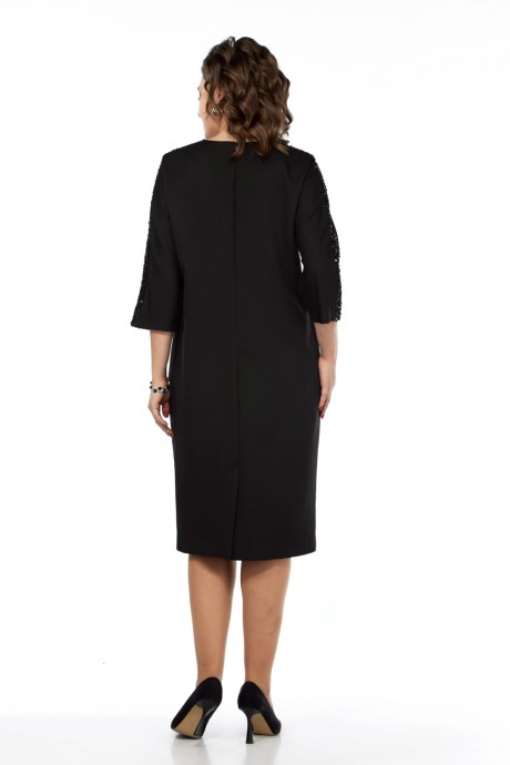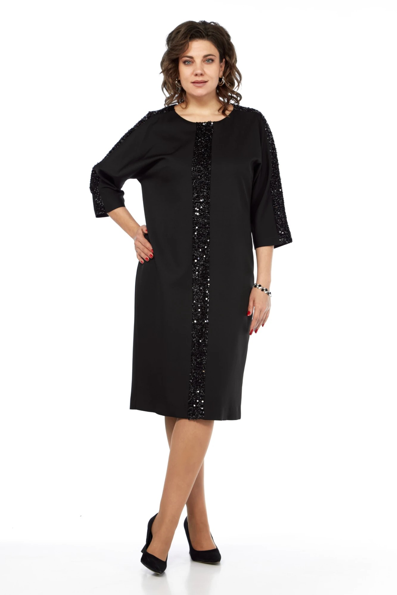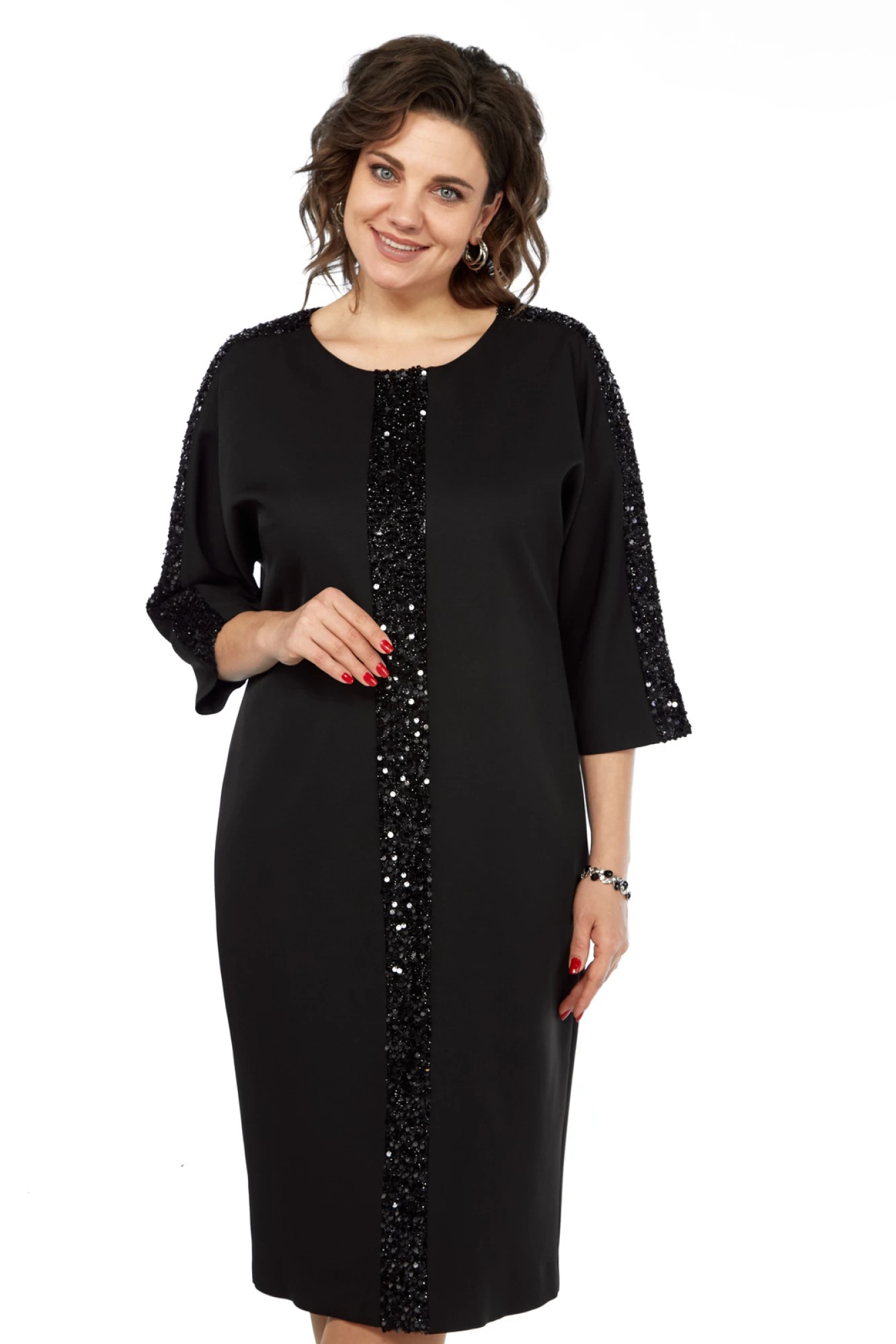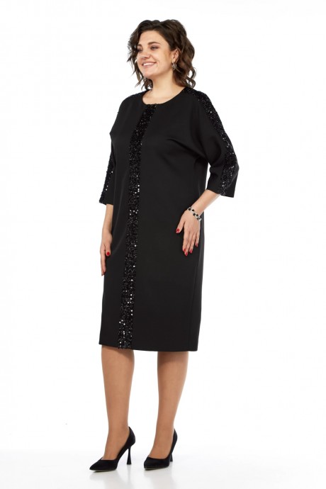Платье женское полуприлегающего силуэта, слегка заужено к низу. Рукав цельнокроеный типа "летучая мышь" длиной 3/4. Горловина округлой формы. Спинка со средним швом и шлицей. В среднем шве спинки застежка на потайную тесьму-молнию. Перед и плечевой поя с декоративными планками и отделочной ткани "пайетки". В боковых швах выполнены карманы.