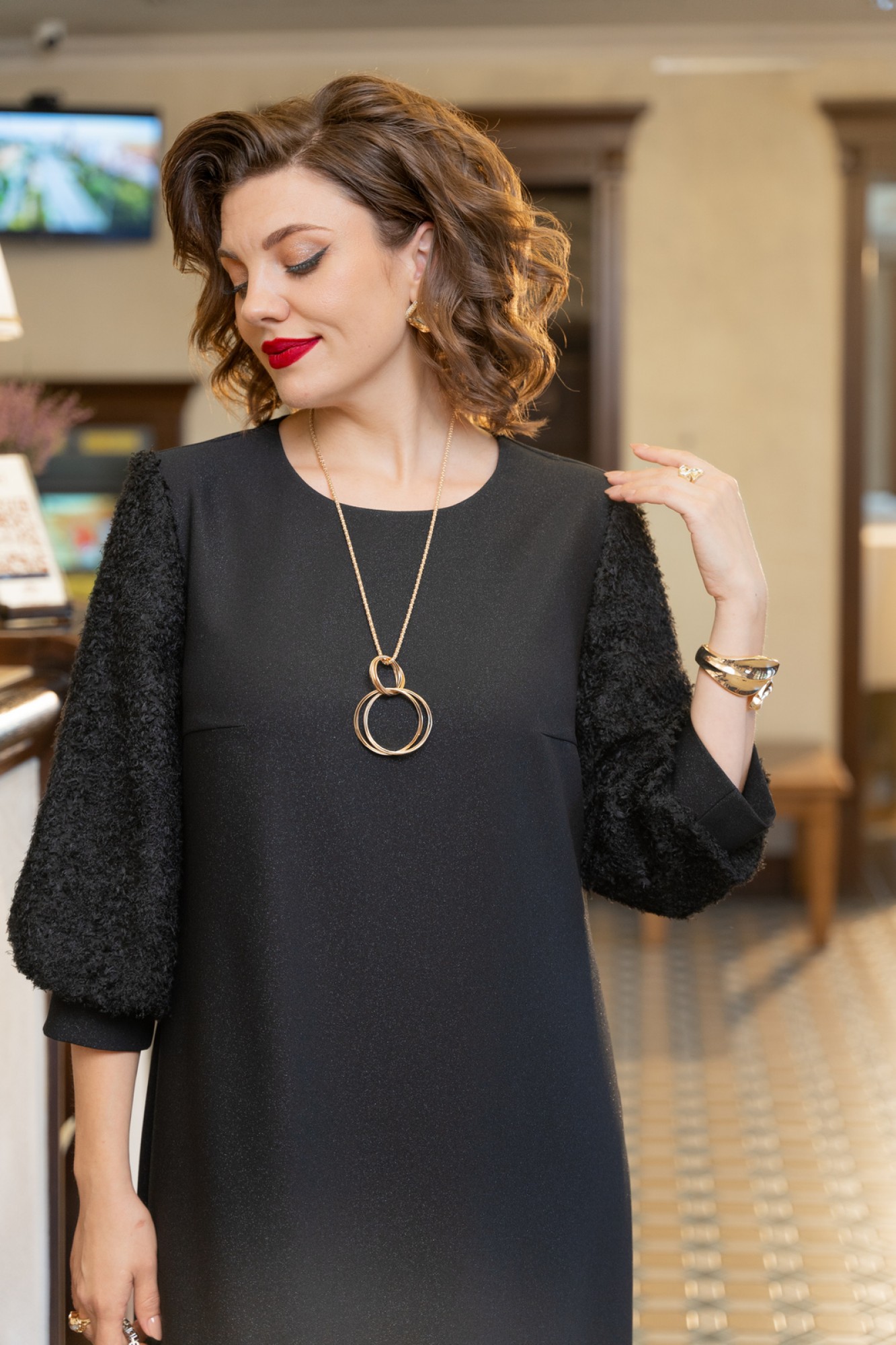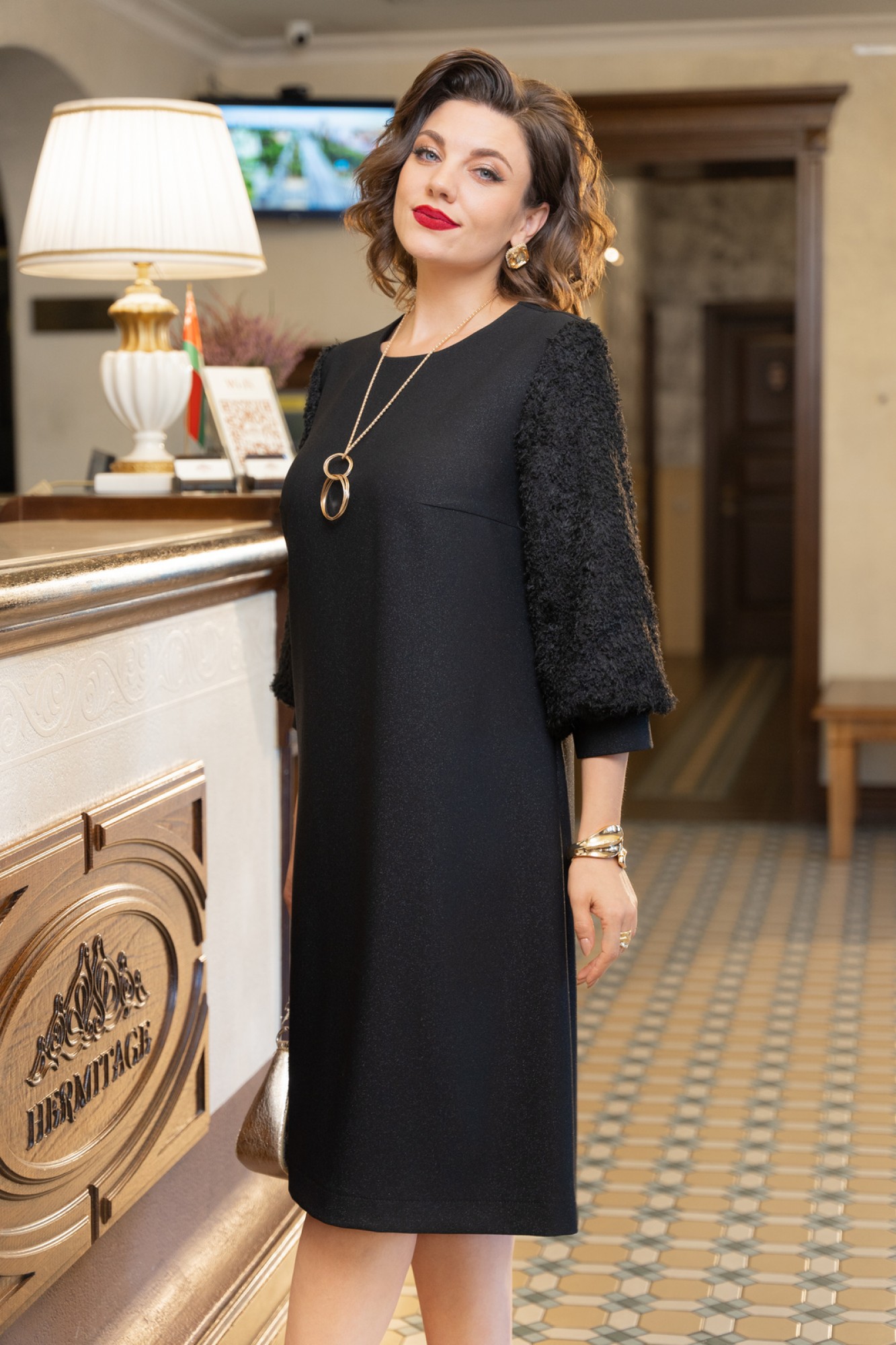Платье А-образного силуэта с естественной линией плеча. Спинка со средним швом и застежкой на молнию. Перед с нагрудными вытачками. Вырез горловины округлой формы. Рукав втачной одношовный длиной 3/4 из отделочной ткани "реснички" типа "баллон" с манжетой по низу. В комплект к платью входит декоративная подвеска.