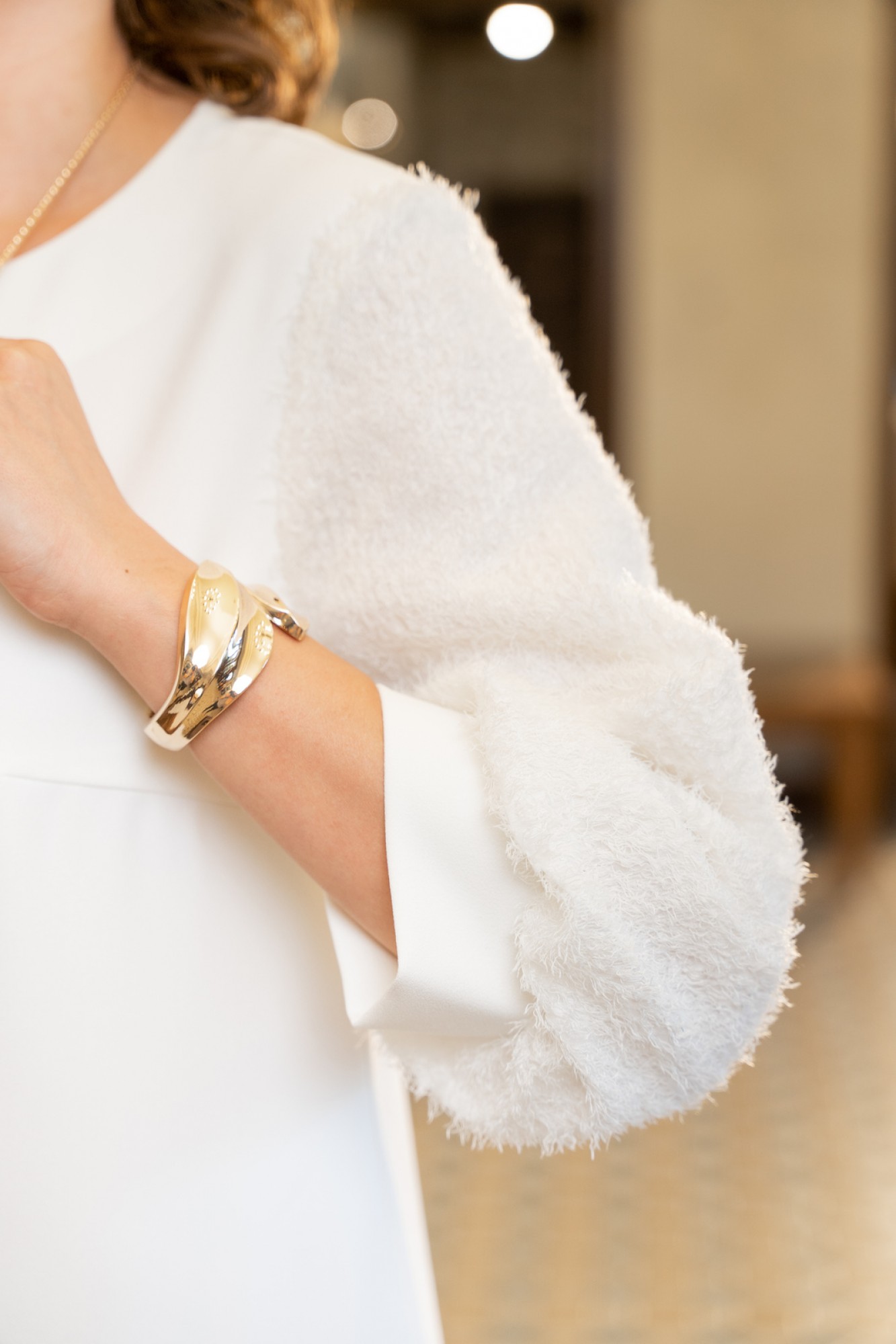 Платье А-образного силуэта с естественной линией плеча. Спинка со средним швом и застежкой на молнию. Перед с нагрудными вытачками. Вырез горловины округлой формы. Рукав втачной одношовный длиной 3/4 из отделочной ткани "реснички" типа "баллон" с манжетой по низу. В комплект к платью входит декоративная подвеска.