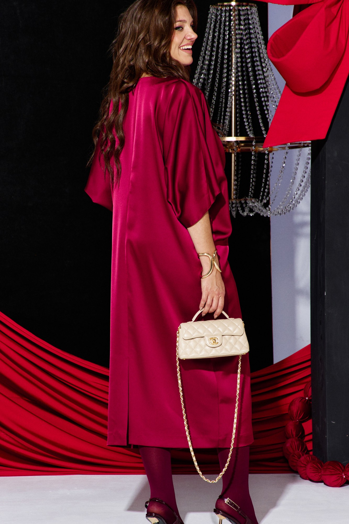 Это платье — олицетворение силы и изящности: ярко, но не кричаще. Уверенный, волнующий наряд для торжественных мероприятий и важных встреч. Силуэт «летучая мышь» мягко обтекает фигуру, создавая плавный переход между линией плеч и линией талии, затем свободно распускается по бокам, позволяя ткани играть волной при каждом движении. Вырез горловины V-образной формы подчёркивает изящную шею, а рукава добавляют образу лёгкую драматичность и женственность. По переду платья средний шов, с застроченной складкой выше уровня талии переходящую в складку по плечу. Спинка в платье со средним швом с разрезом от низа. Рукав в платье цельнокроеный.