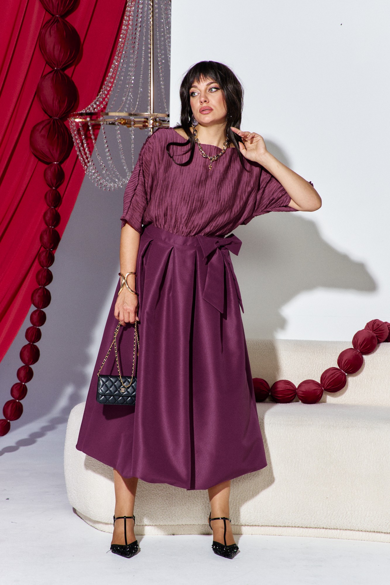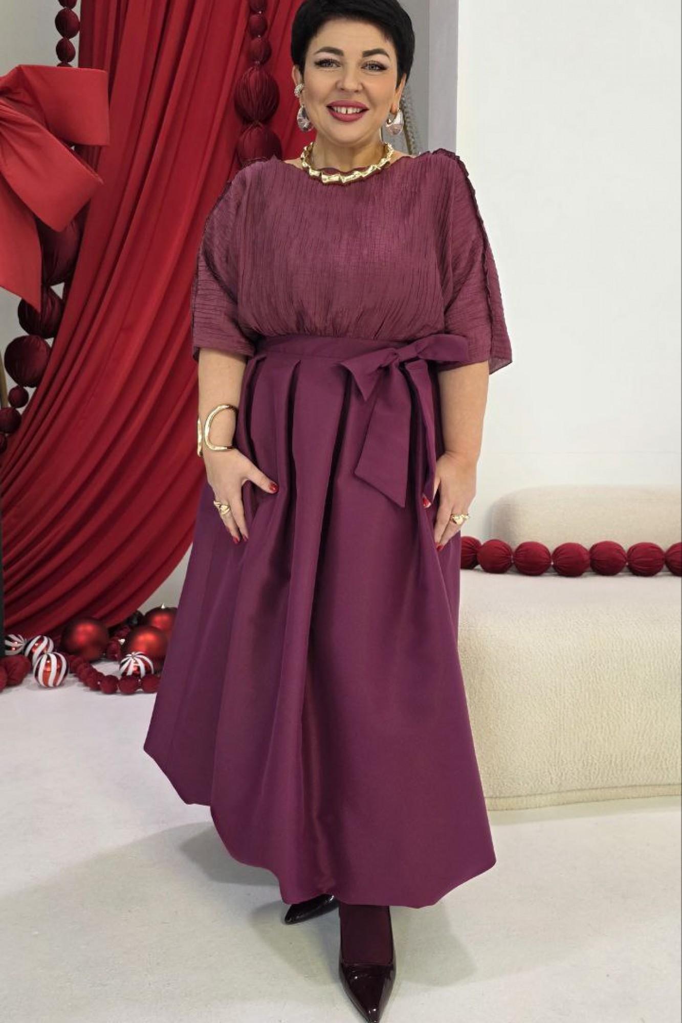 Невероятно красивое и элегантное платье отвечает всем требованиям вечернего наряда! Сочетание тканей разных фактур и дизайнов в одной модели - тренд сезона. Это элегантное платье миди состоит из двух частей, создающих впечатление комплекта. Верхняя часть платья выполнена из плиссированной ткани, что придаёт ему текстурный и динамичный вид, а юбка с атласным блеском придаёт изделию нарядность, гармонично дополняющего верх. Высокая талия юбки визуально удлиняет фигуру. Общий ансамбль выглядит изысканно и подходит как для повседневных, так и для более официальных мероприятий. Сочетание различных фактур и оттенков зелёного создаёт глубокий и сложный образ. Дополнительные детали, такие как золотые украшения и туфли с шипами, придают платью особый шарм. Платье приталенного силуэта, с округлой формой горловины, рукав цельнокроеный, длинной ¾. В плечевом шве платья декоративная вставка рюши. Лиф платья на подкладке. Пояс в платье притачной со вставкой резинки по спинке, с застроченными складками от пояса по юбке платья. Юбка в платье «баллон», на подкладке. Пояс в платье декорирован бантом в виде съемной броши.