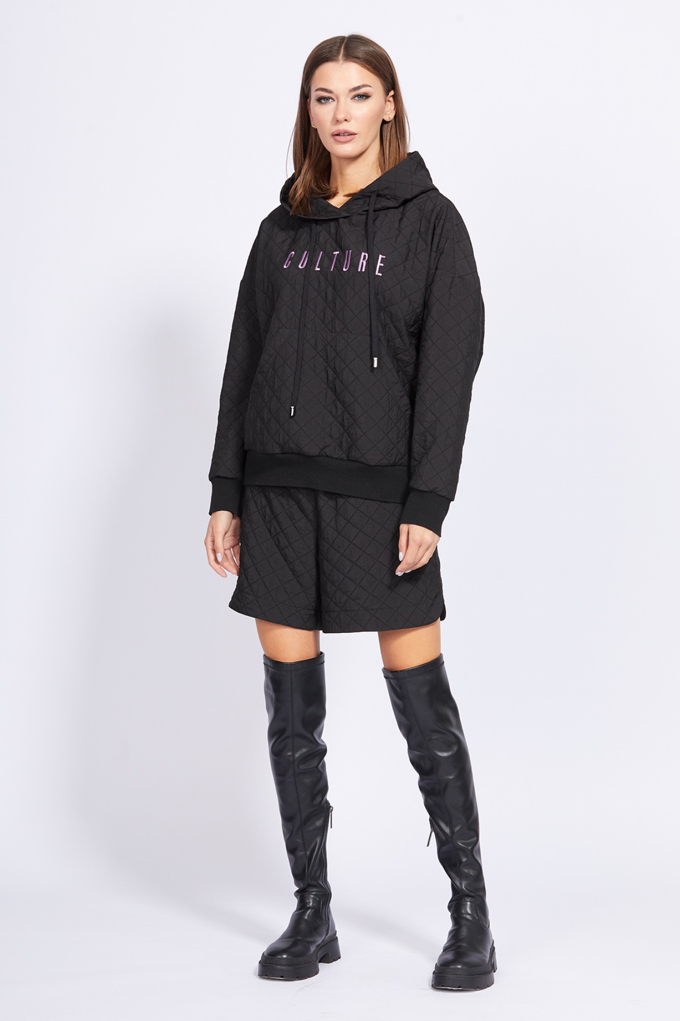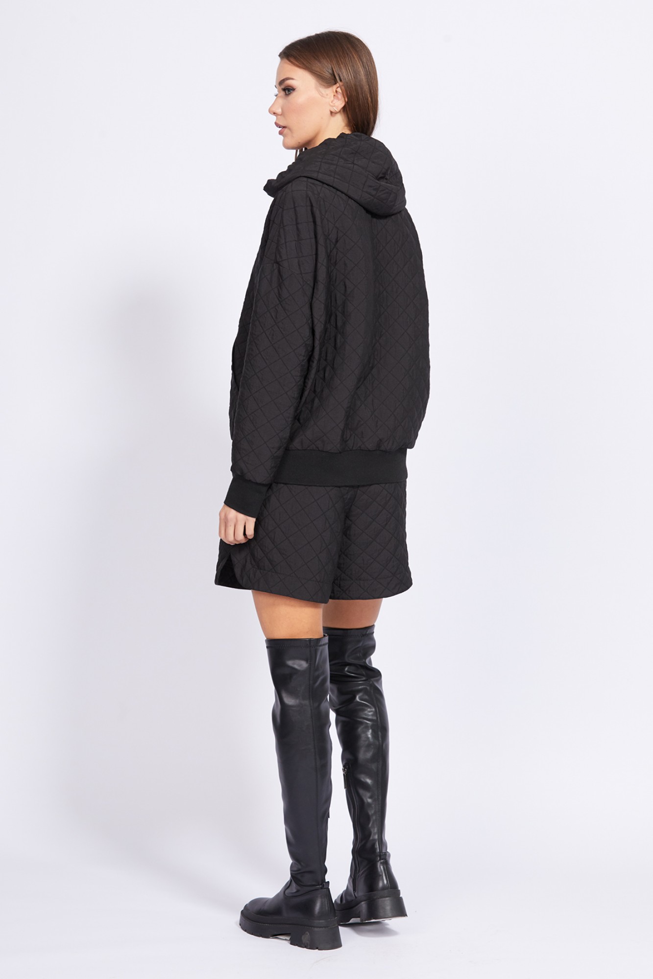 Шорты выполнены из костюмно-плательной ткани, имитирующей стежку. Шорты на притачном поясе с эластичной тесьмой, прямого силуэта, длиной выше линии колена. Спереди боковый карманы с наклонным входом. В боковых швах фигурные разрезы.
