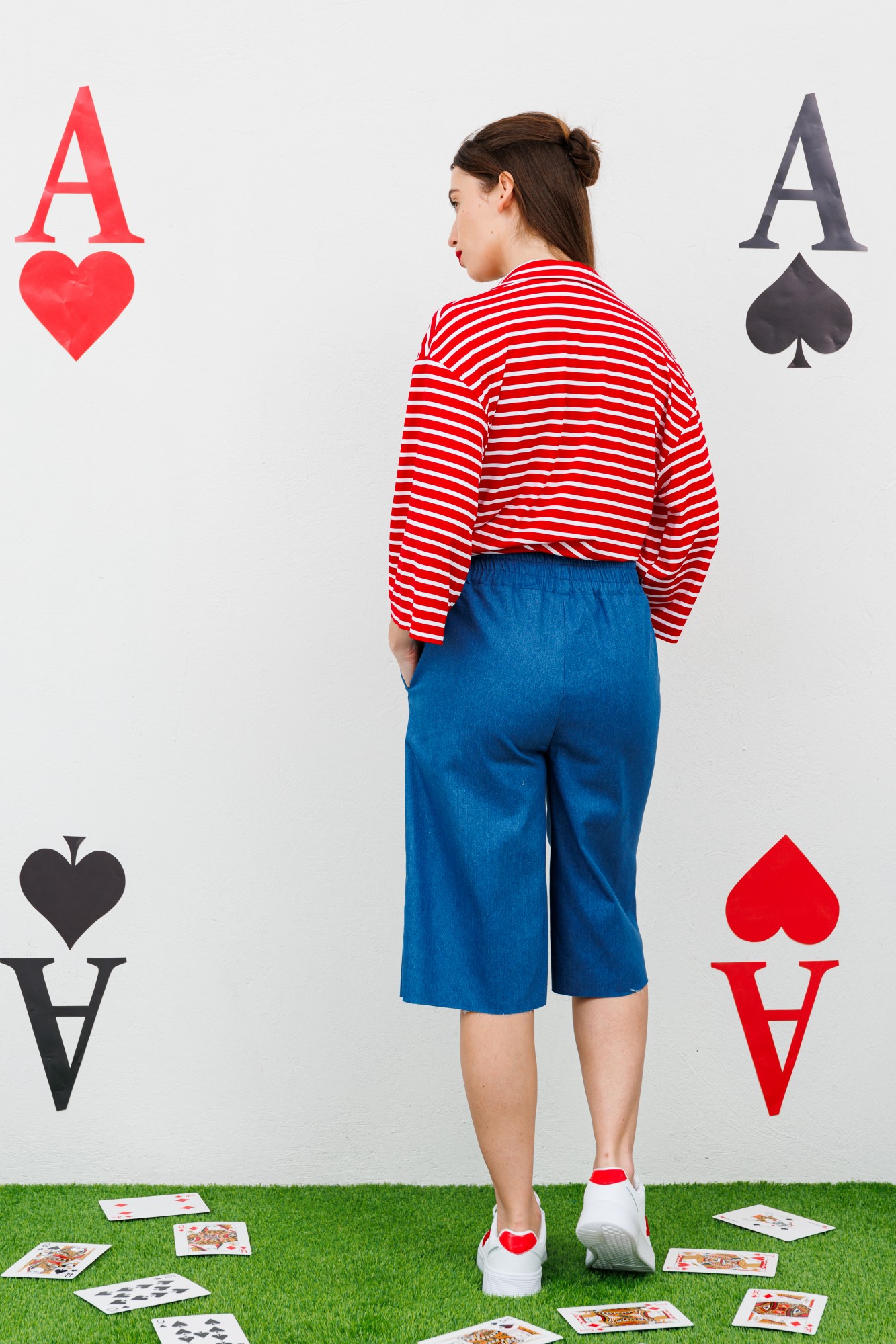 Удлиненные шорты прямого кроя, верхний срез представлен широкой резинкой, с карманами. Низ изделия не обработан.