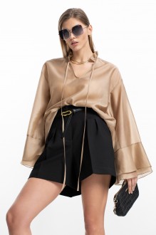 Шорты прямого силуэта. На передних половинках заутюжены стрелки, переходящие в складки по линии талии. Застежка-гульфик, по переду боковые наклонные карманы. Пояс стабильный по переду, по задней части шорт на резинке, с настроченными шлевками и застежкой на пуговичку.