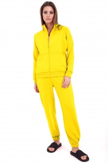 Стильный женский костюм спортивного стиля, свободного кроя, состоящий из брюк и джемпера. Манжеты рукавов, планка по низу изделия, воротник, пояс брюк выполнен из ткани-компаньена кошкорсе в цвет основной ткани. Джемпер с цельнокроеным рукавом, с застежкой -молнией по центру, с модельными треугольными резами на переде. Удобные карманы в нижней части полочки, вышивка- логотип на левом стороне в цвет ткани. Брюки зауженные с высокой посадкой на талии, боковые карманы на передних половинках брюк. Пояс с резинкой внутри.