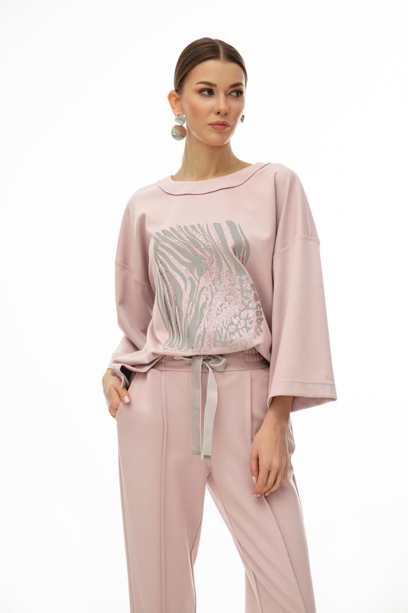 Костюм женский состоящий из джемпера и брюк. Джемпер прямого силуэта. Перед цельнокроенный, декорирован авторским принтом. Плечо спущено. Рукав одношовный, длинный. На боковой шов и шов рукава настрочена декоративная тесьма. Горловина округлой формы, обработана обтачкой «на лицо». Брюки полуприлегающего силуэта. Пояс притачной, частично на эластичной резинке, с декоративной шнуровкой. По переду отстрочены стрелки. В боковых швах расположены карманы с отрезным бочком. Низ с широкой подгибкой. Длина джемпера по спинке 62 см.