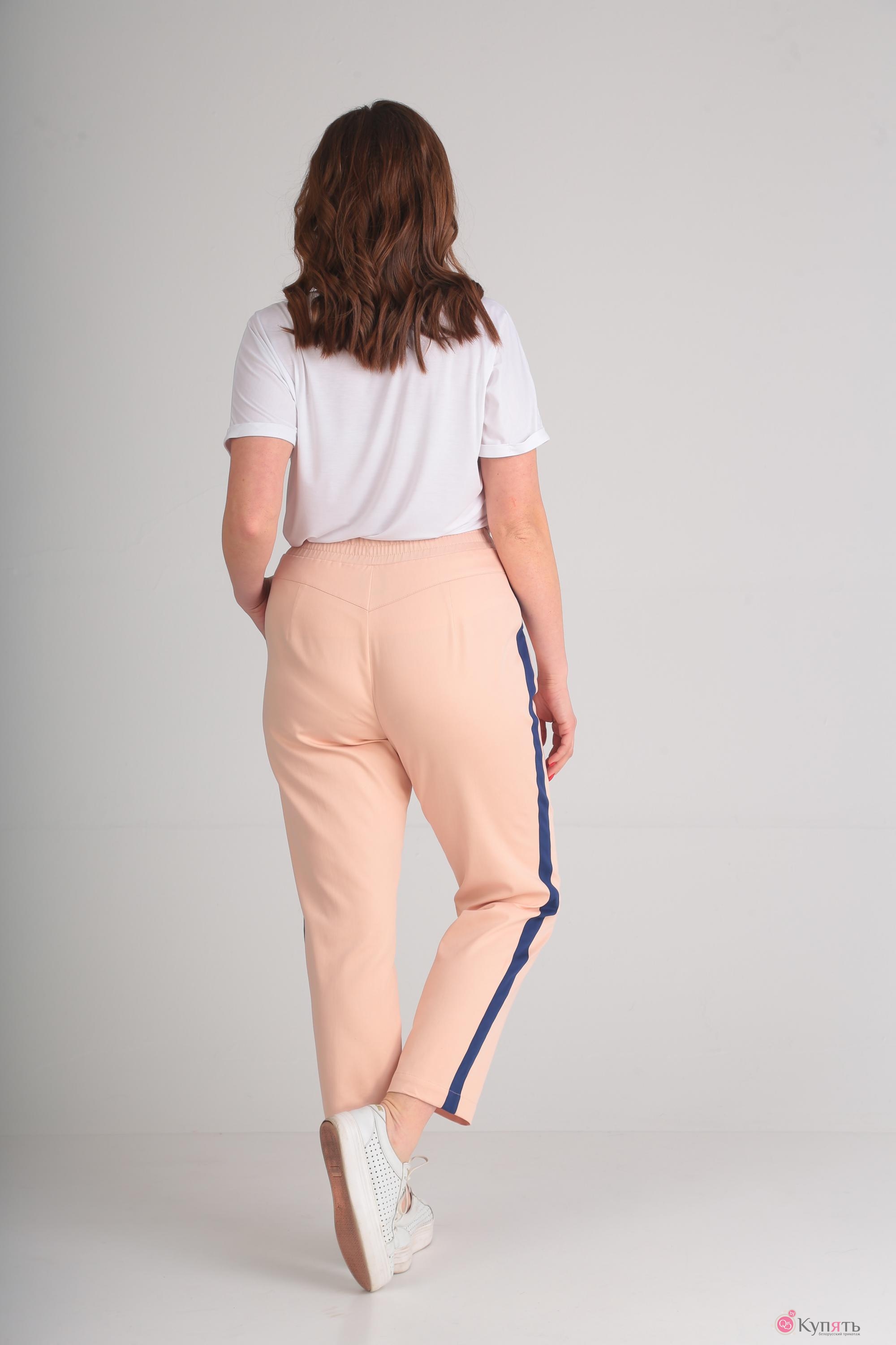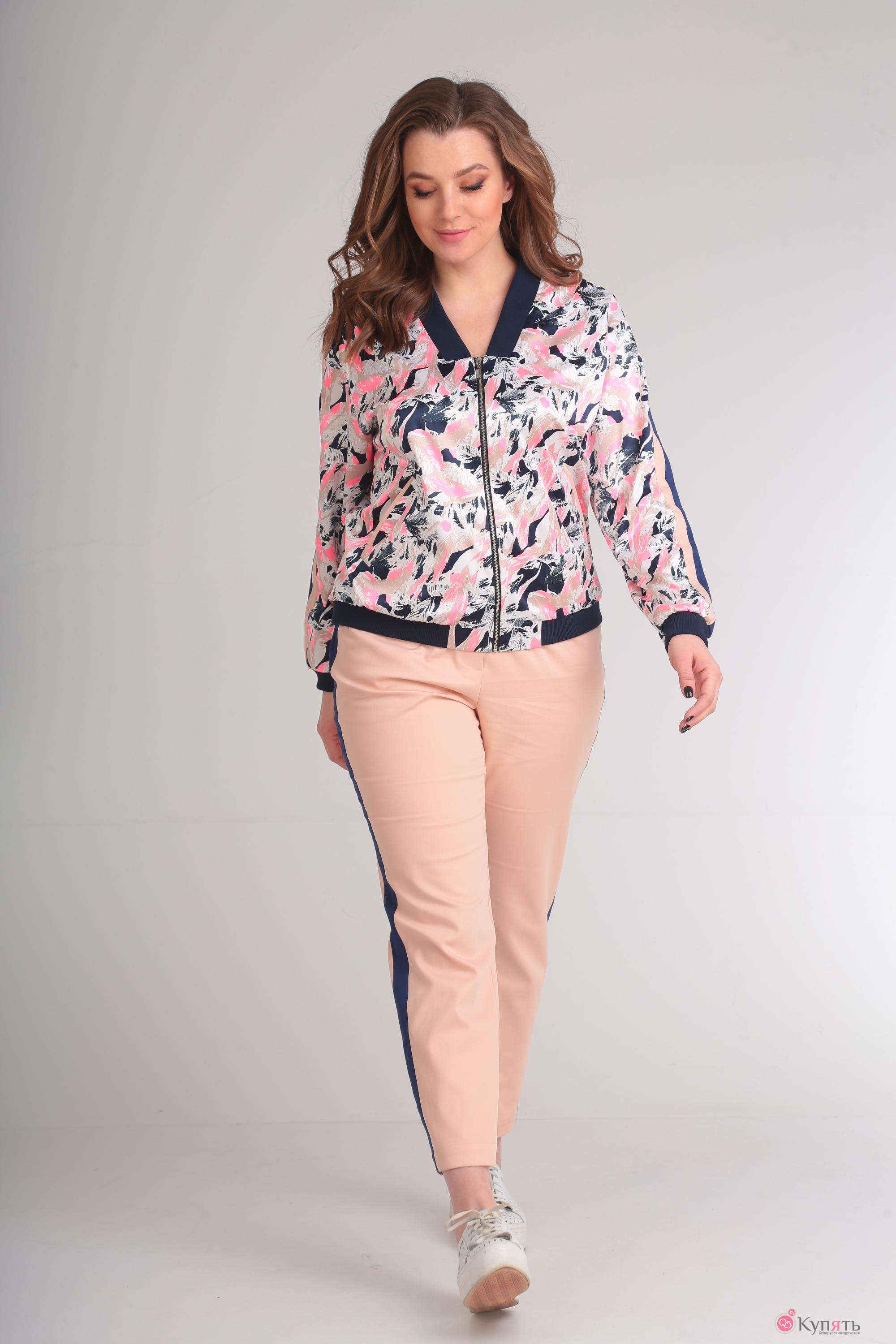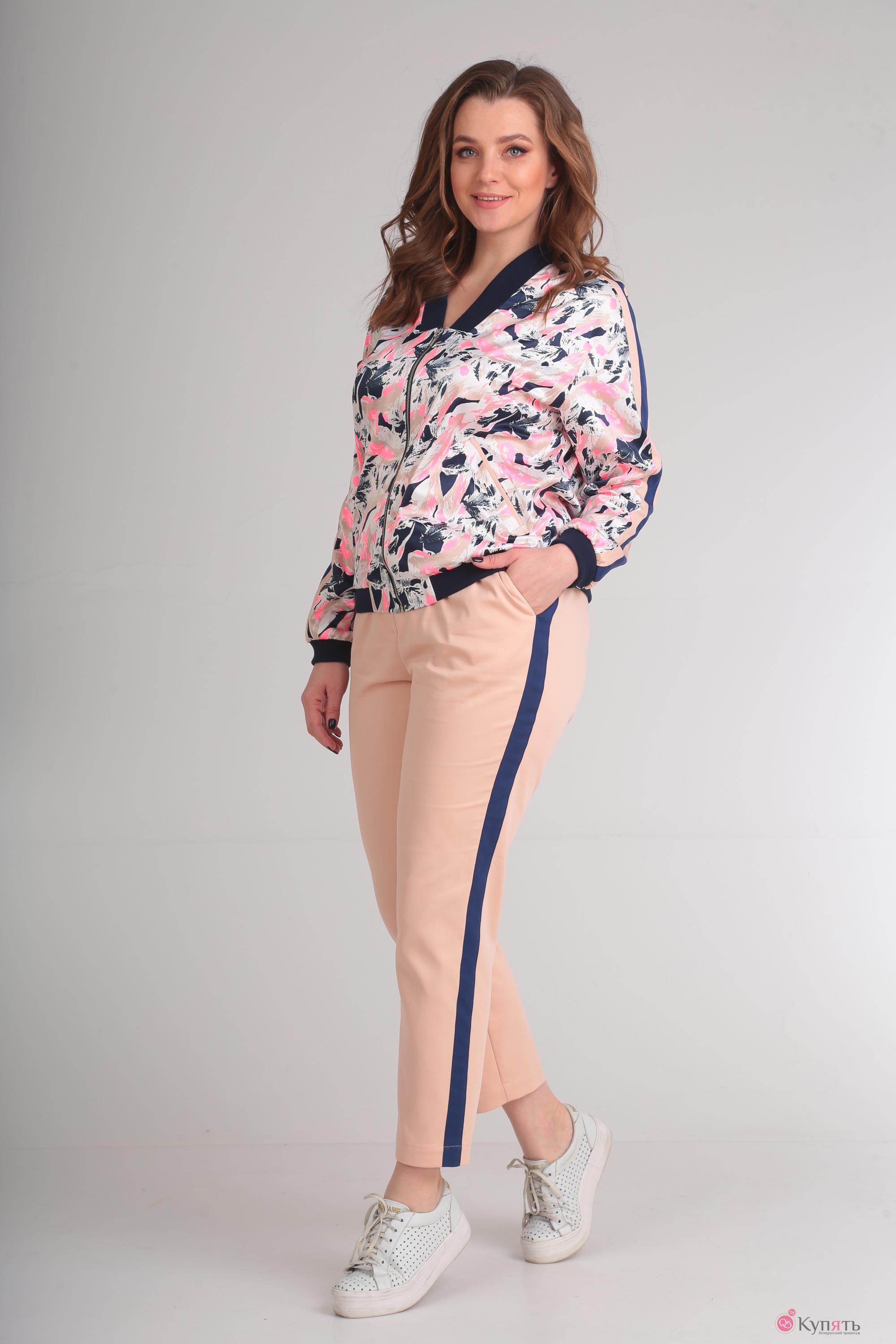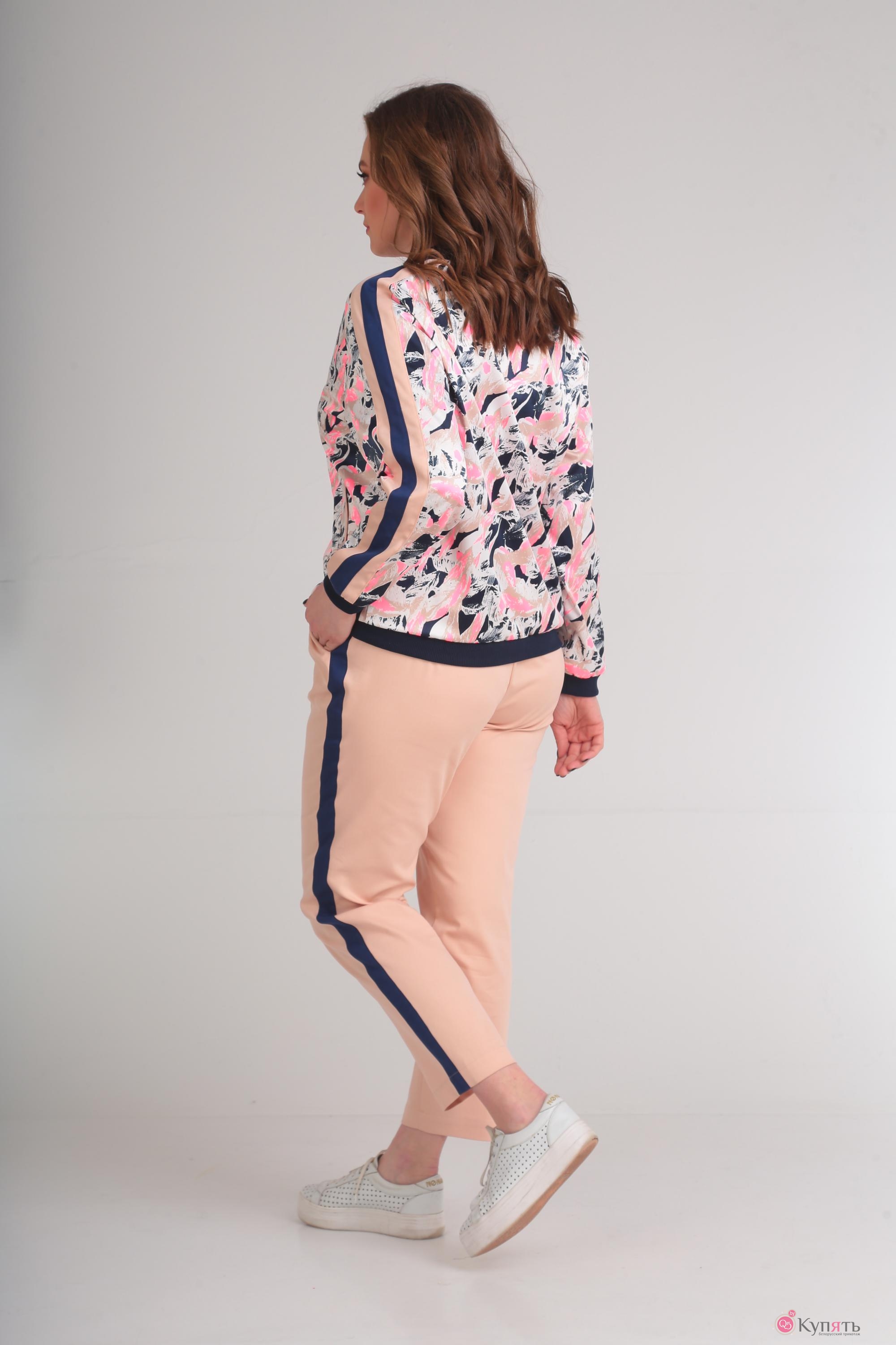 Комплект состоит из жакета, брюк и блузки. Жакет выполнен из ткани с набивным рисунком. В качестве отделки использована однотонная ткань контрастных цветов и трикотажное однотонное полотно в рубчик. Полочка жакета с центральной застежкой на молнию, в нижней части полочки выполнены карманы с листочкой. Горловина V-образной формы, с воротником из трикотажного полотна в рубчик. Спинка цельная, низ жакета на притачной планке из трикотажного полотна. Рукав длинный, по низу на притачной манжете из трикотажного полотна. По верхней части рукава от горловины до низа рукава элемент в виде контрастных однотонных планок. Блузка выполнена из однотонного трикотажного полотна. Блузка со спущенным, цельнокроеным рукавчиком с притачной манжетой. По центру полочки в верхней части выполнена термоапликация. Брюки слегка свободны в бедрах и заужены к низу. По передним половинам выполнены карманы. По задним половинам талиевая вытачка и кокетка. По боковому шву планка контрастного цвета. Пояс притачной с эластичной тесьмой и кулисой.