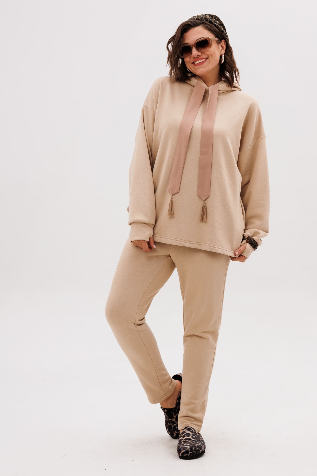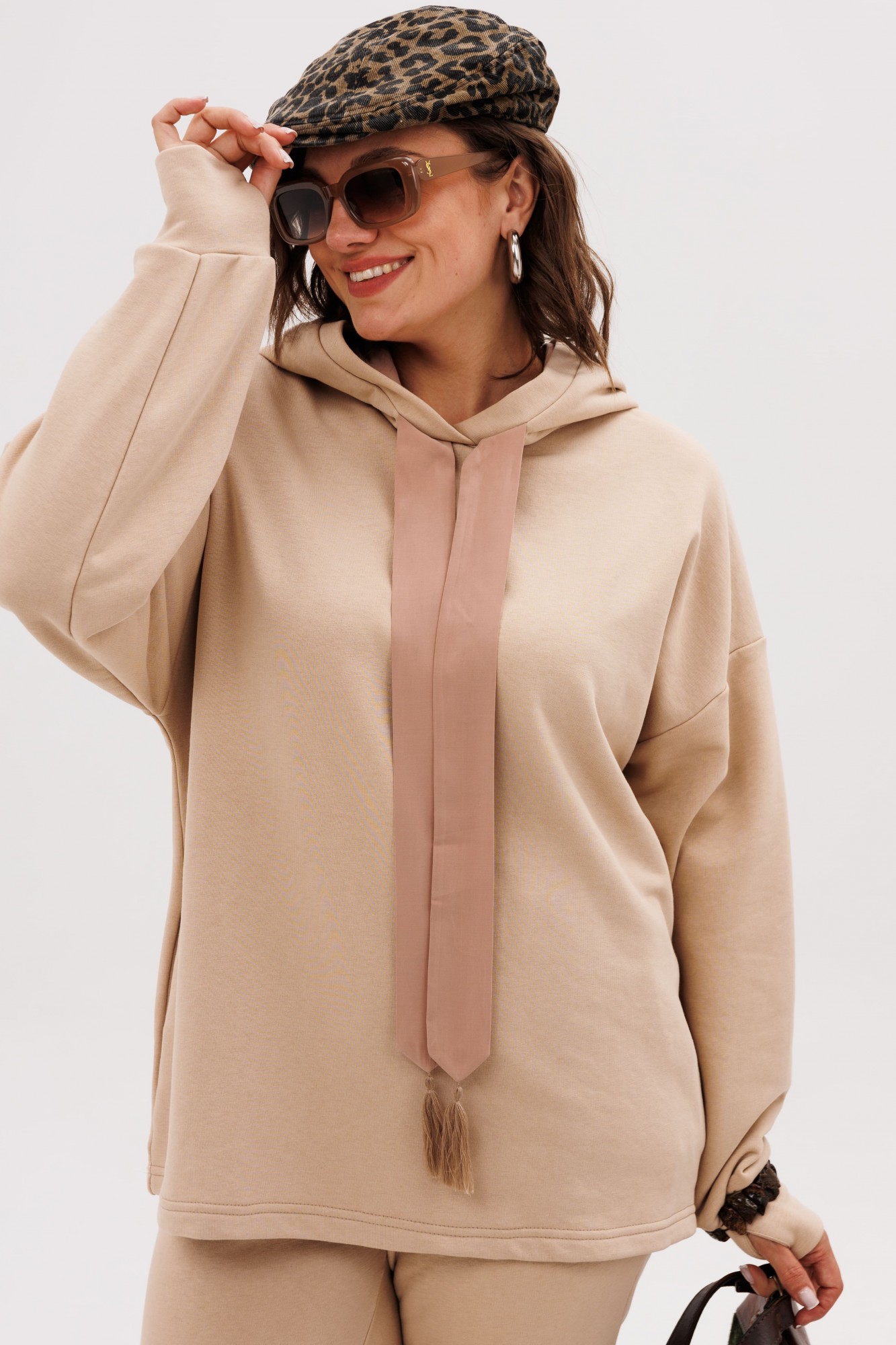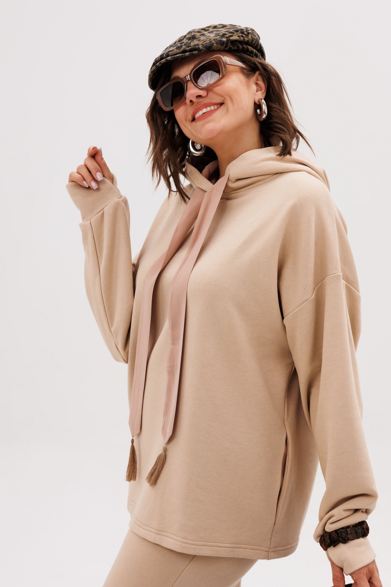 Худи свободного кроя дополнен практичными деталями: удобный капюшон на подкладке, функциональные карманы, скрытые в боковых швах. Декоративные элементы из ткани-компаньона придают модели индивидуальность.