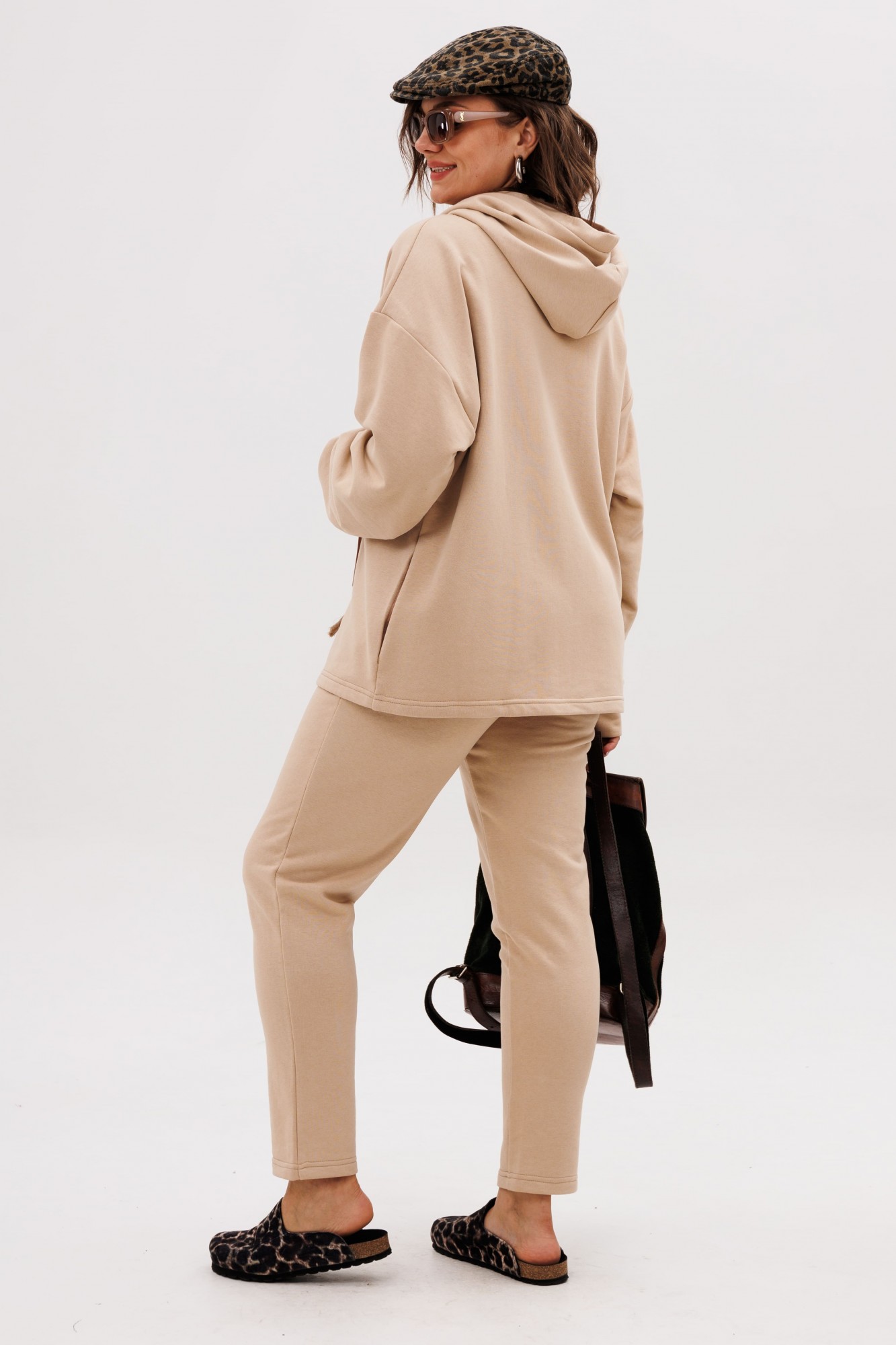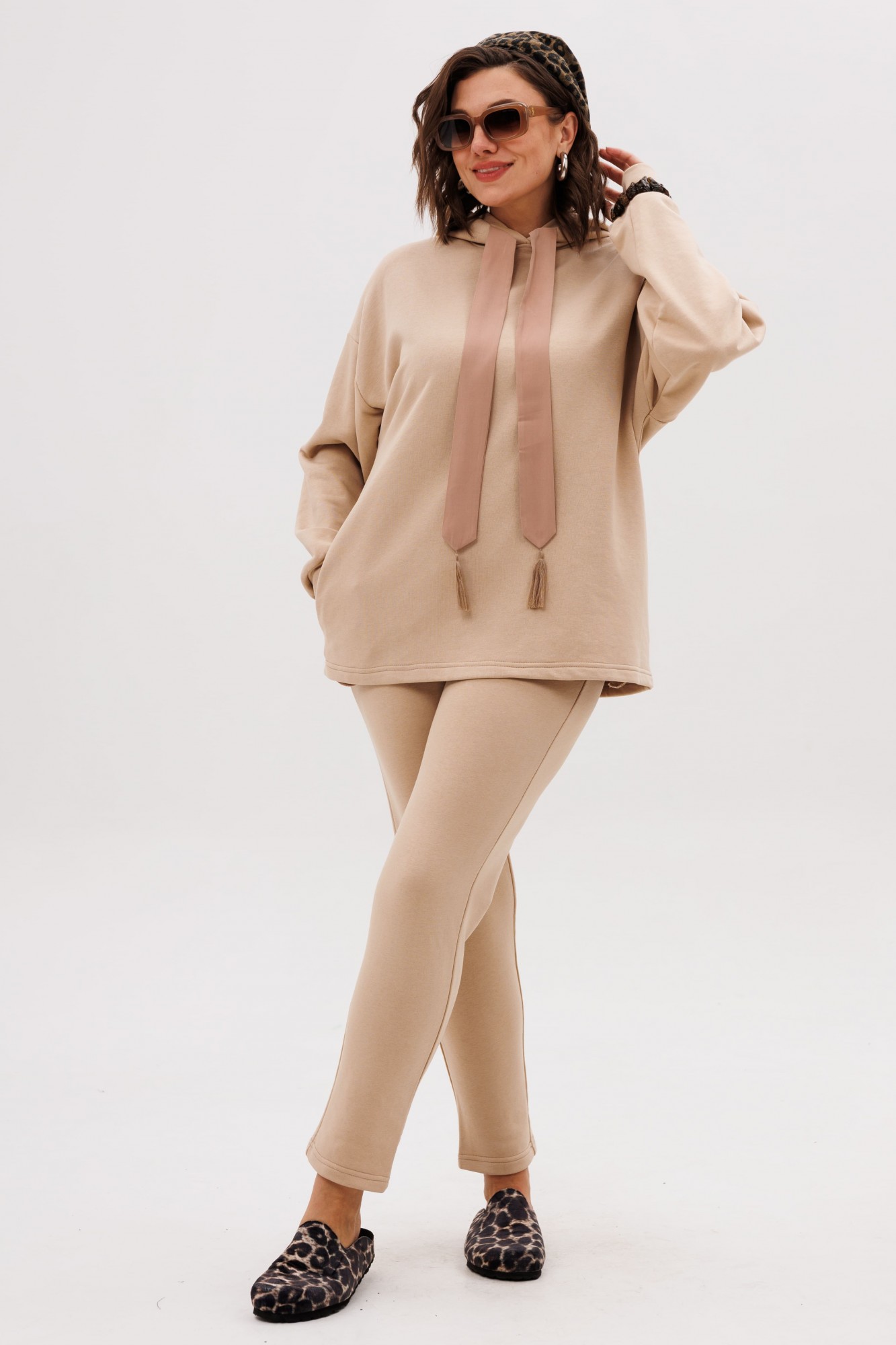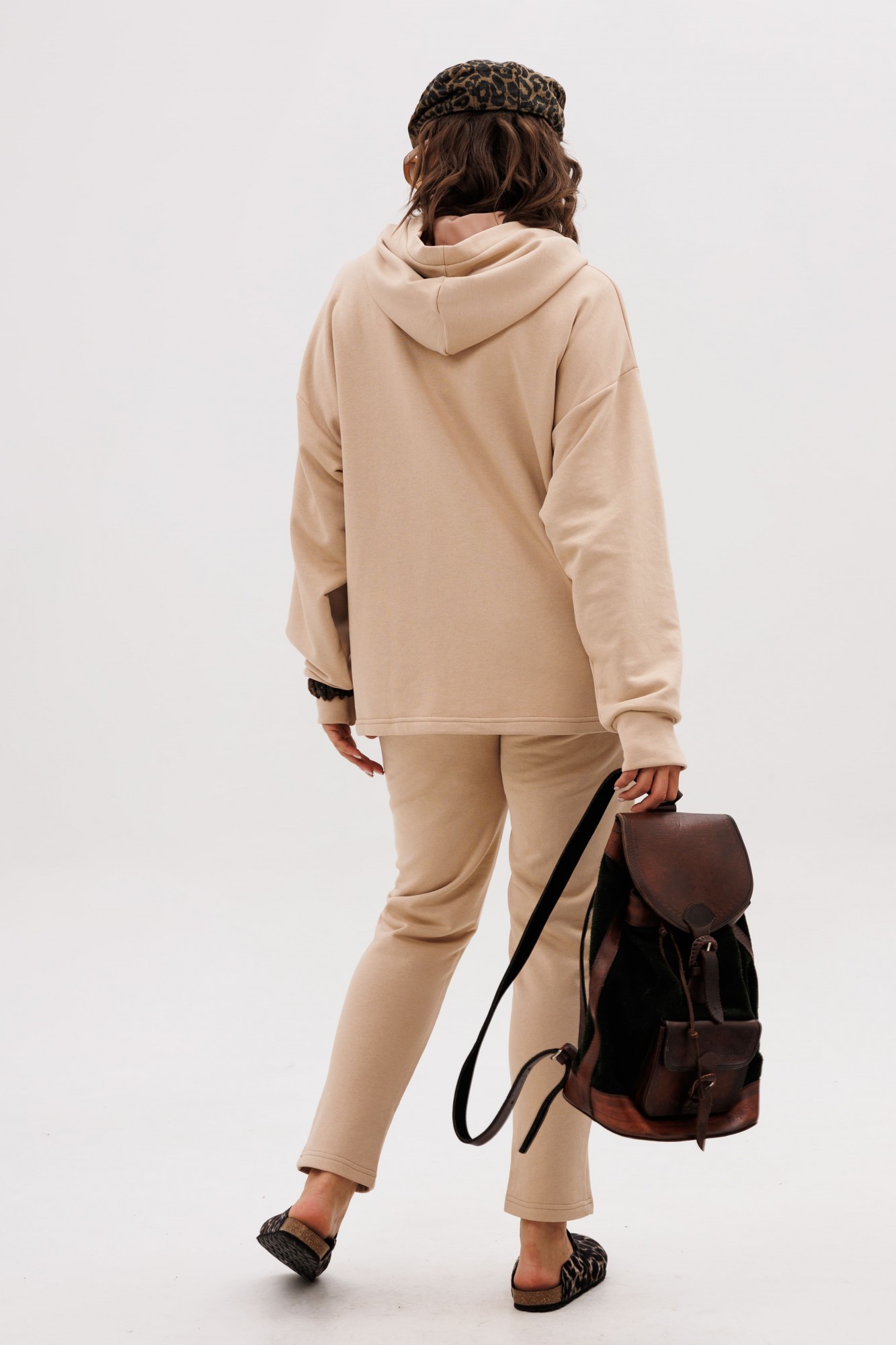 Худи свободного кроя дополнен практичными деталями: удобный капюшон на подкладке, функциональные карманы, скрытые в боковых швах. Декоративные элементы из ткани-компаньона придают модели индивидуальность.