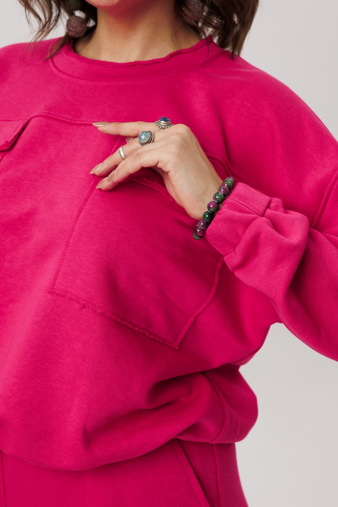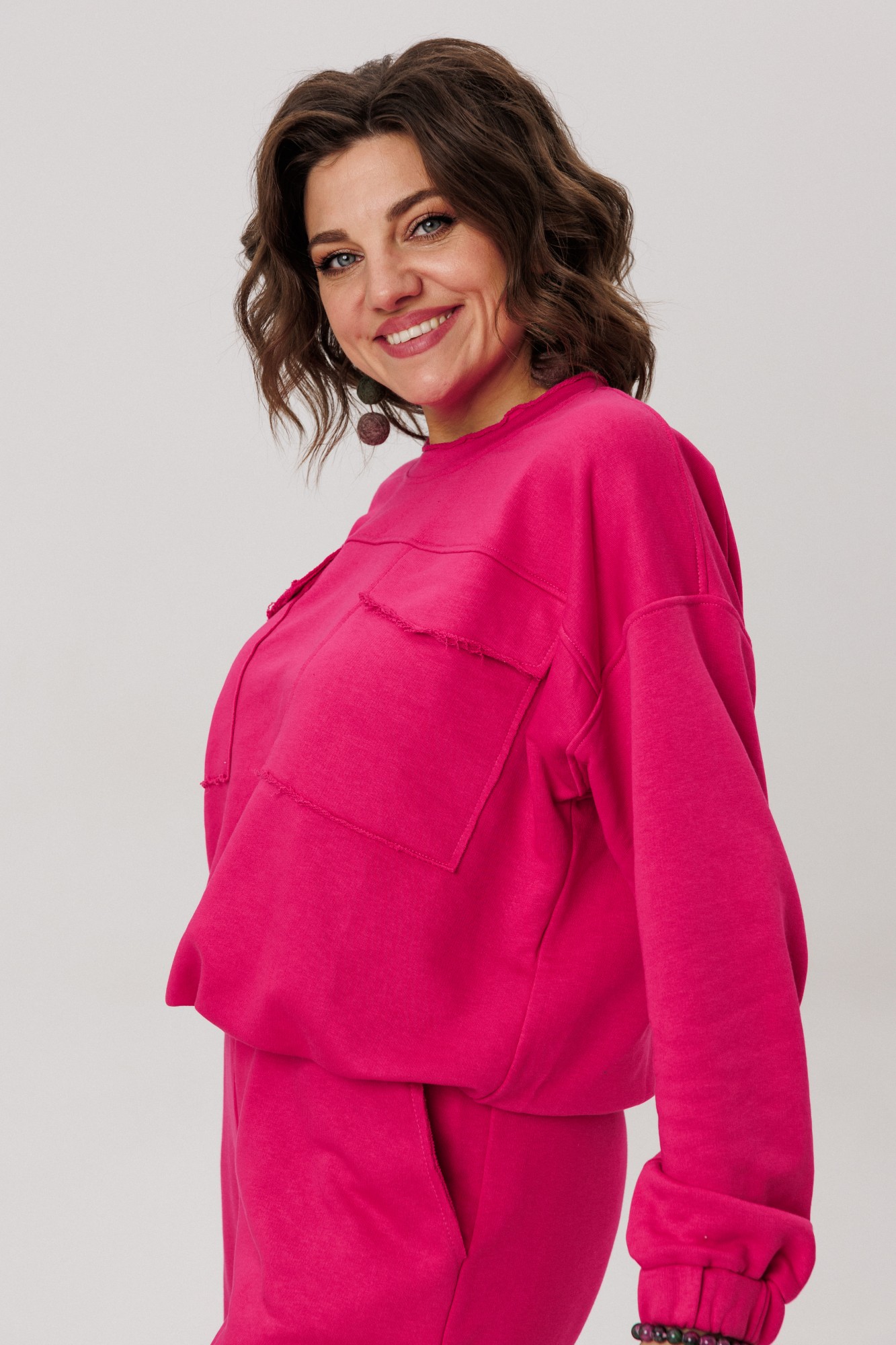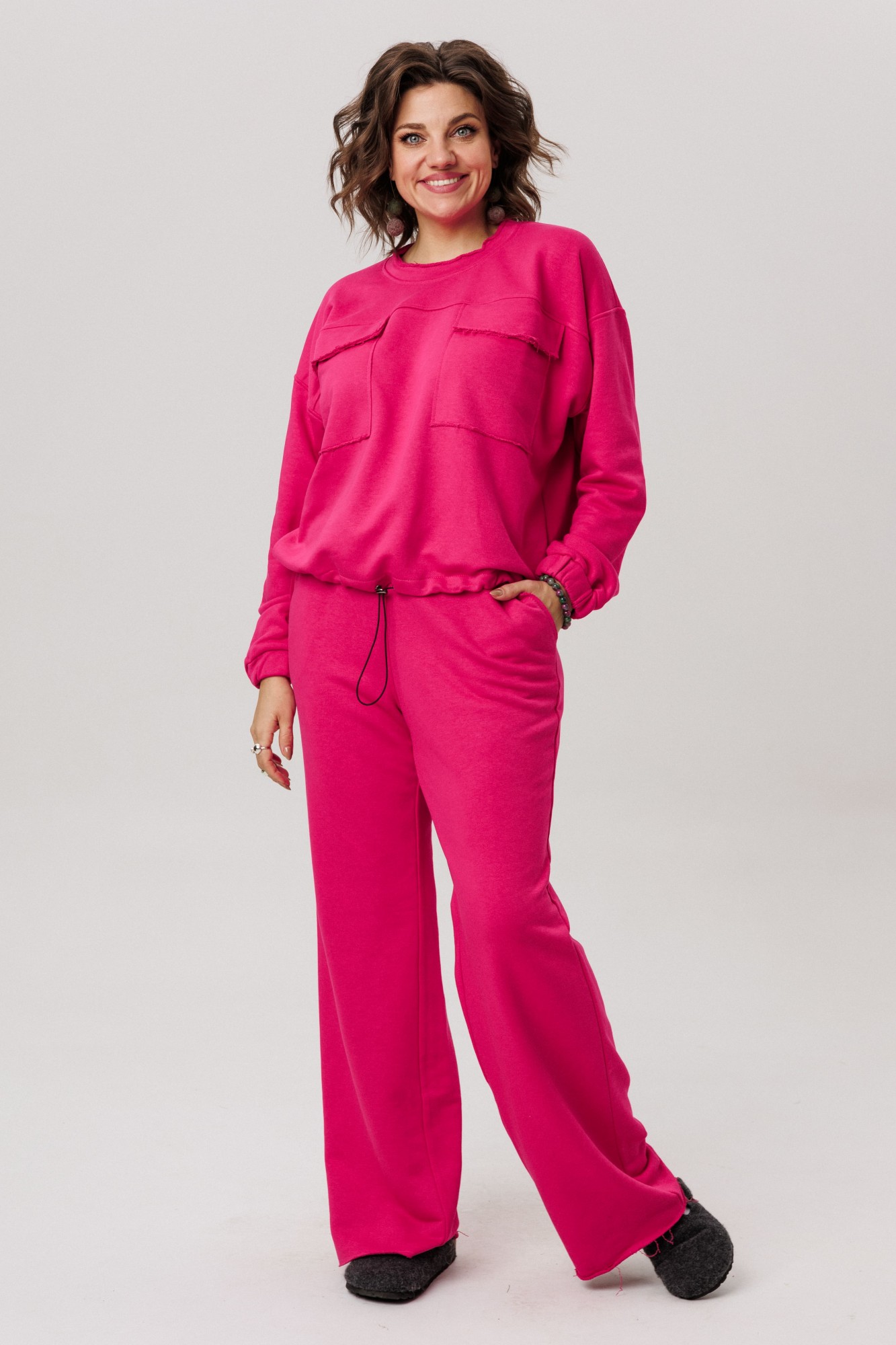 Верхняя часть костюма, выполненная в виде объемного свитшота, представляет собой мастерское сочетание расслабленных линий и продуманных деталей. Удлиненная линия плеча и длинные рукава струятся мягкими складками, завершаясь аккуратной манжетой. Фронтальная часть оформлена изящной отрезной кокеткой, а накладные карманы с клапанами, добавляюют образу тактильной выразительности. Низ свитшота, оформленный на кулиске, позволяет вам самостоятельно регулировать степень свободы и объем, делая силуэт именно таким, как вам хочется сегодня.