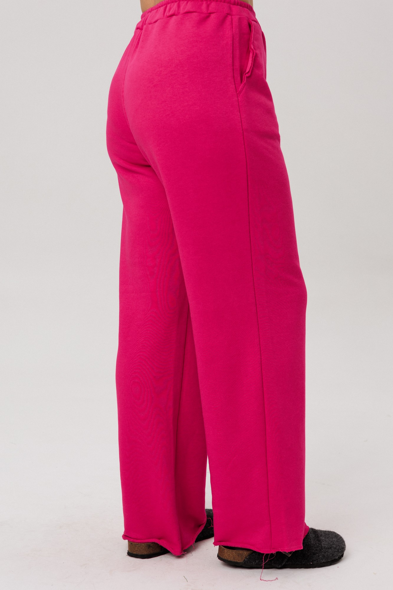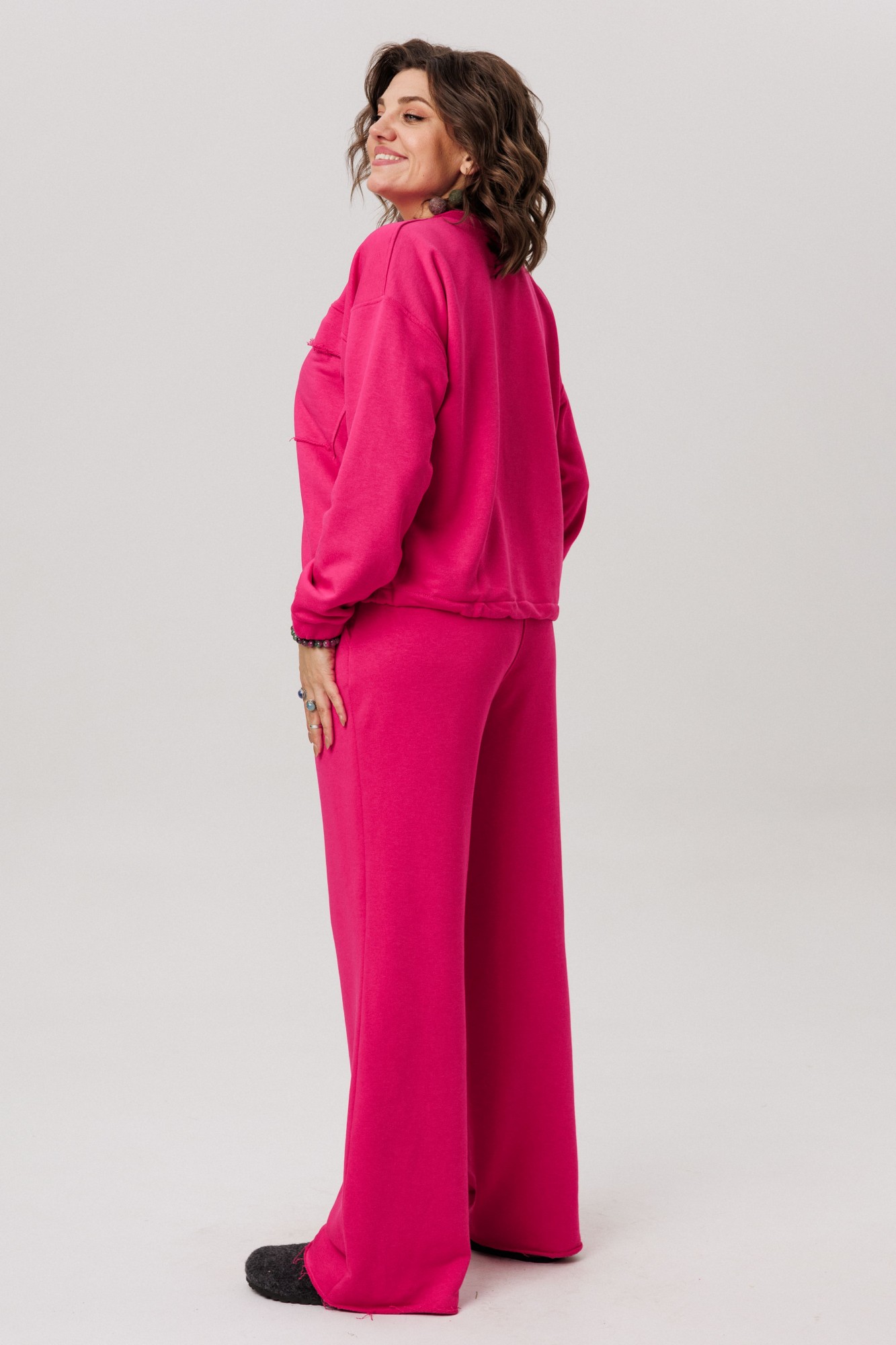 Брюки продолжают философию комфорта, предлагая прямую посадку на эластичном поясе, который мягко сидит по фигуре, не стесняя движений. Лаконичный дизайн дополнен практичными боковыми карманами. Подлинной изюминкой всего комплекта становятся намеренно открытые срезы, привносящие в образ ноту дерзкого шика.