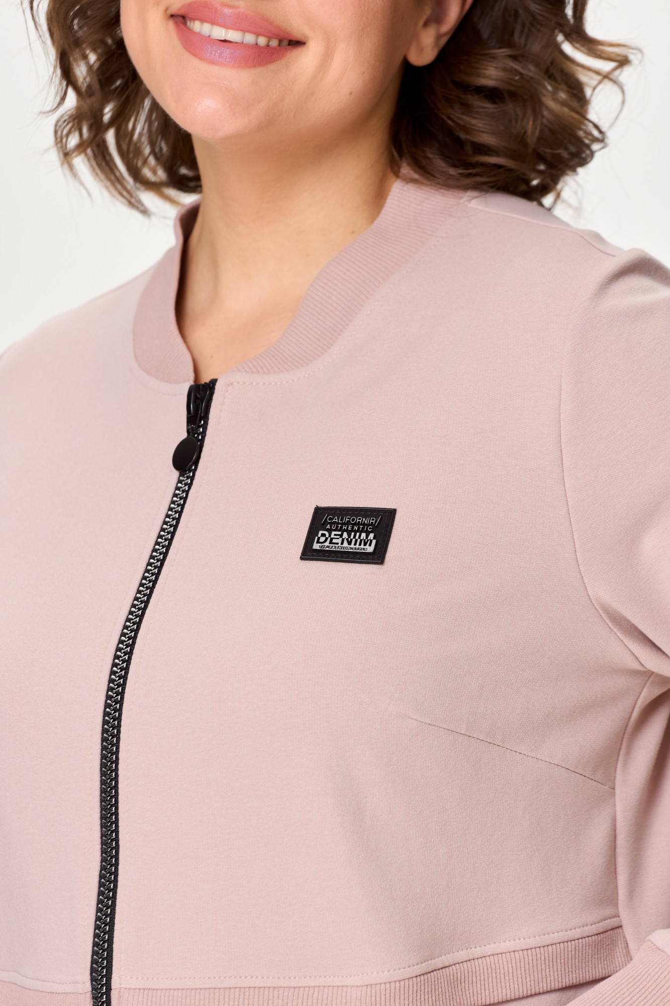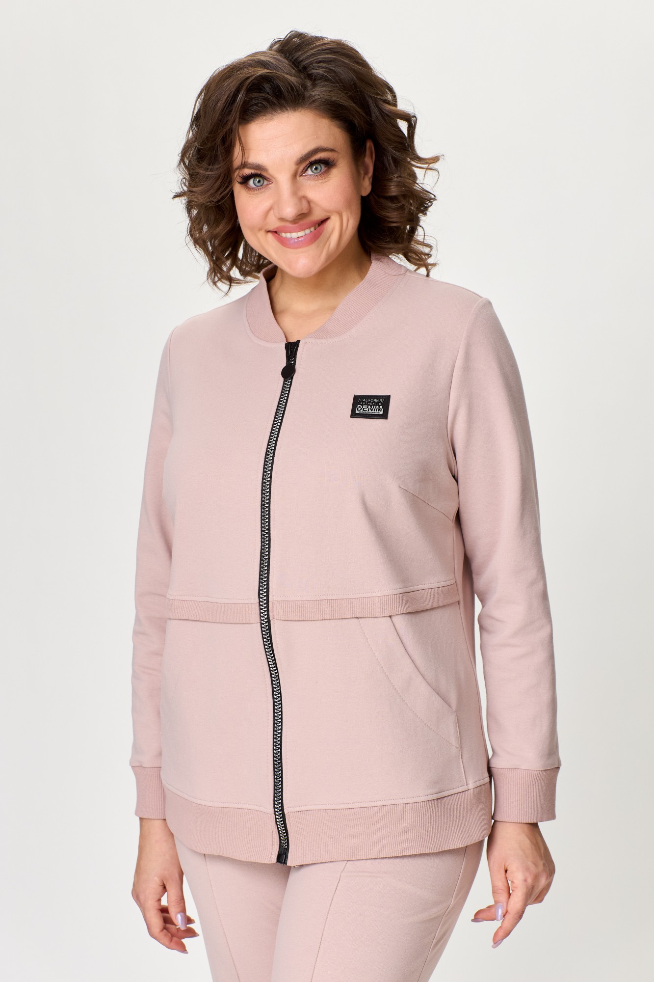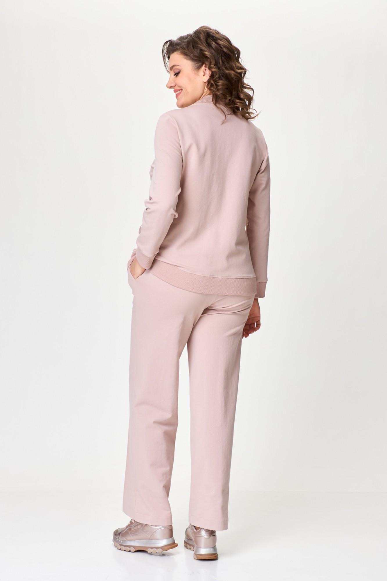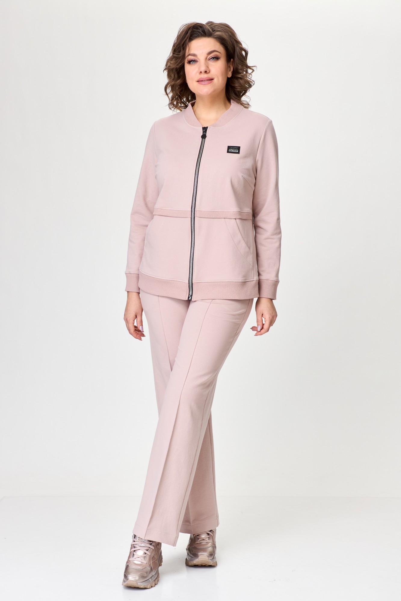 Спортивный женский костюм, выполнен из «футера», состоит из свитшота и брюк. Свитшот полуприлегающего силуэта с центральной застежкой на декоративную молнию. По переду отделка из довяза, в нижней части - накладные карманы «кенгуру», горловина и низ свитшота оформлен довязом. Рукава втачные, по низу довяз. Брюки прямые, со стрелкой по переду, в боковых швах на уровне бедер наклонные карманы, верх брюк на поясе с резинкой.