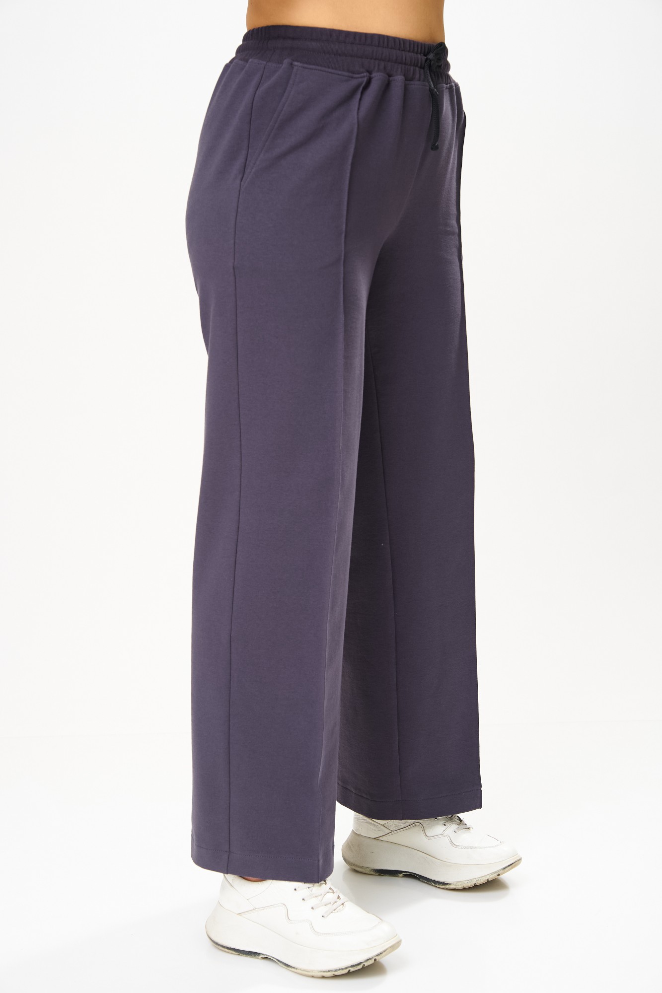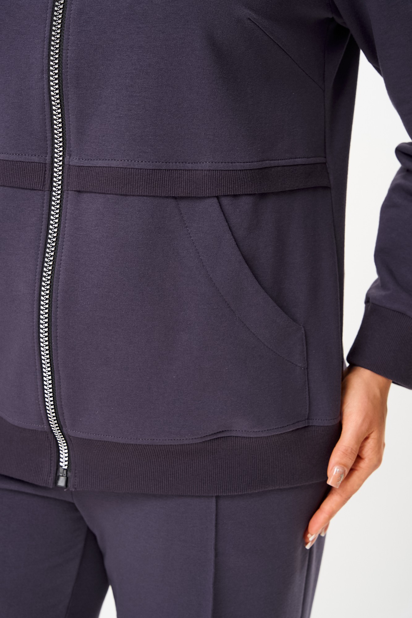 Спортивный женский костюм, выполнен из «футера», состоит из свитшота и брюк. Свитшот полуприлегающего силуэта с центральной застежкой на декоративную молнию. По переду отделка из довяза, в нижней части - накладные карманы «кенгуру», горловина и низ свитшота оформлен довязом. Рукава втачные, по низу довяз. Брюки прямые, со стрелкой по переду, в боковых швах на уровне бедер наклонные карманы, верх брюк на поясе с резинкой.
