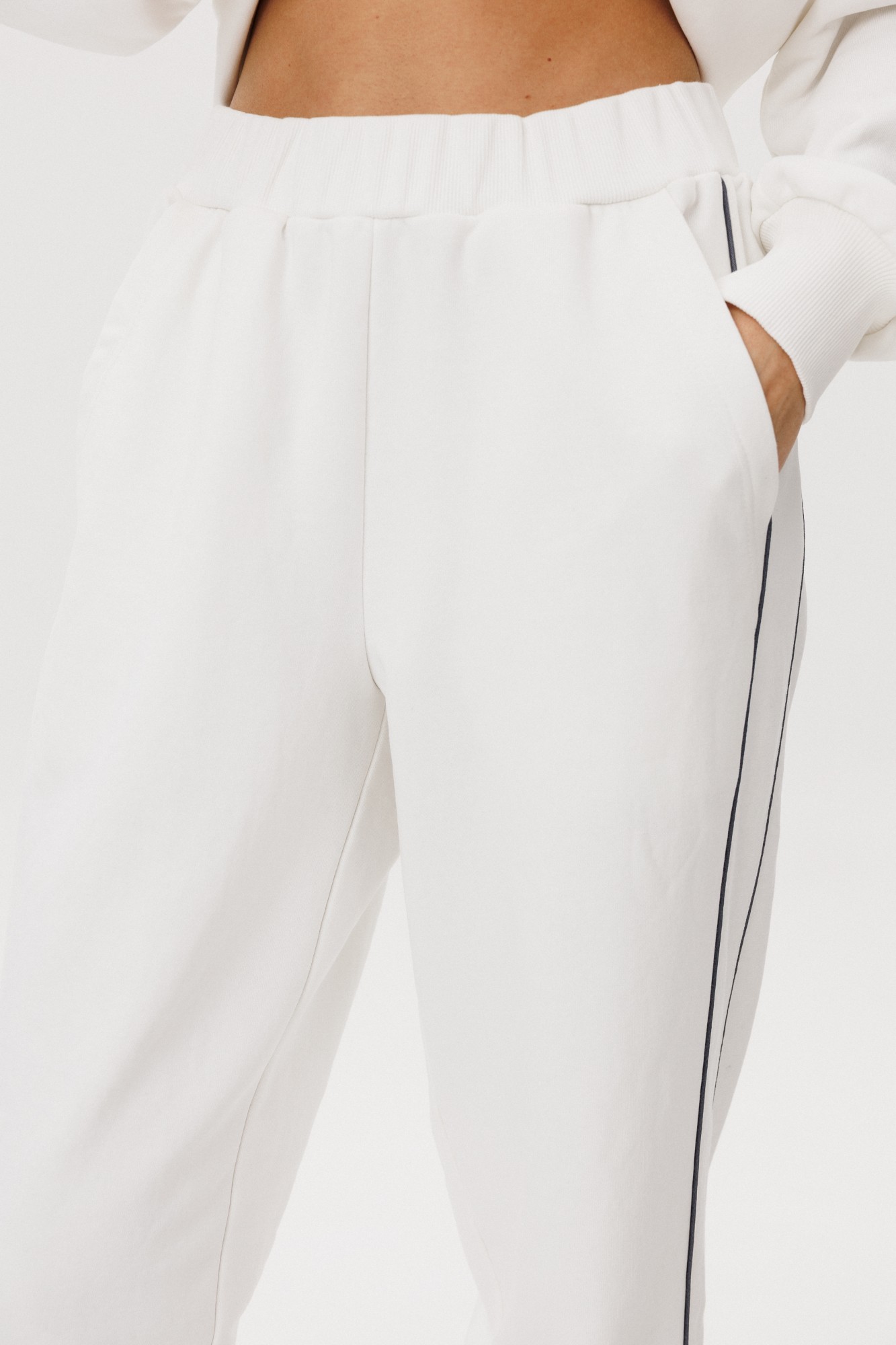 Спортивный костюм не предназначенный для занятия спортом, эдакая разновидность спортивной одежды в современной моде, выражающая характерную для спорта эстетику с помощью динамического кроя и отделки. Свободный свитшот покроя реглан с отделочными контрастными кантами по линии притачивая рукава и брендовой вышивкой на полочке. Брюки свободные, расслабленные, на эластичном поясе, с отрезным лампасом, декорированным отделочным кантом. По низу брюк-кулиса с эластичной тесьмой и фиксатором эффектно меняющая стиль брюк с прямого в "алладины".