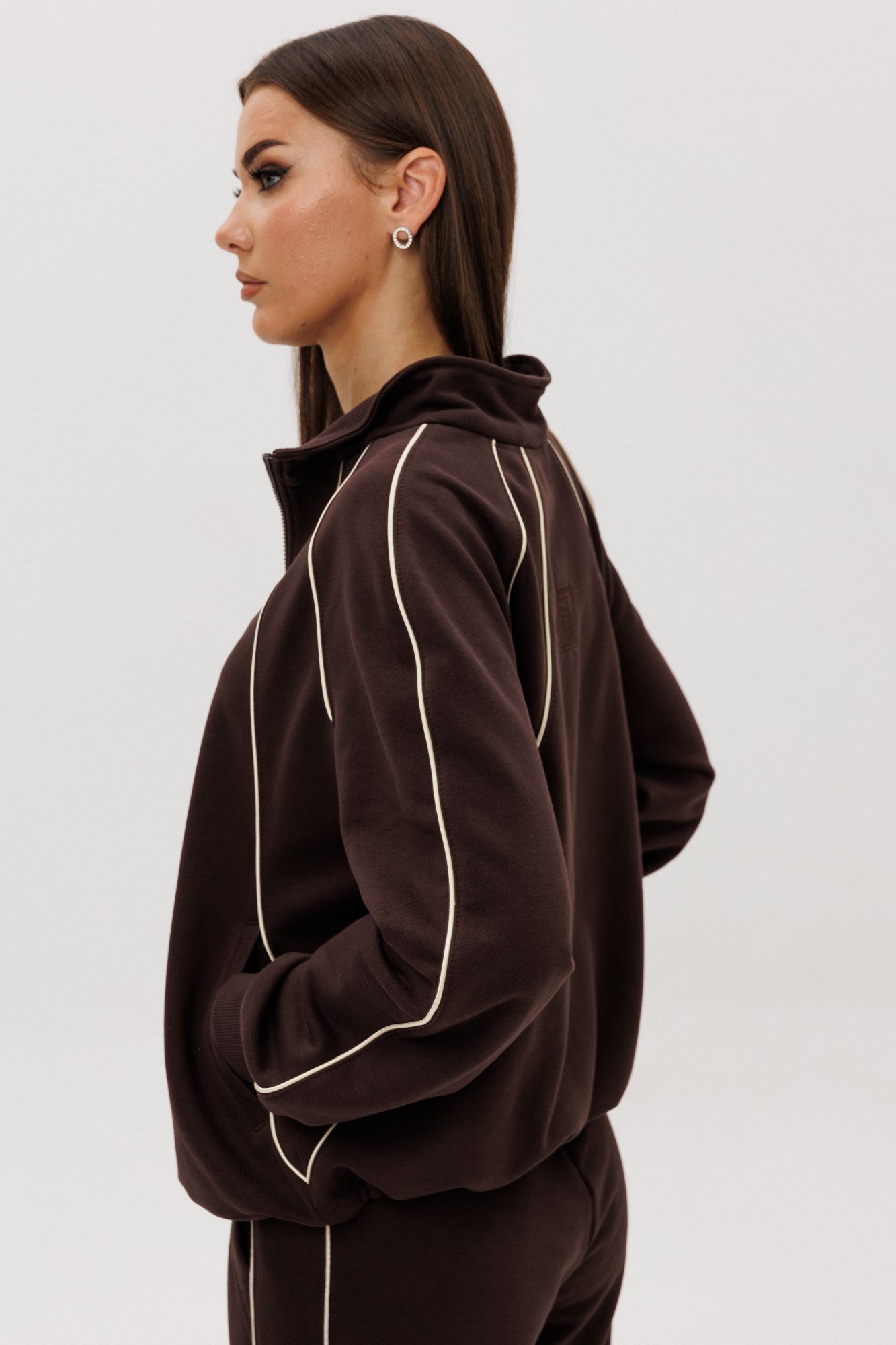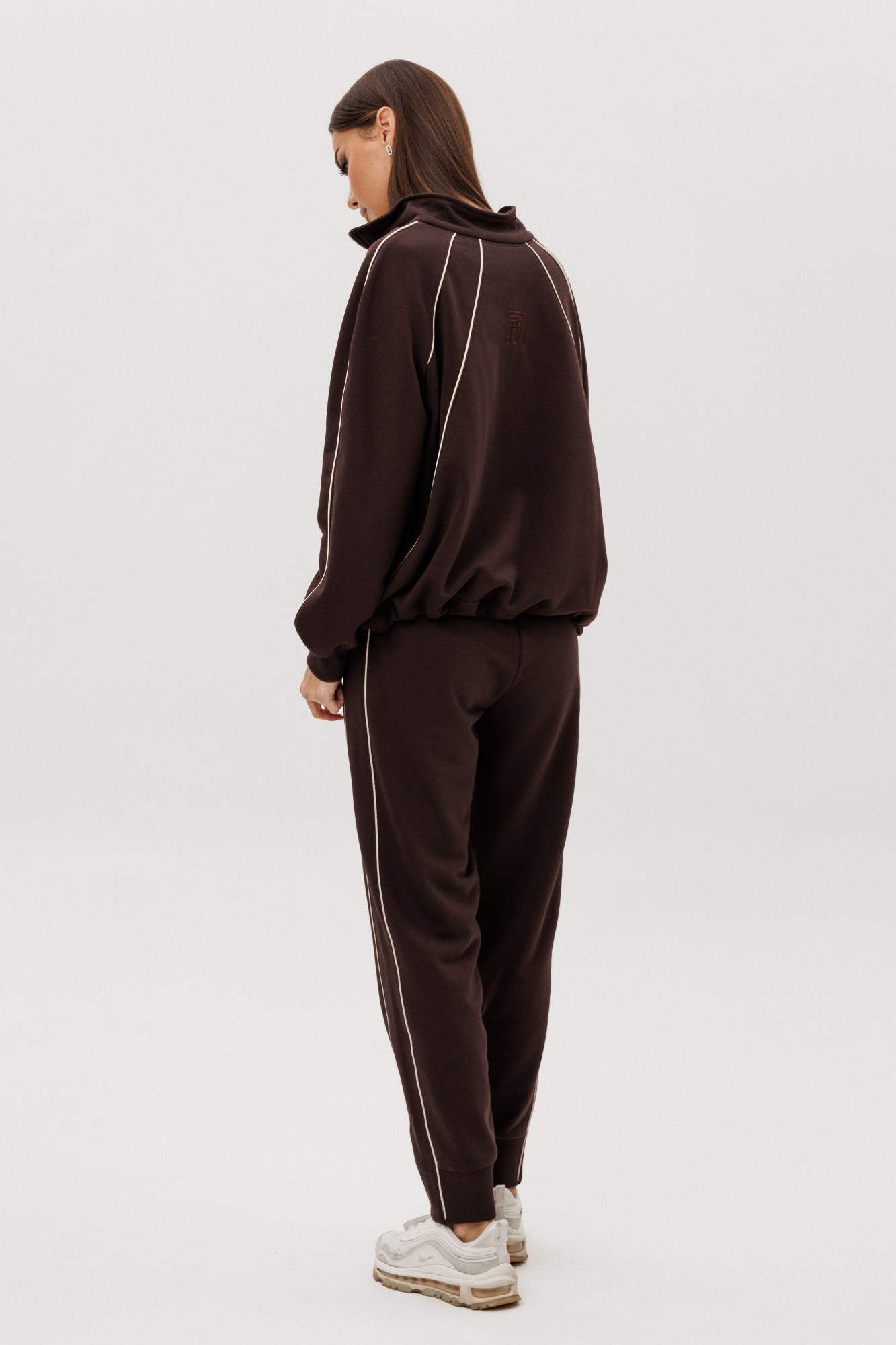 Современный костюм в стиле спорт-кэжуал — идеальный баланс комфорта и актуального дизайна. Модель выполнена из мягкого трикотажного полотна с добавлением хлопка, обеспечивающего приятные тактильные ощущения и свободу движений. Джемпер покроя реглан с аккуратной стойкой и застёжкой-молнией украшен контрастными кантами, придающими образу динамику. Брюки со слегка зауженным силуэтом и манжетами по низу дополнены эластичным поясом для удобной посадки. Костюм легко интегрируется в повседневный гардероб — от прогулок до путешествий и отдыха в городе.
