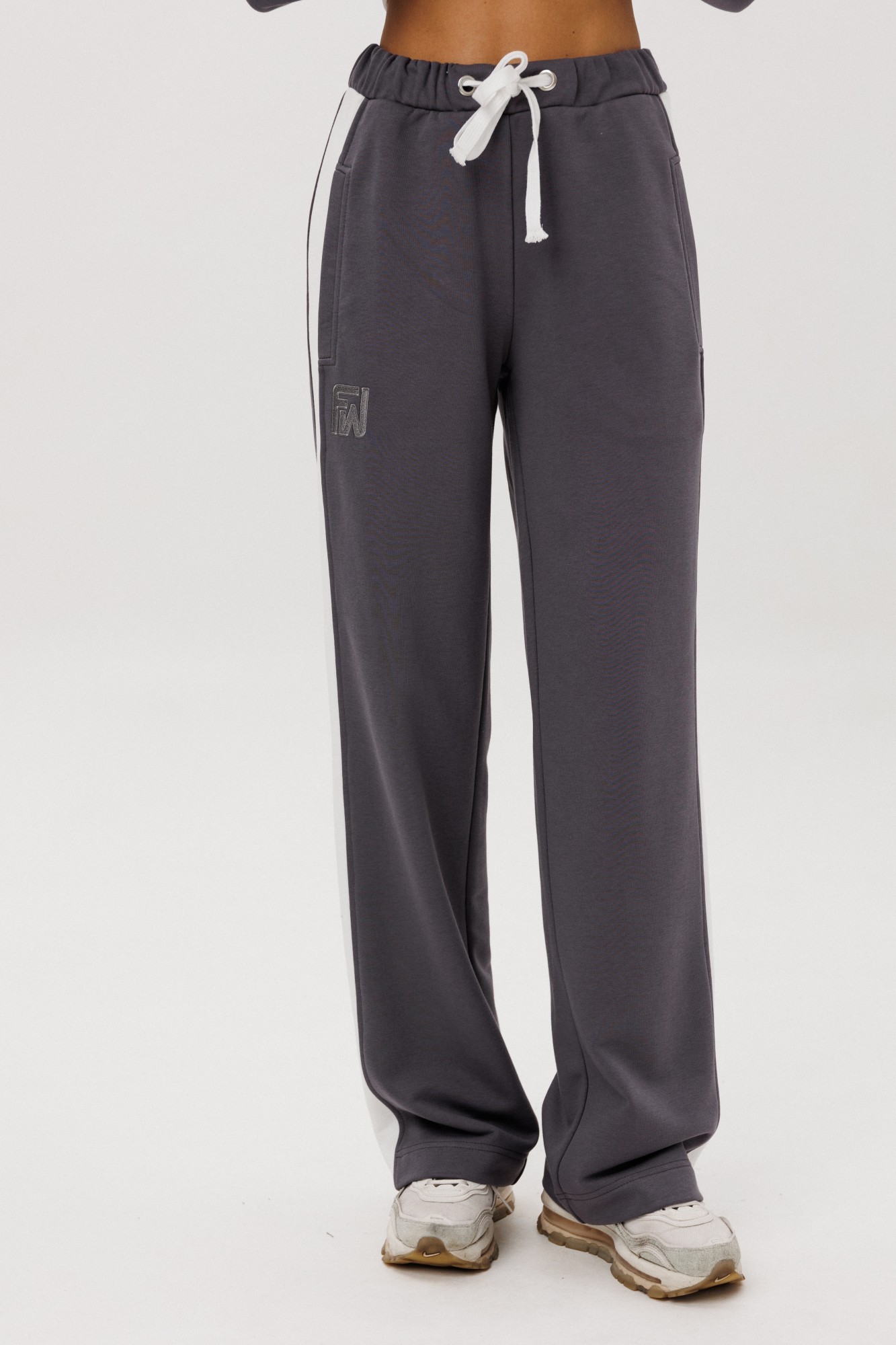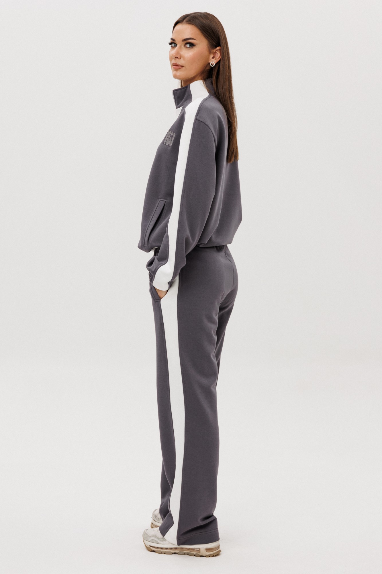 Комфорт - один из ключевых трендов современной действительности, который отлично реализуется в контексте стиля спорт-кэжуал. Его выбирает тот, кто не желает ограничивать себя жёсткими рамками, стремится выглядеть модно и динамично и не считает, что красота требует жертв. Свободный, упрямлённый свитшот с заниженной линией плеча, воротником-стойкой, частичной застёжкой на тесьму-молнию, прорезными карманами, рукавом, состоящим из 3-х частей с притачной манжетой и кулисой с регулирующей эластичной тесьмой и фиксаторами по низу изделия. Брюки свободные, прямые на притачном эластичном поясе с контрастными лампасами и карманами с листочками в боковых швах. Контрастные лампасы на брюках, рукавах, по центру переда и низу придают модели особую динамичность и изысканность.