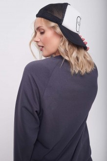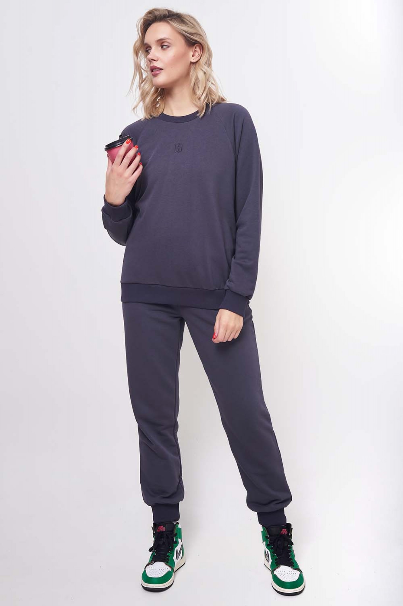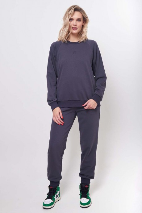 Костюм женский повседневный, спортивного стиля из комфортной ткани (футера), состоящий из свитшота и брюк. Свитшот свободного силуэта (слегка оверсайз), с рукавами покроя реглан с притачной манжетой по низу. Вышивка – логотип в левой части переда в цвет ткани. Рукава длинные с притачной манжетой по низу. Брюки с притачным поясом, резинкой и шнурком внутри. Передняя половинка брюк с боковыми карманами. По низу брюк – притачные манжеты.
