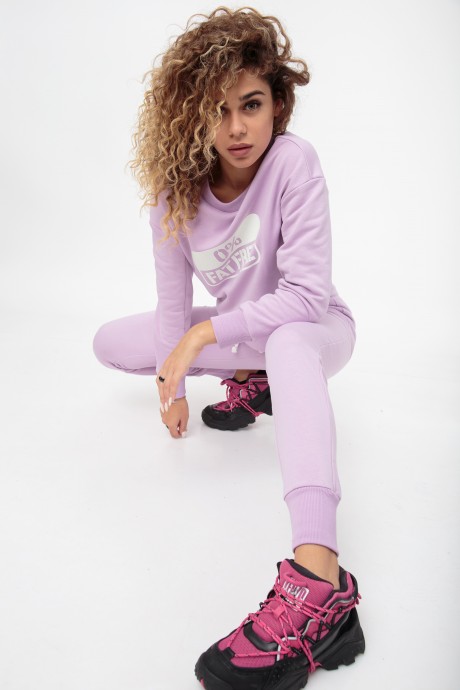 Женский костюм выполнен из хлопкового трикотажа футер 3х-нитка. Чуть укороченный свитшот с приспущенным плечом свободного прилегания. Манжеты и низ, как и низ брюк, на трикотажном довязе кашкорсе. Украшен аппликацией "fat free" светящейся в темноте. Брюки с карманами, пояс на резинке. Длина свитшота по спинке 50 см., длина рукава от горловины 69 см. Длина брюк по боковому шву 102 см., по шаговому шву 81см. Рост модели на фото 173см.