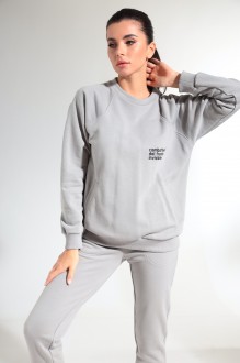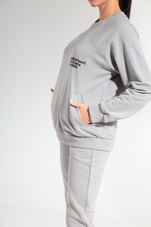 Женский костюм выполнен из хлопкового футера 3х-нитка. Свободного прилегания свитшот с прорезными карманами, украшенный по переду вышивкой. Манжеты и низ на трикотажном довязе кашкорсе в цвет изделия. Брюки с боковыми карманами, пояс на резинке, по низу манжеты на трикотажном довязе кашкорсе. Длина свитшота по спинке 64 (+/-1 см)., длина рукава от горловины 75 (+/-1 см). Длина брюк по боковому шву 102 см., по шаговому шву 81см. Рост модели на фото 171 см.