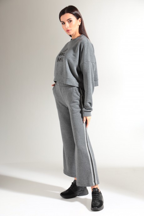 Женский костюм выполнен из хлопкового трикотажа футер 3х-нитка. Укороченный свитшот с приспущенным плечом свободного прилегания, по переду украшен принтом "#girlboss". Манжеты и низ выполнены из основной ткани. Можно комбинировать с удлиненной майкой. Укороченные клешеные брюки с лампасами и карманами, пояс на резинке. Длина свитшота по спинке 44 (+/- 1см), длина рукава от горловины 78 (+/- 1см) . Длина брюк по боковому шву 94 см, по шаговому шву 67 см. Рост модели на фото 171 см.