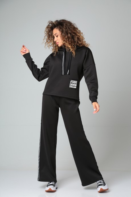 Универсальный стильный женский костюм выполнен из качественного, приятного на ощупь «водолаза». Худи с капюшоном свободного прилегания, плечо приспущено. Манжеты из основной ткани. Уютный большой капюшон с декоративной тесьмой. Клешеные брюки высокой посадки по бокам украшены лампасами. В пояс брюк вставлена резинка. Оба изделия отличаются своей функциональностью и их можно с легкостью комбинировать с различными вещами и обувью Вашего гардероба. Длина брюк по боковому шву с манжетой 108 (+-1 см), по внутренней стороне 80 (+/-1 см). Длина худи по спинке 55 (+-1 см), длина рукава от горловины 71 (+-1 см). Рост модели на фото 171 см.