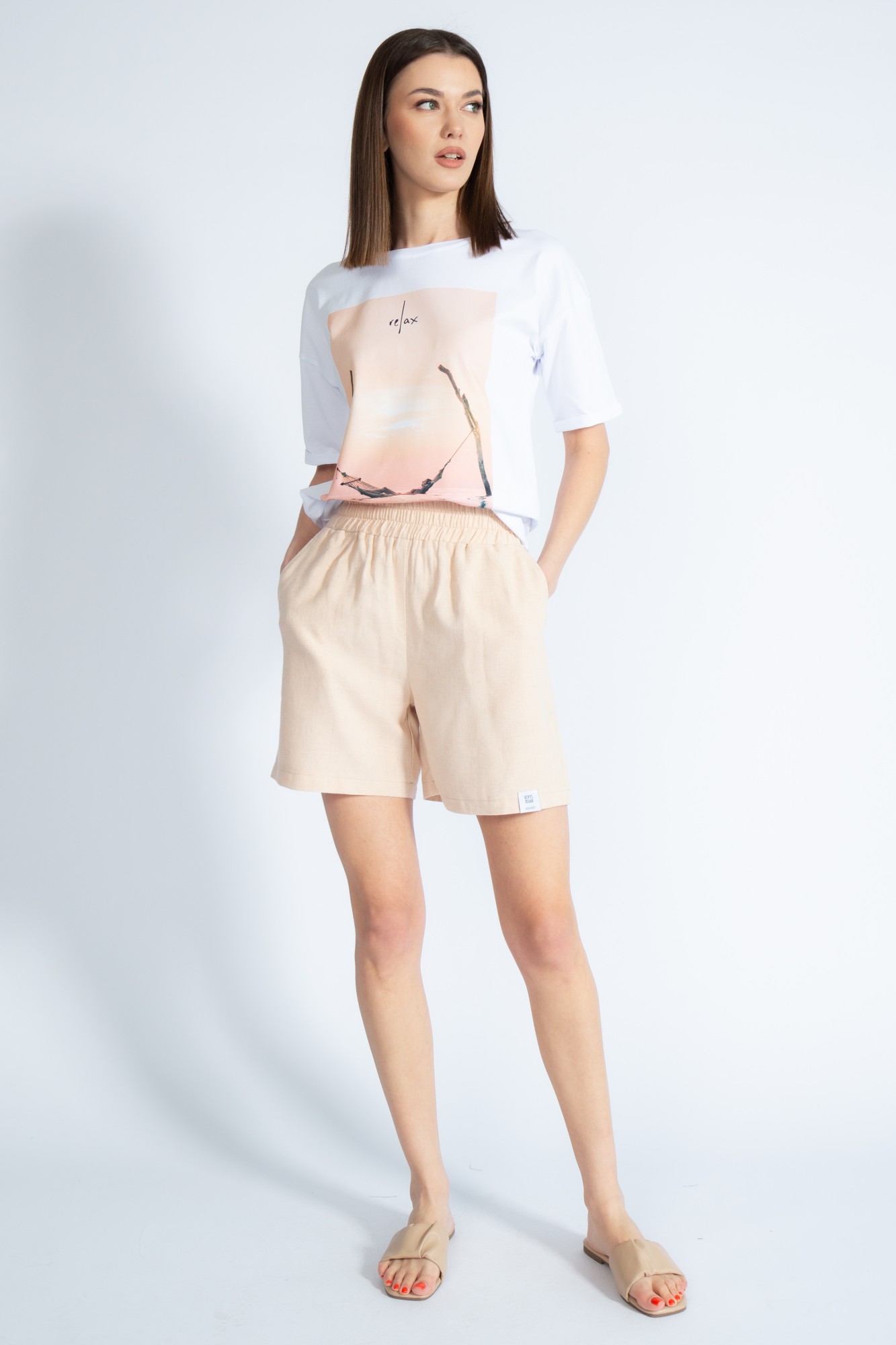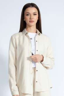 Костюм. Рубашка лен полуприлегающего силуэта с втачными рукавами, удлиненная по спинке. Обработка низа рубашки в форме овала. Шорты лен свободного кроя. Карманы в боковых швах.