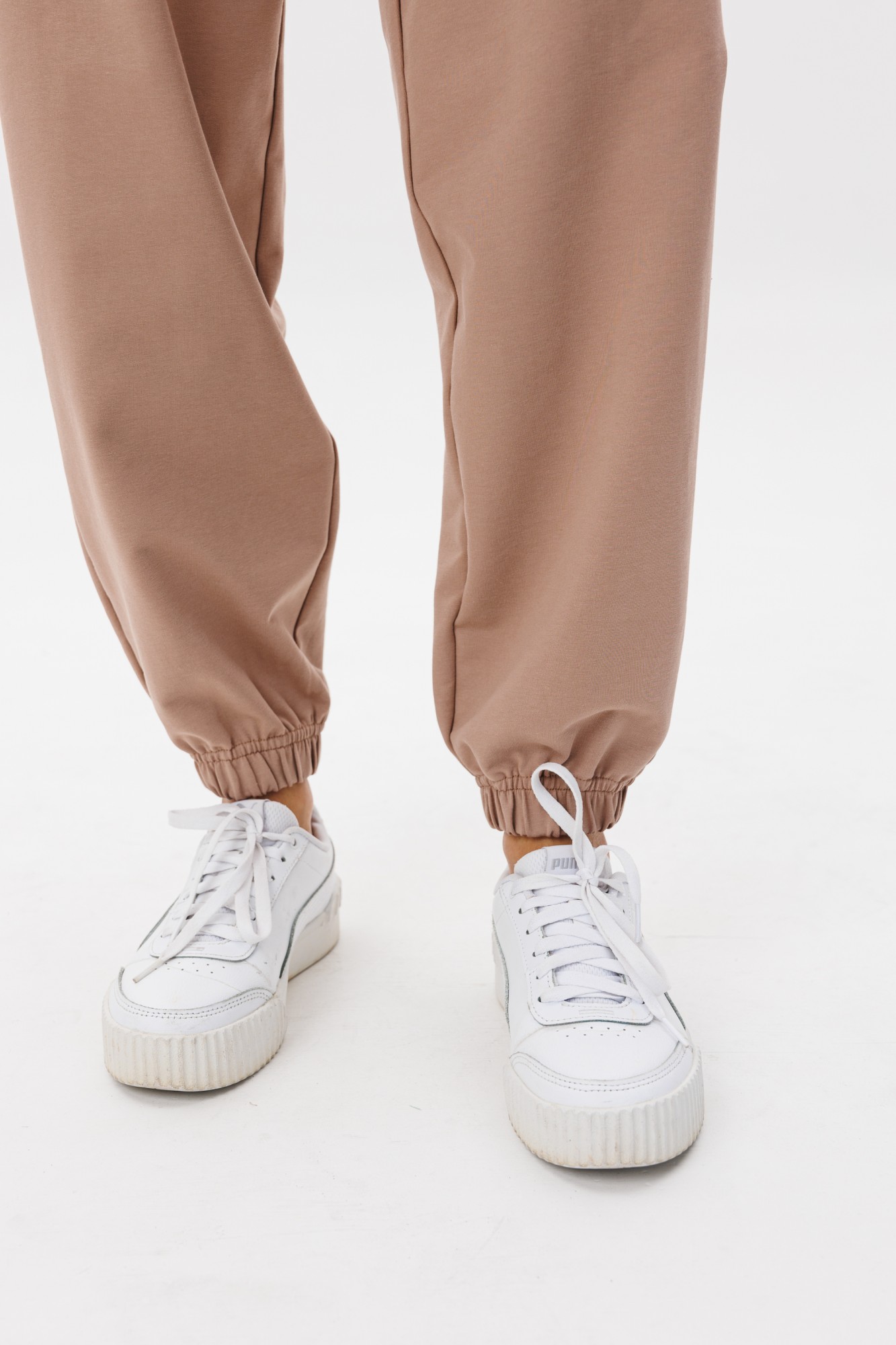 Брюки прямого свободного кроя не сковывают движения и позволяют чувствовать себя комфортно на протяжении всего дня. Пояс на резинке и резинка на брючинах гарантируют идеальную посадку на любой тип фигуры.